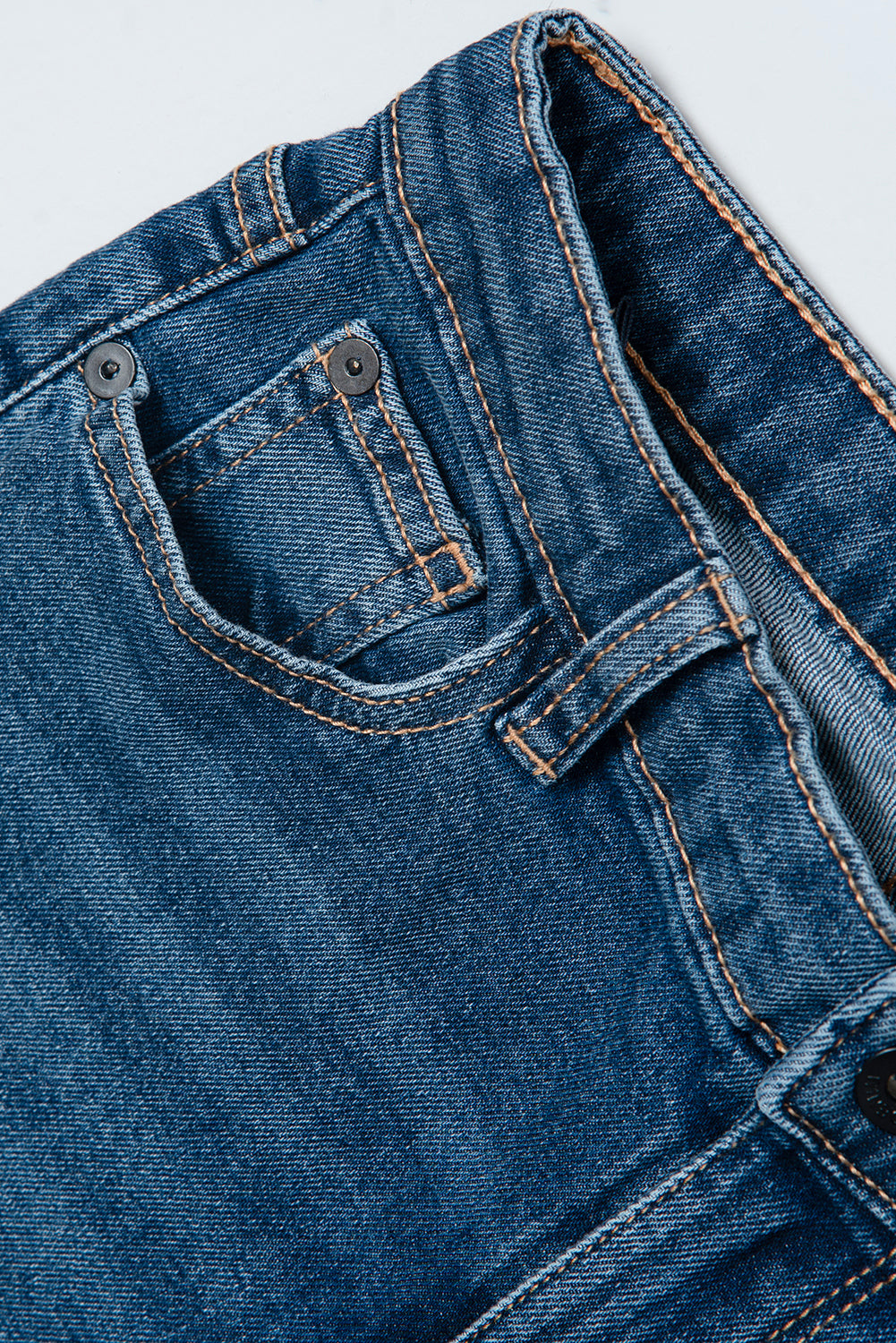 • Traditional five-pocket styling with contrasting golden-brown stitching.