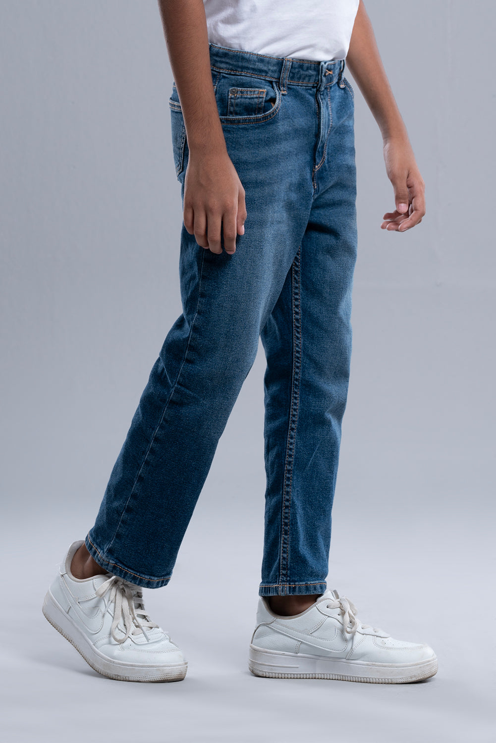 • This is a pair of classic boys' straight-fit jeans in a medium-blue wash.