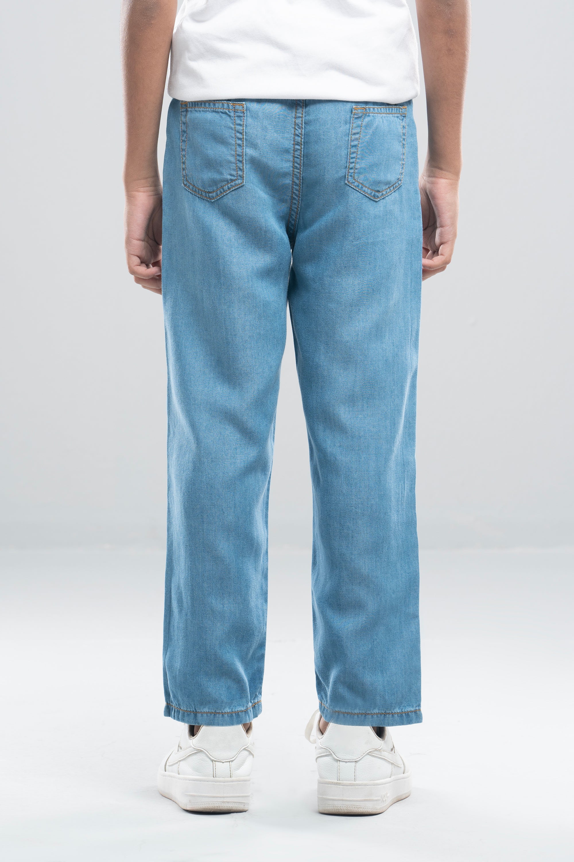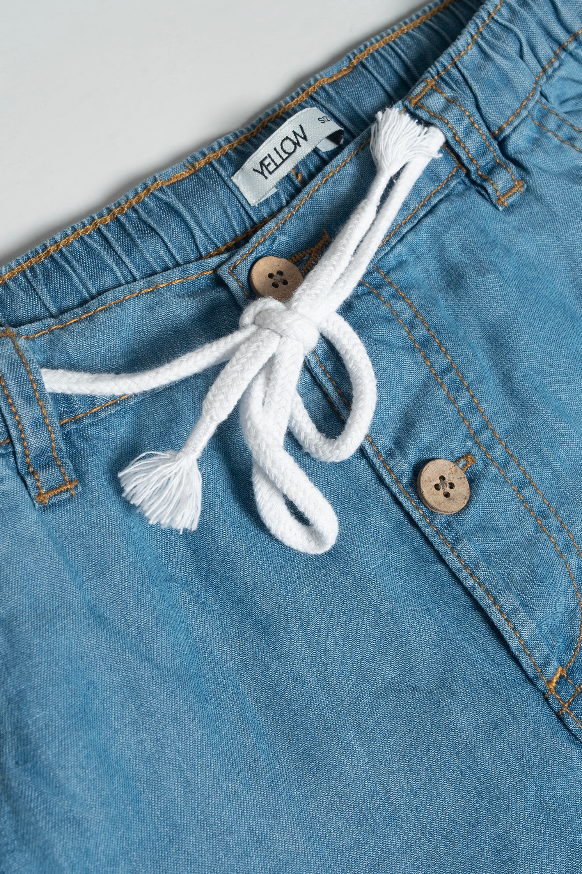 Relaxed fit denim with an elastic waistband, button fastening and adjustable drawstring at the front. Front pockets and patch pockets on the back.