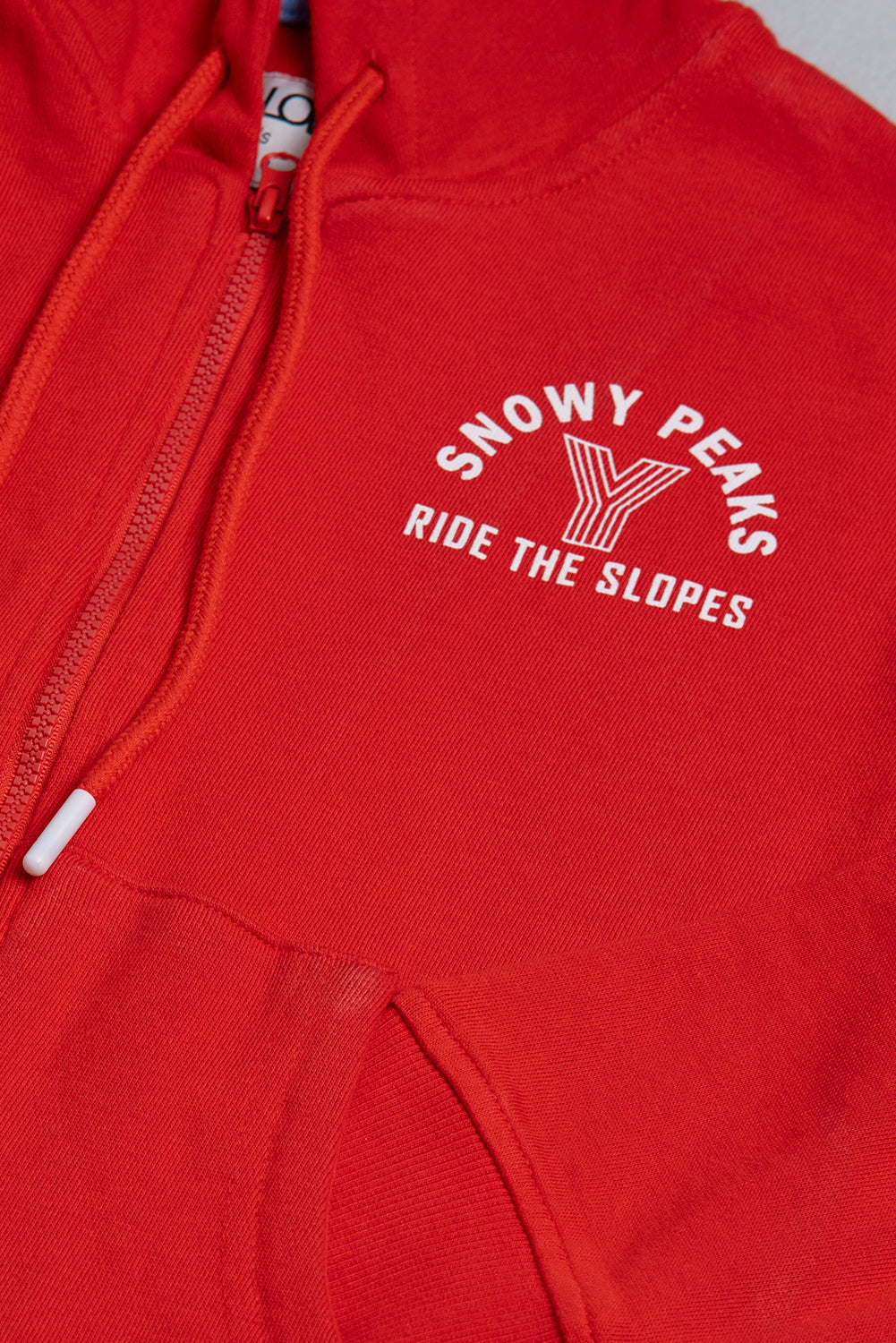 • A distinctive white graphic print on the chest reads "SNOWY PEAKS RIDE THE SLOPES."