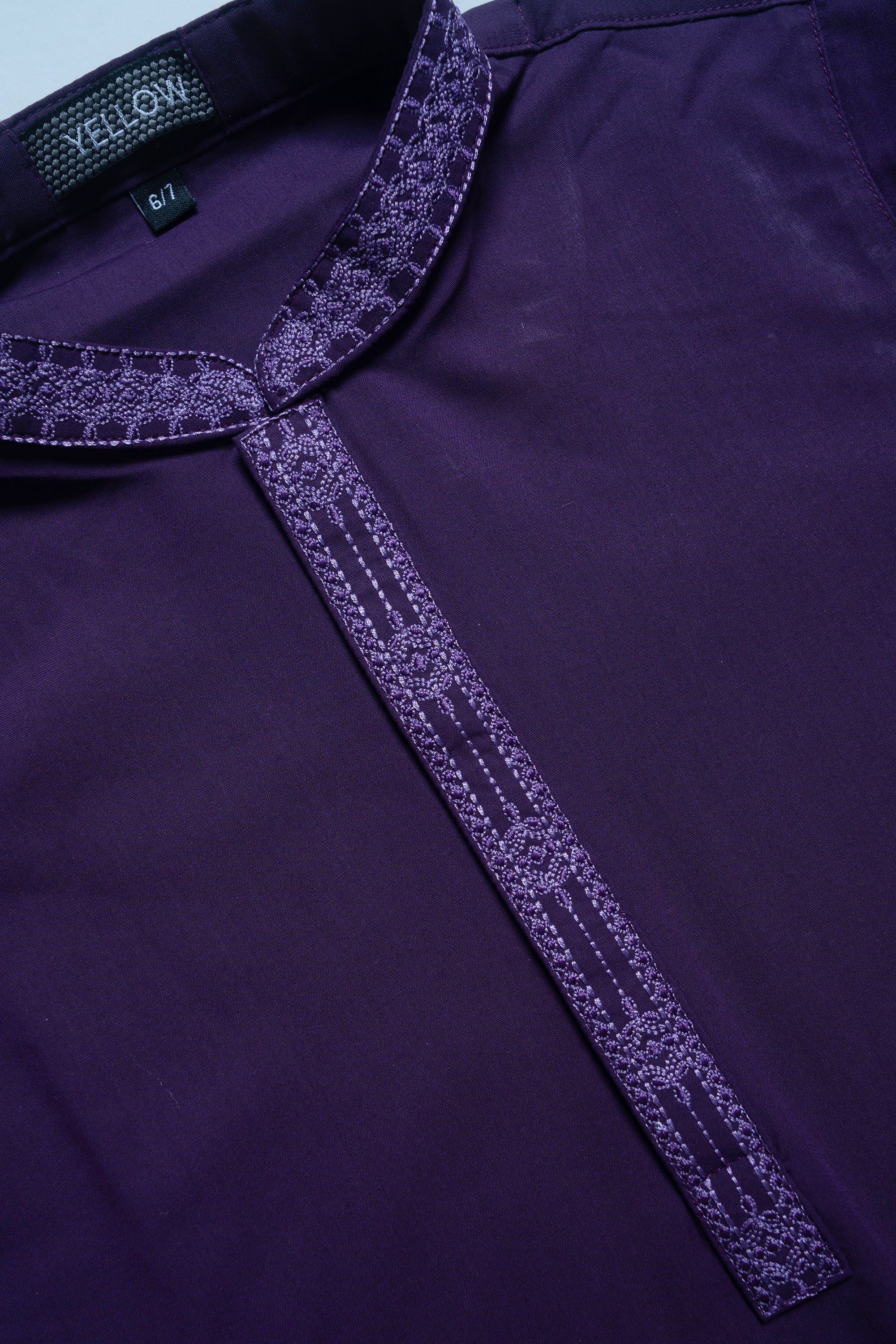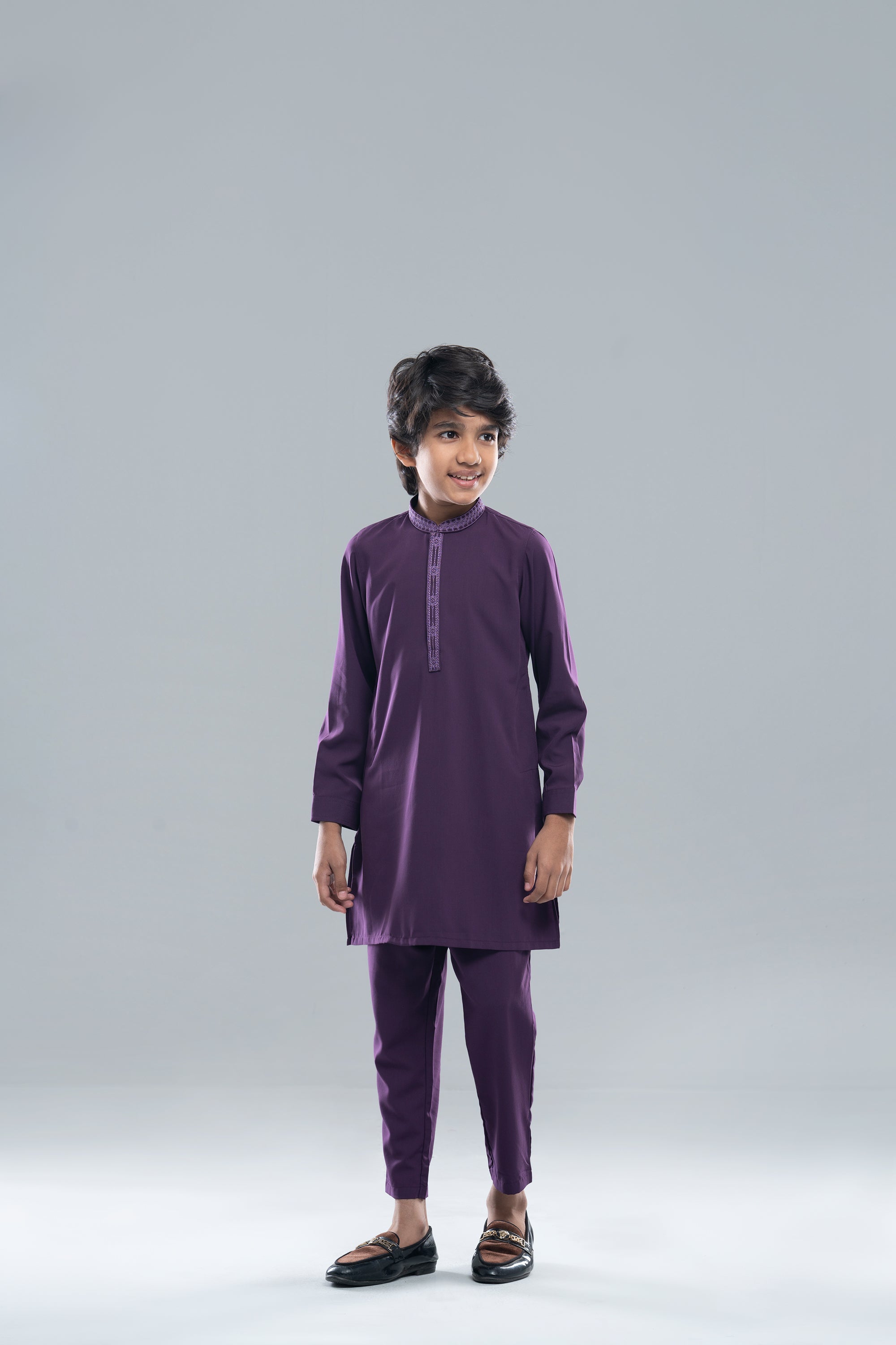 Comfortable Blended fabric boy's kabli set with embroidery on collar and front placket.