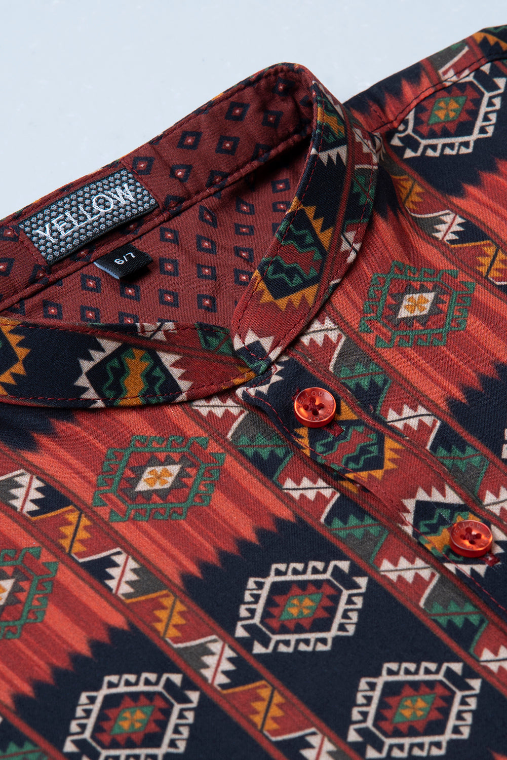 • Contrast printed fabric on inner collar band, inner placket and back moon.
