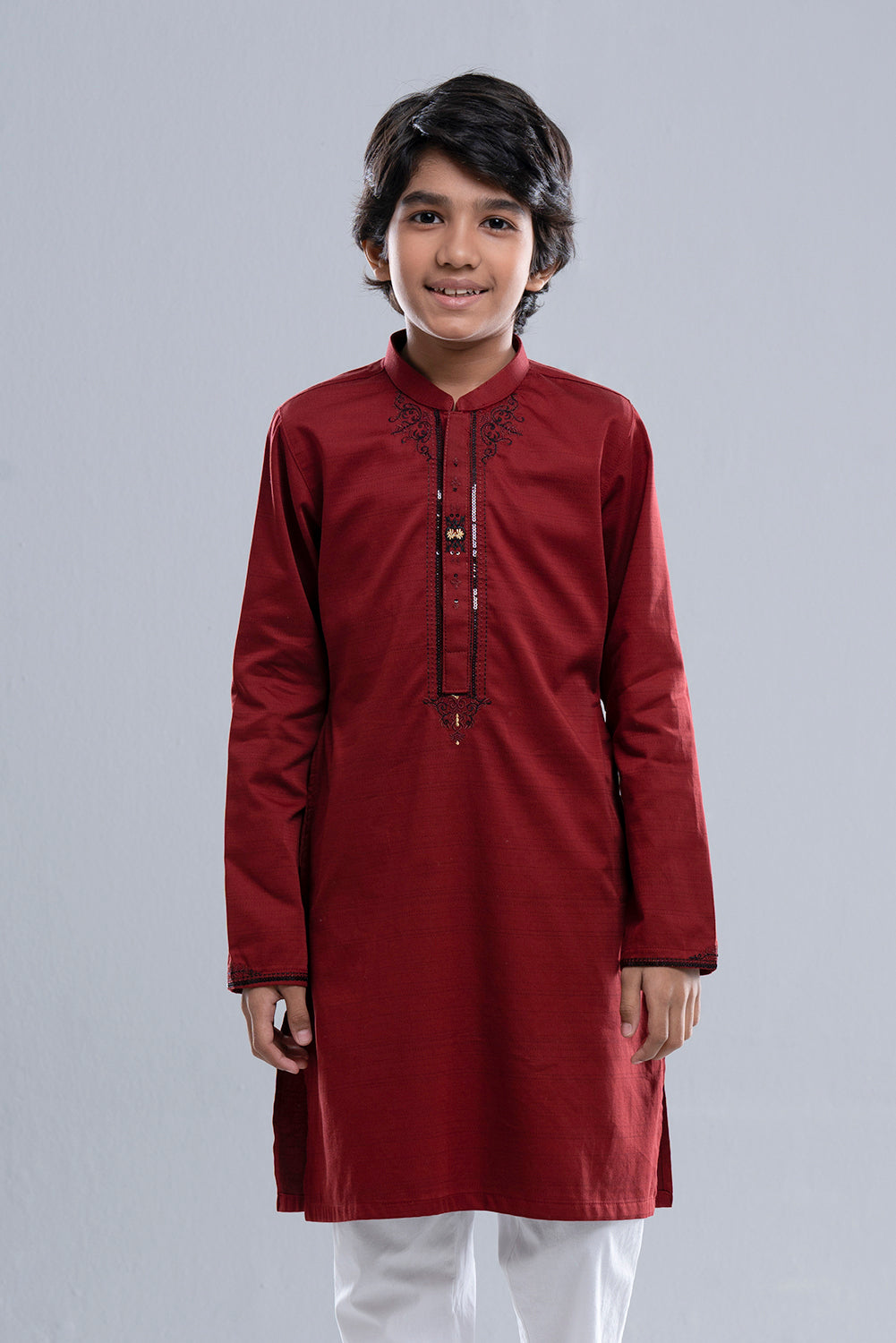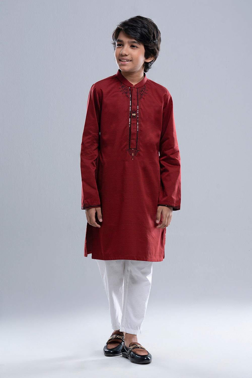 • Embroidery on collar ,neck hidden placket and sleeve opening.