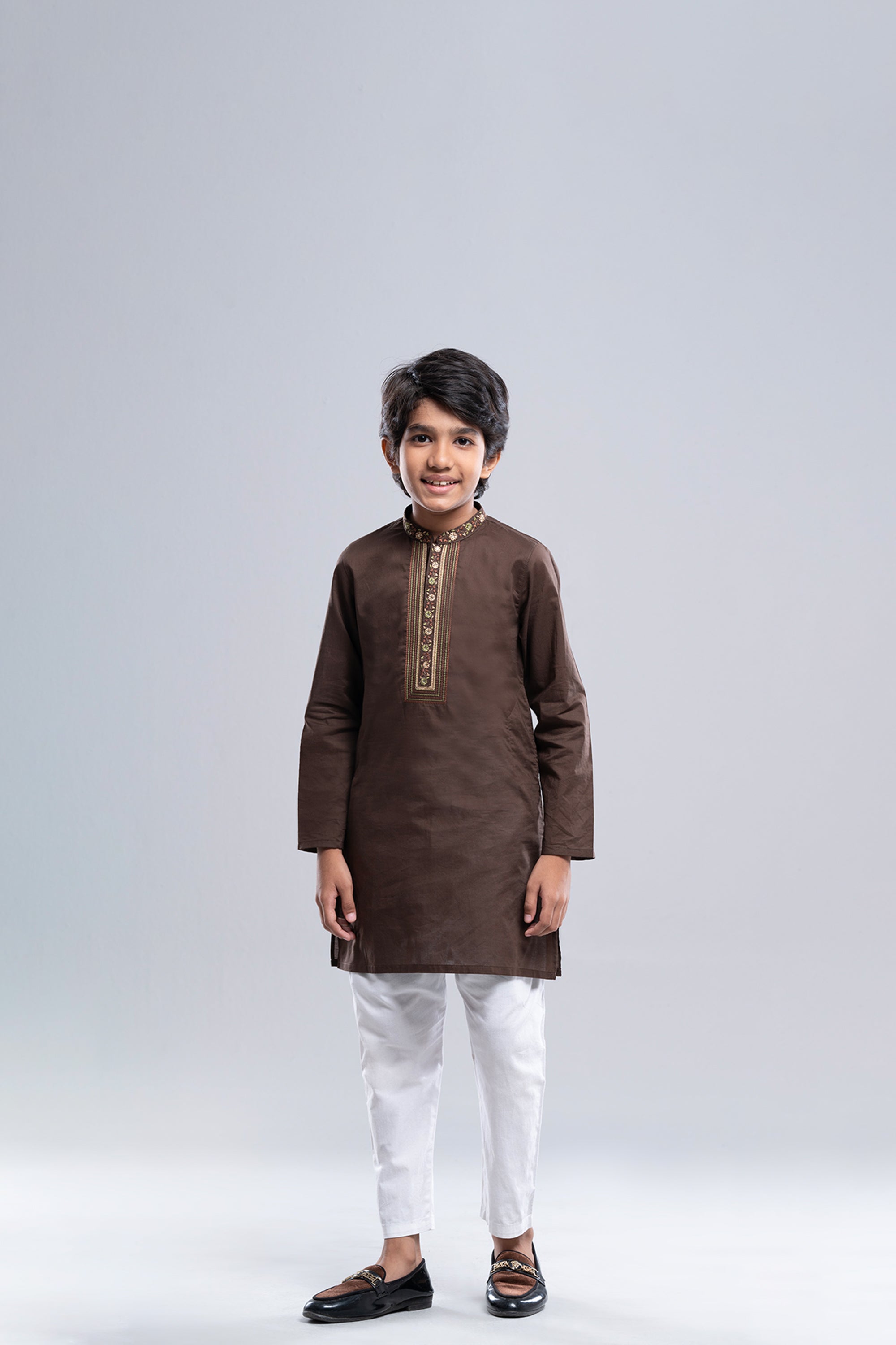 100% cotton boy's panjabi with embroidery on collar front placket and neck around.