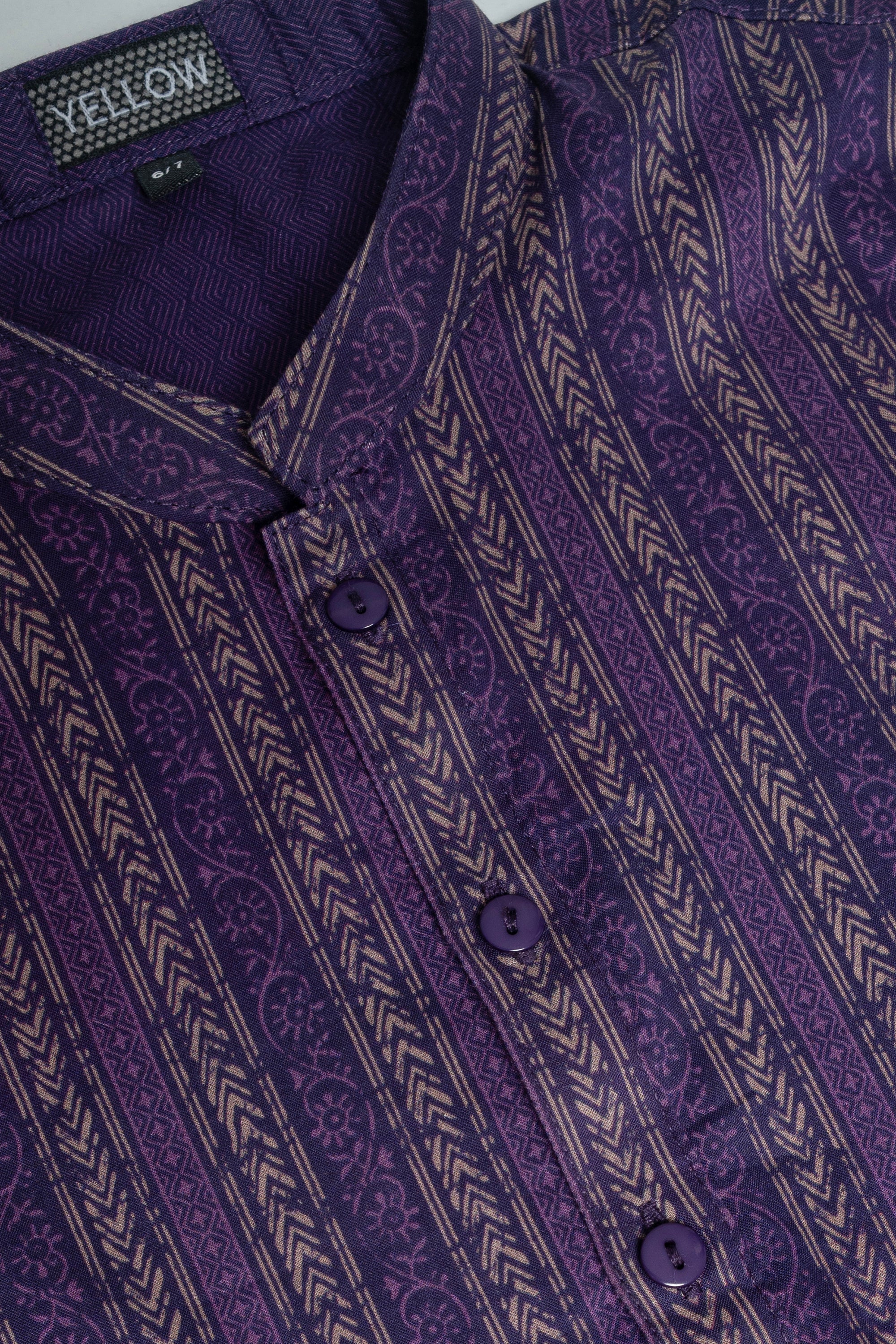 A regular-fit boy's Panjabi crafted from 100% cotton fabric, featuring an elegant allover print with contrast inside band, placket and moon patch, offers a stylish and comfortable daily wear look. Perfect for a blend of tradition and modern elegance.
