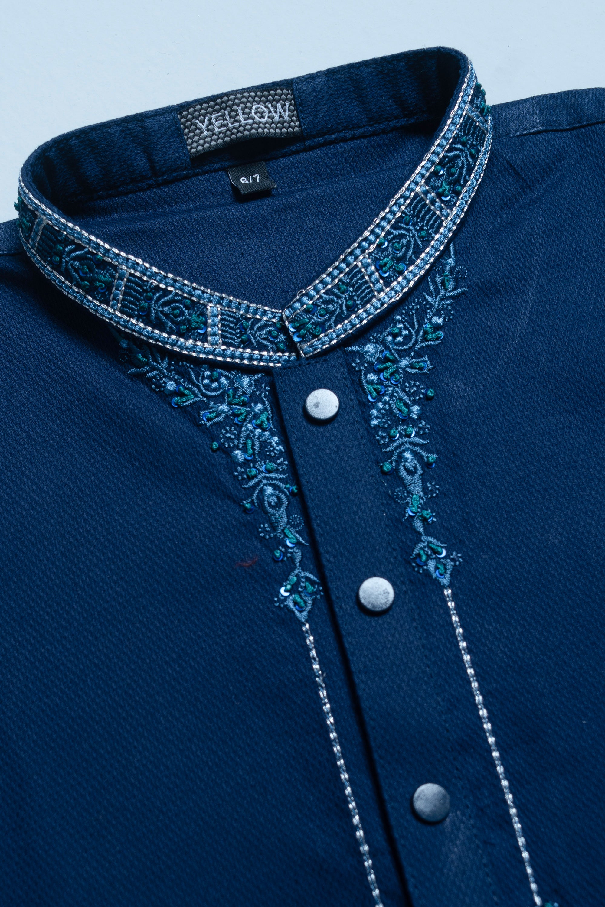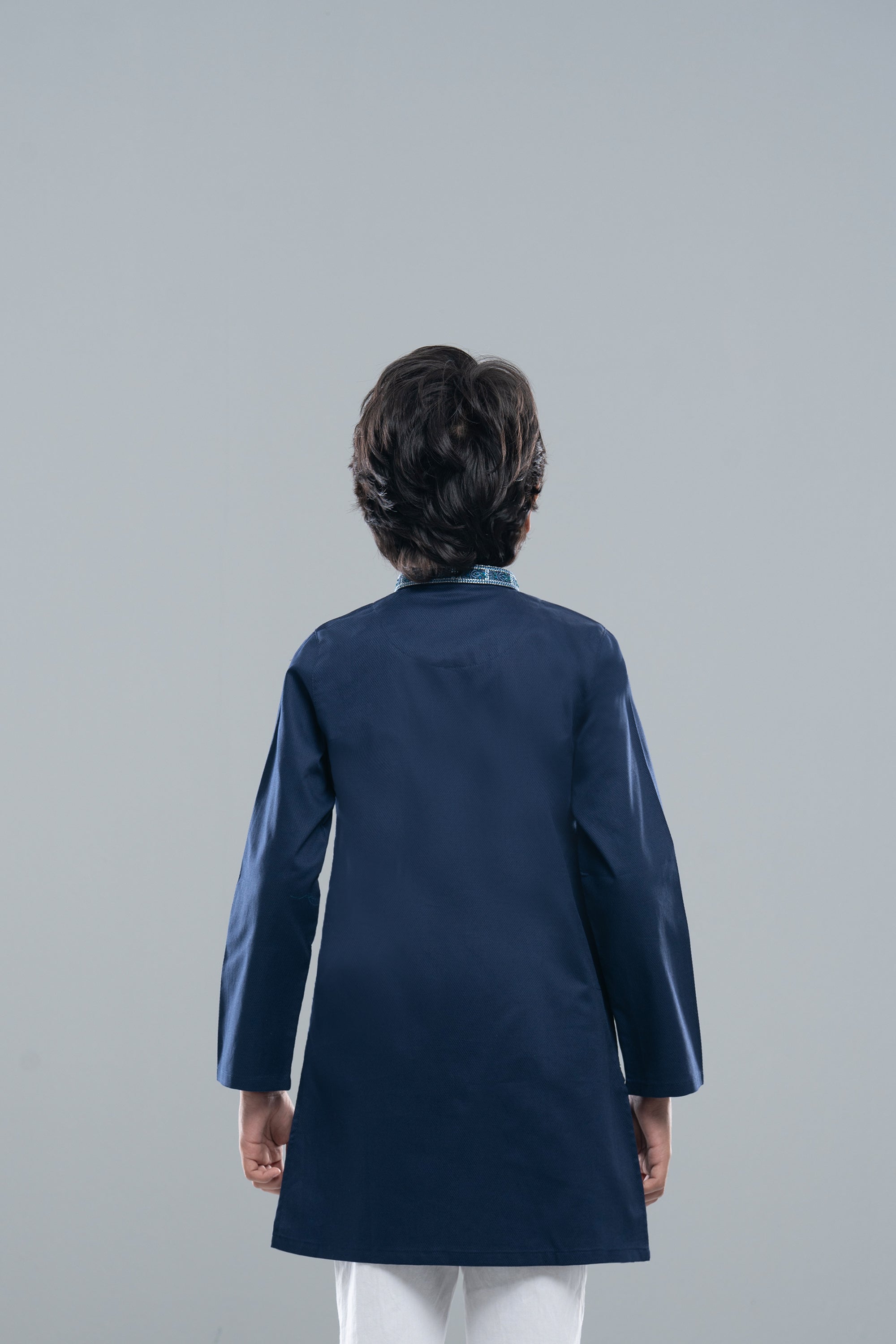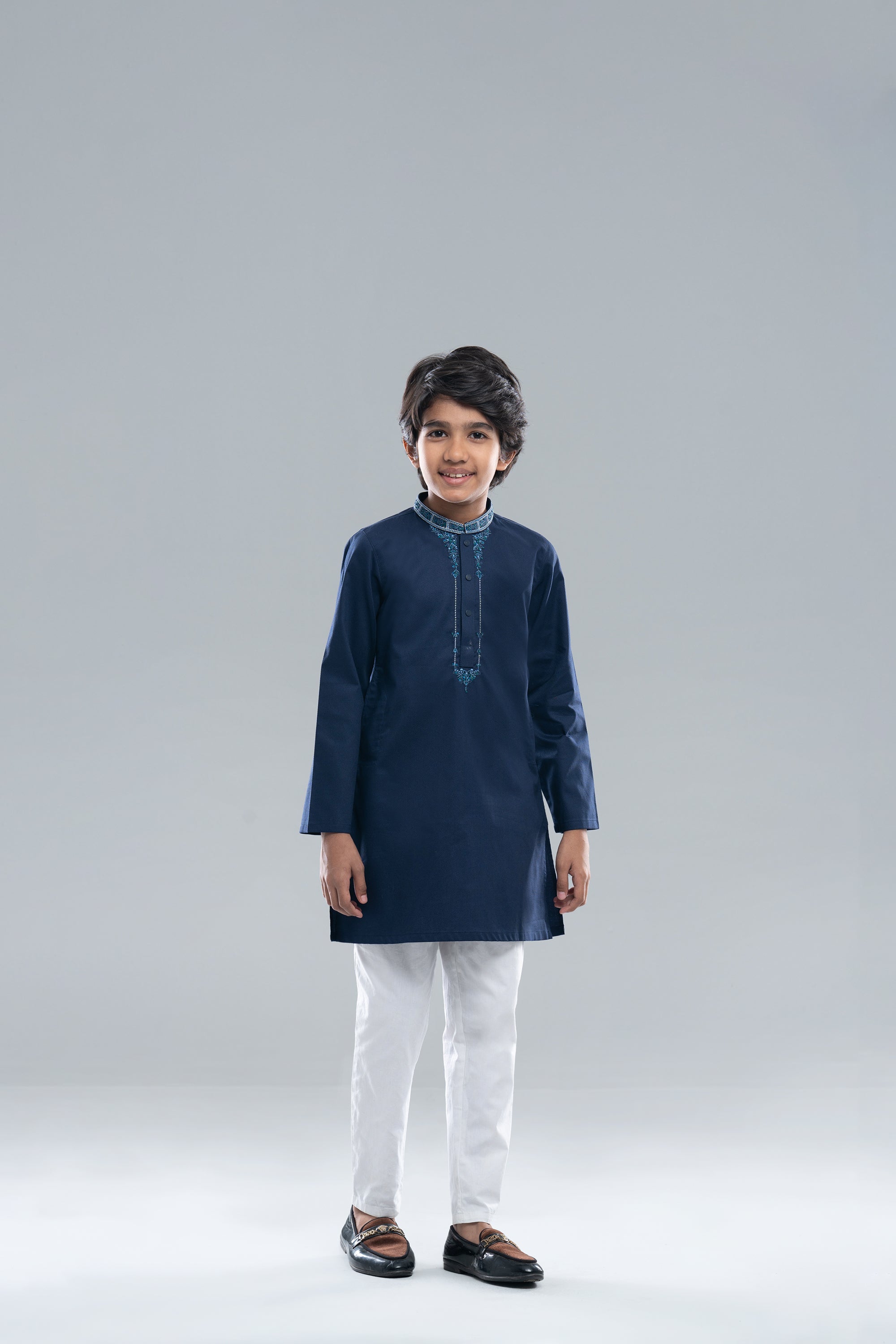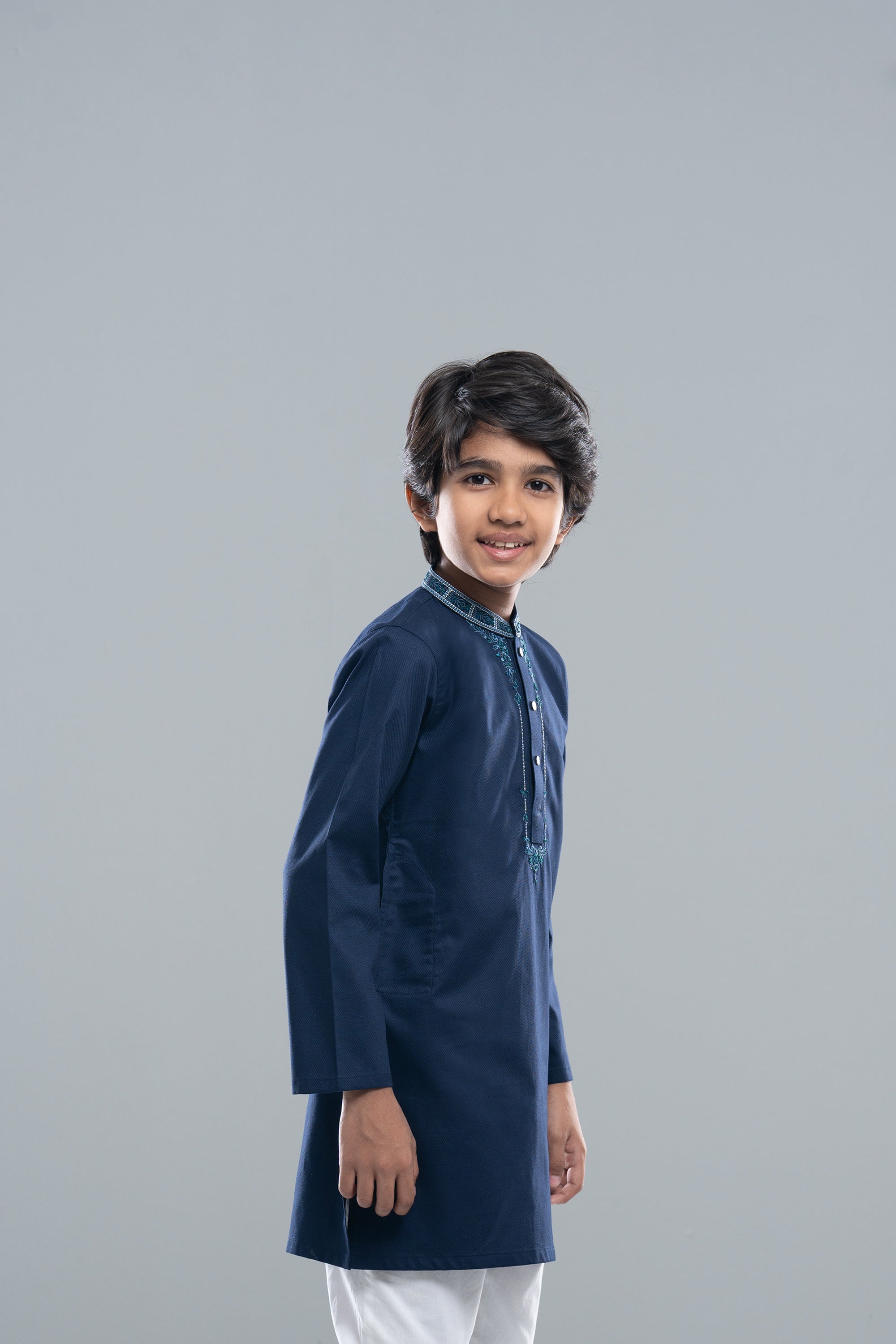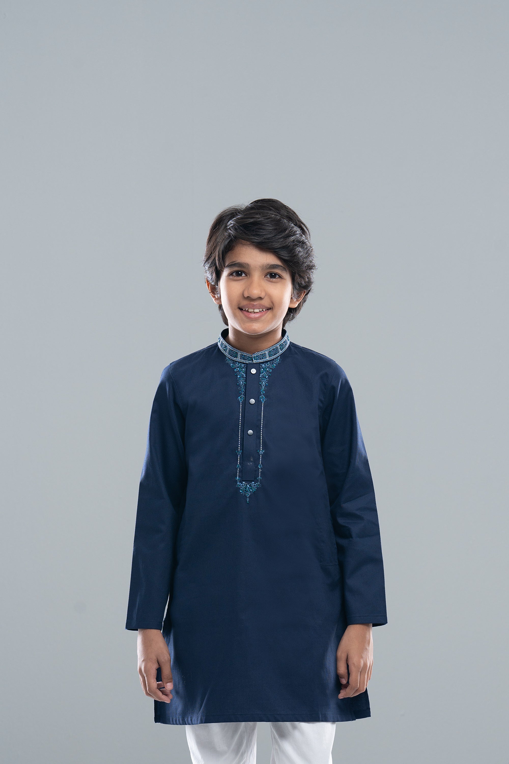 Cotton dobby boy's panjabi with embroidery on collar and neck. The hand emblishment make it exclusive.