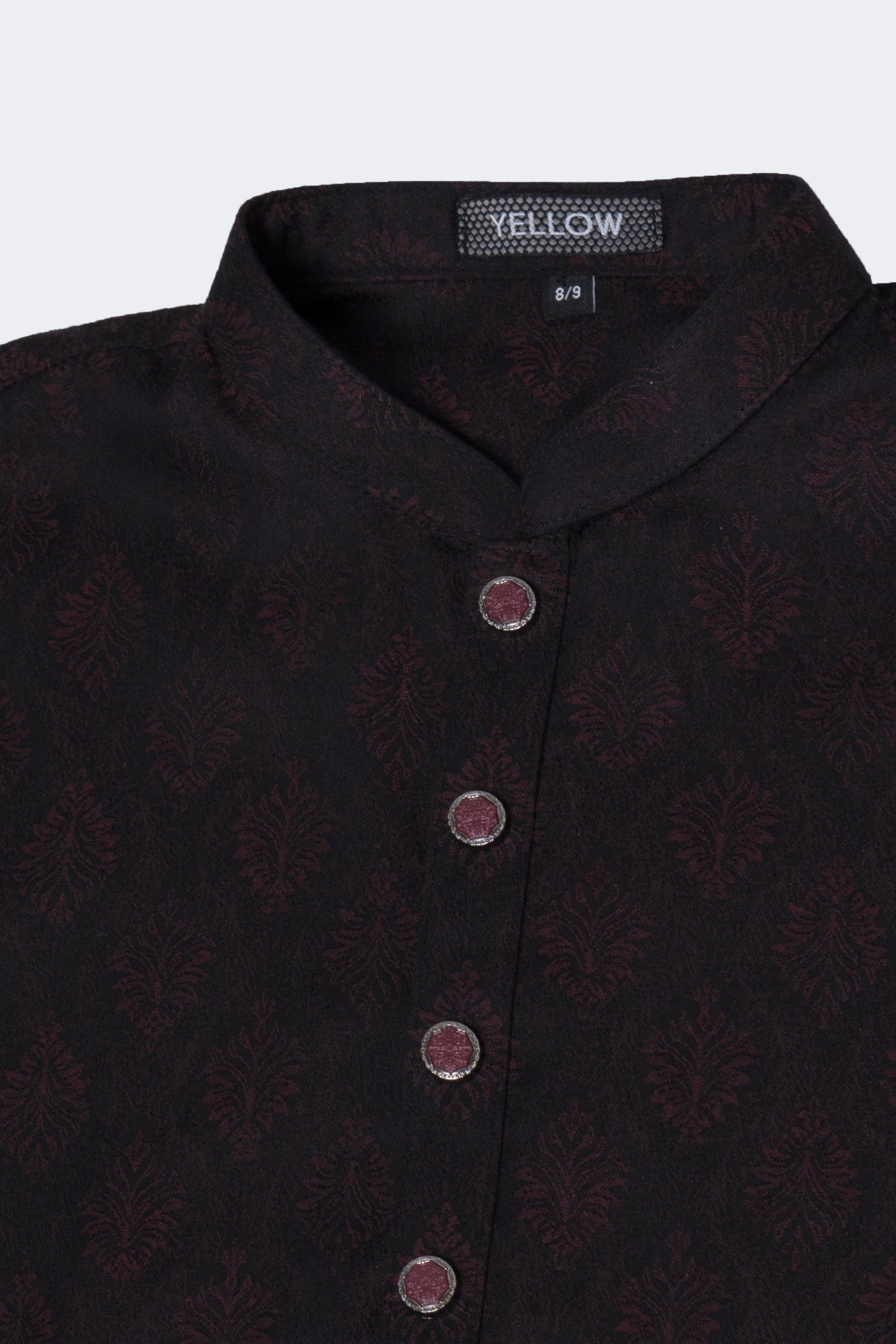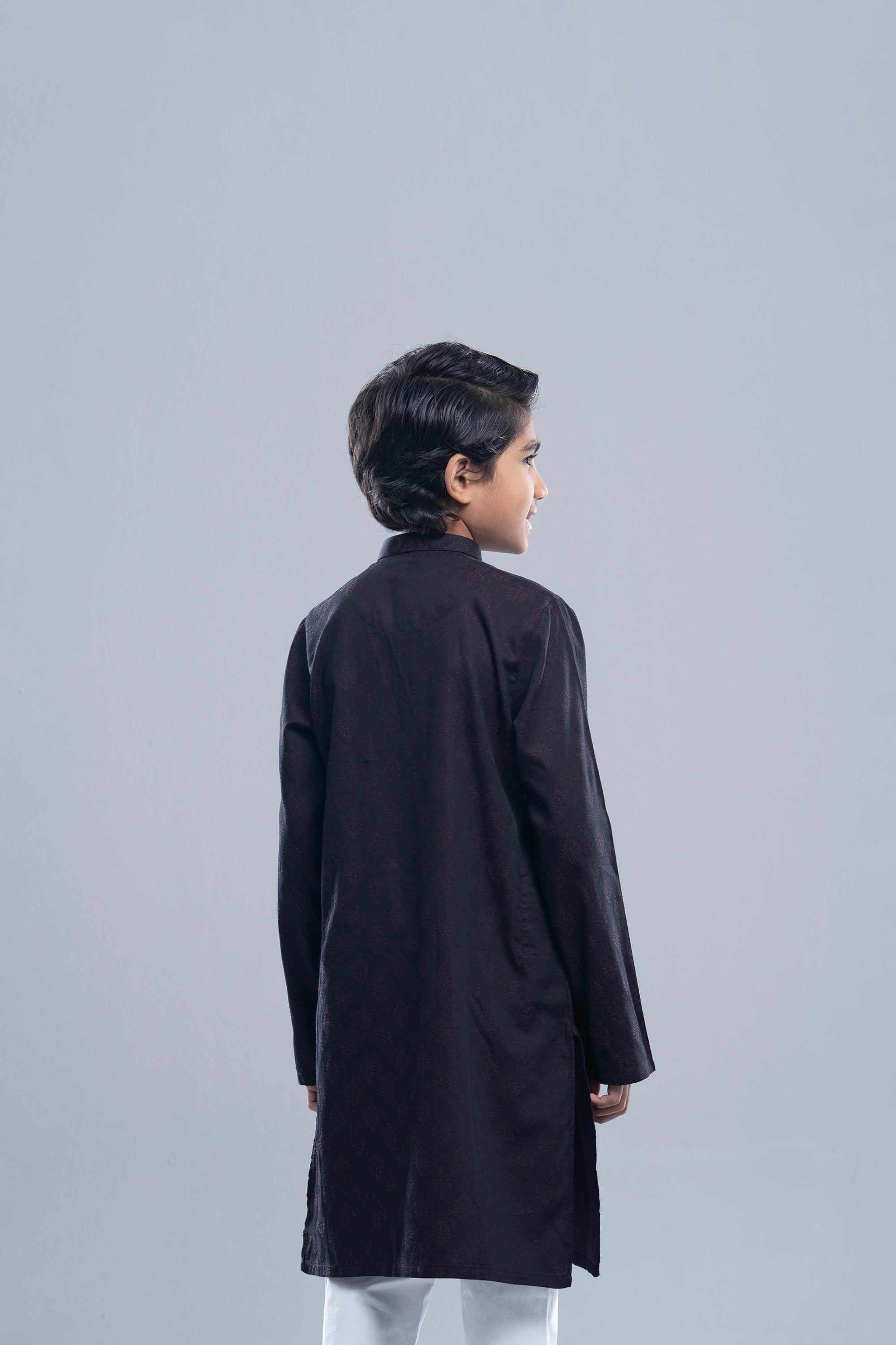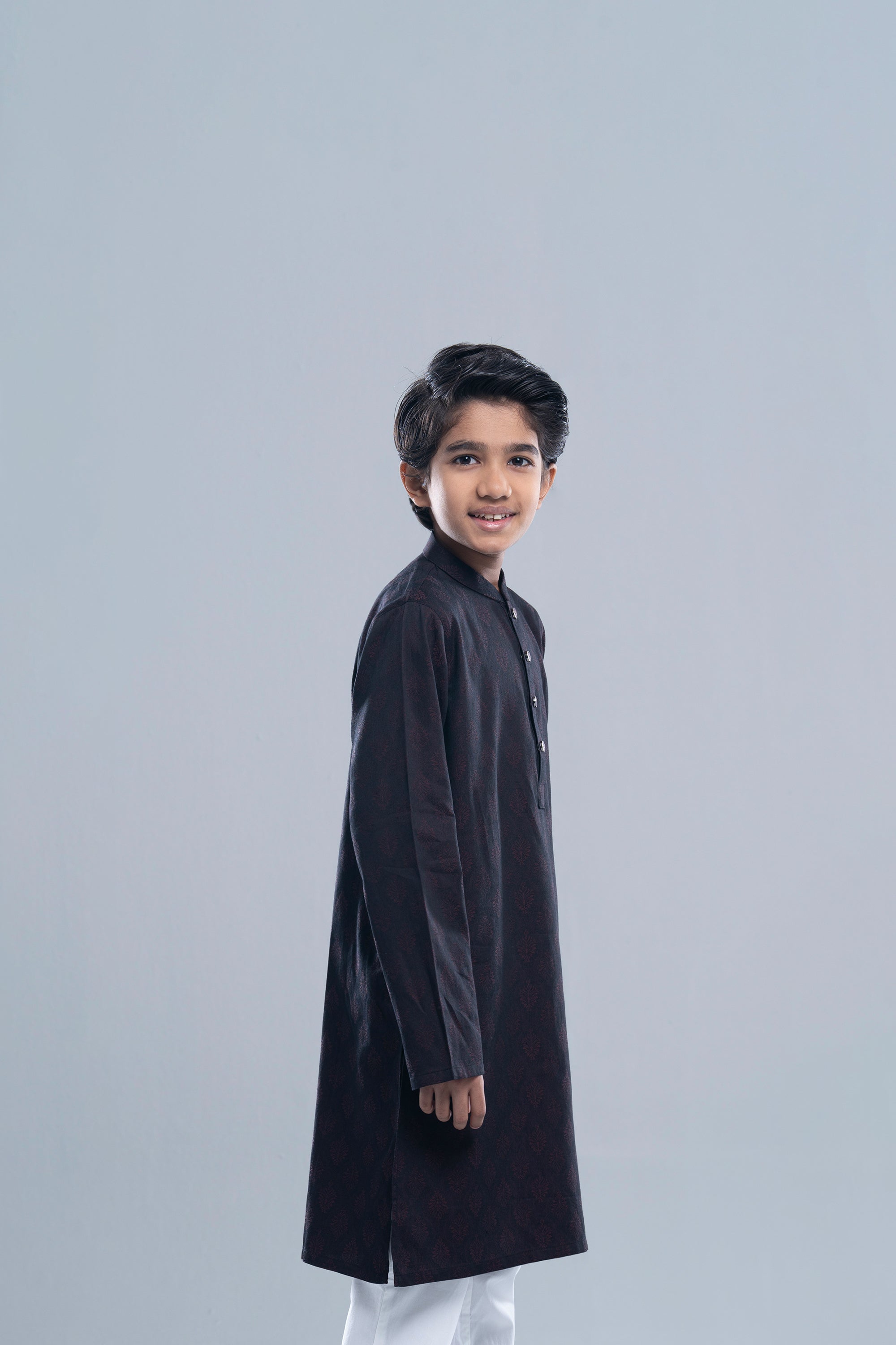 A regular fit boy's Panjabi crafted from 100% cotton jacquard breathable fabric, featuring elegant snap buttons, offers a stylish yet comfortable semi-formal look. Perfect for effortless elegance and all-day ease.