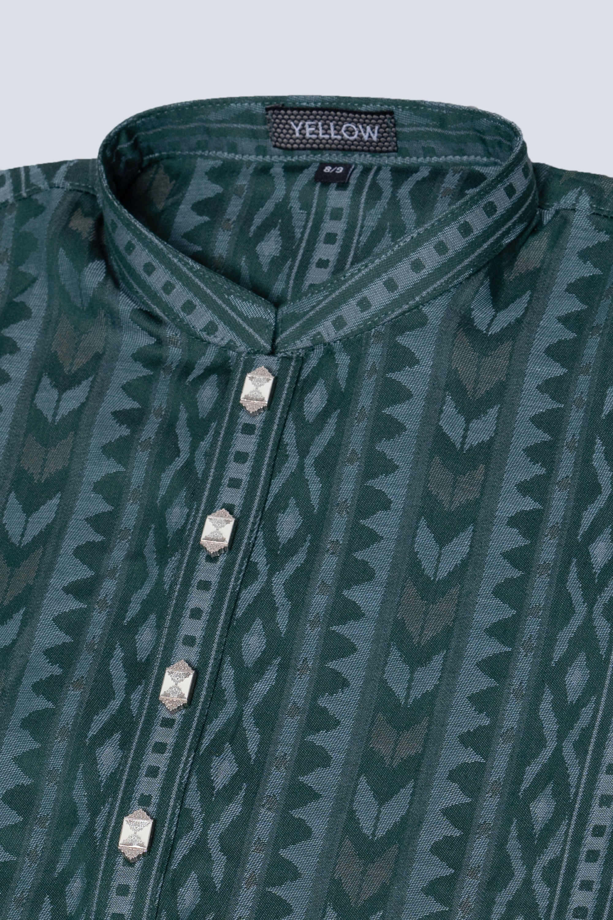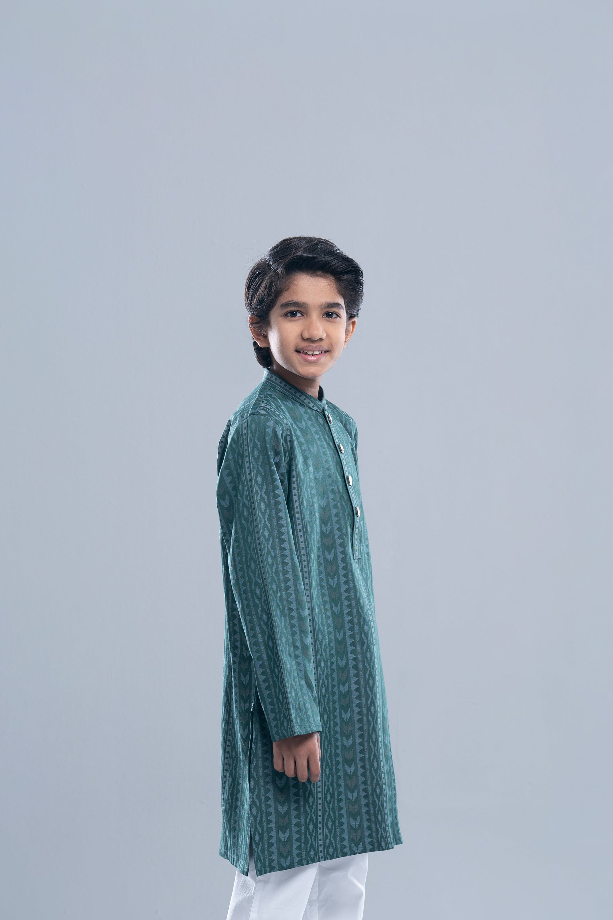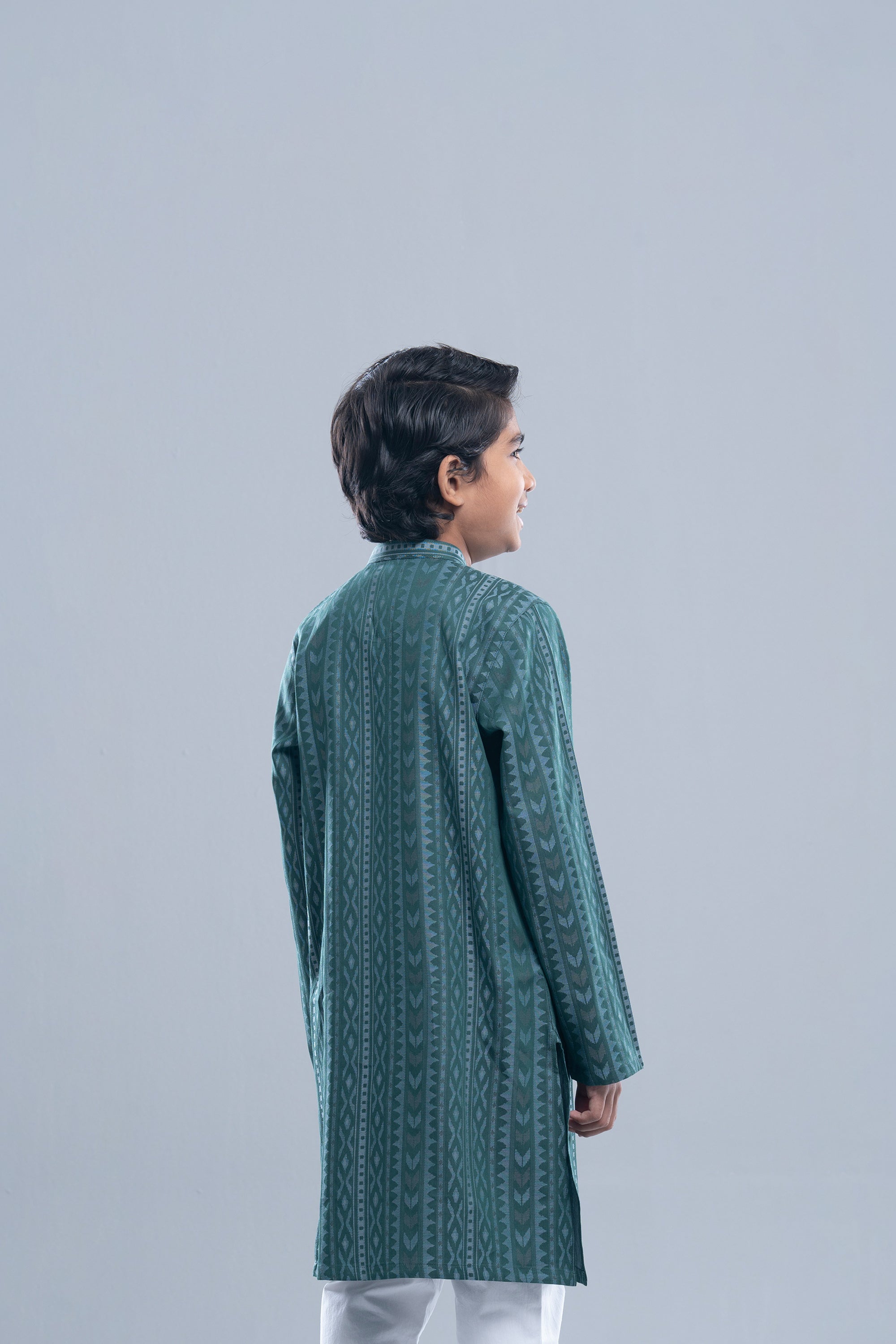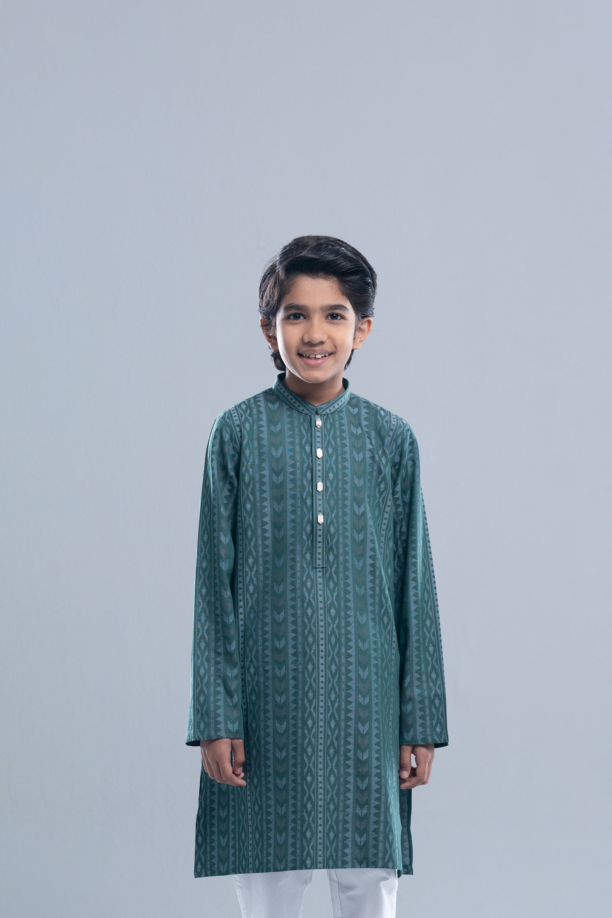 A regular fit boy's Panjabi crafted from 100% cotton jacquard breathable fabric, featuring elegant snap buttons, offers a stylish yet comfortable semi-formal look. Perfect for effortless elegance and all-day ease.