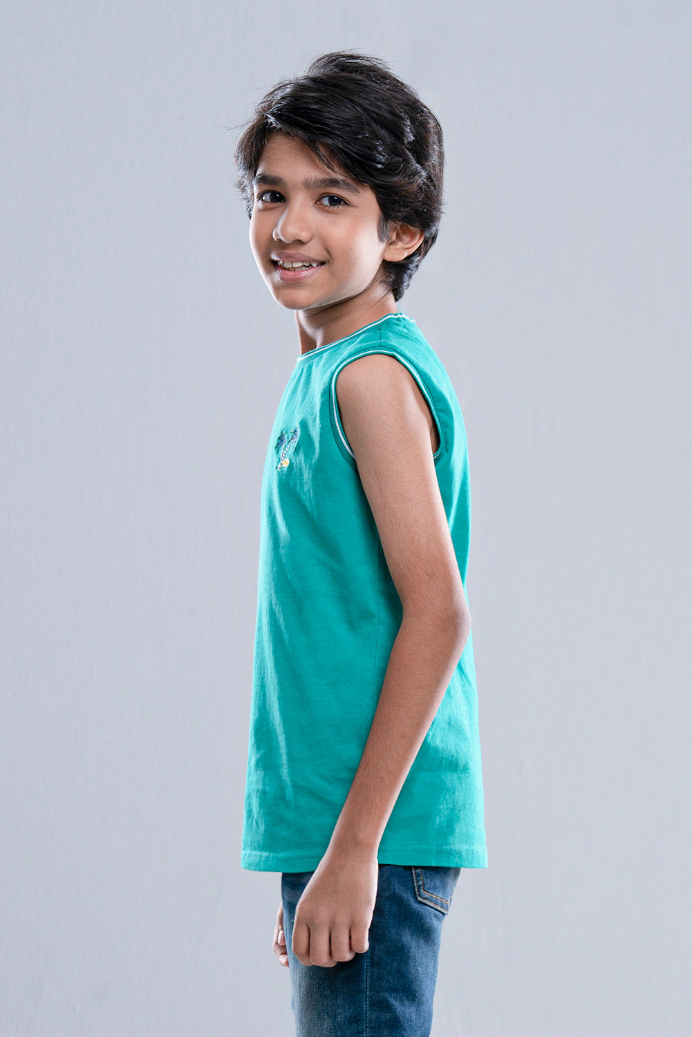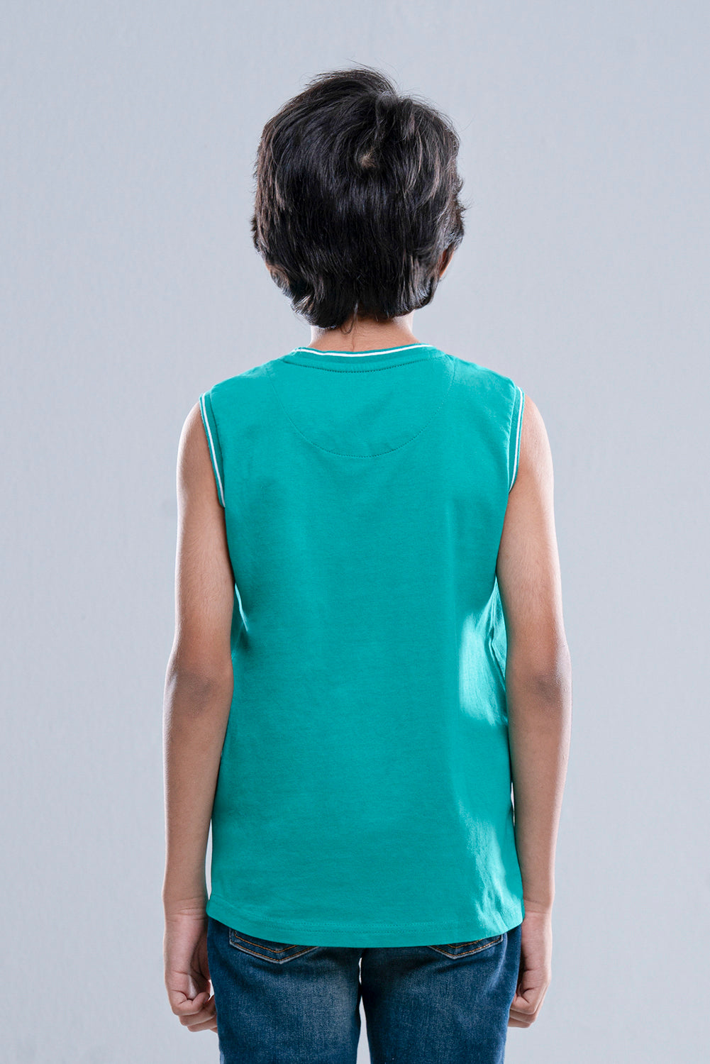 • A sleeveless green sando with white-trimmed edges around the neck and armholes