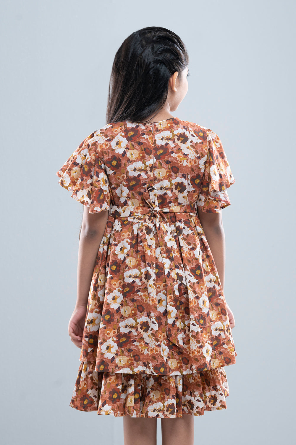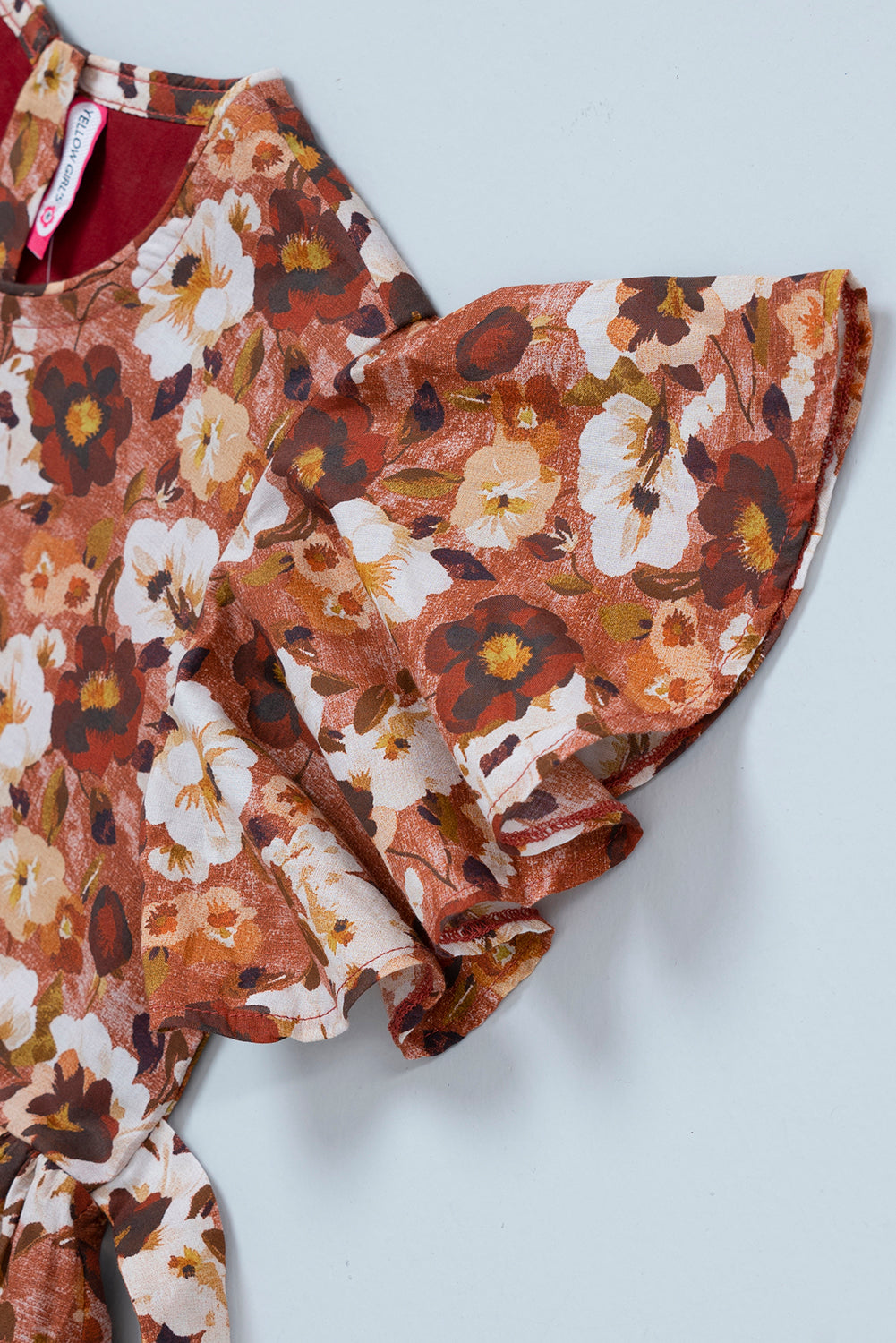 This charming dress features an all-over floral print with a warm color palette, perfect for fall season. The flutter sleeves and tiered ruffle hem add a playful and girly flair. Made from lightweight, breathable cotton fabric