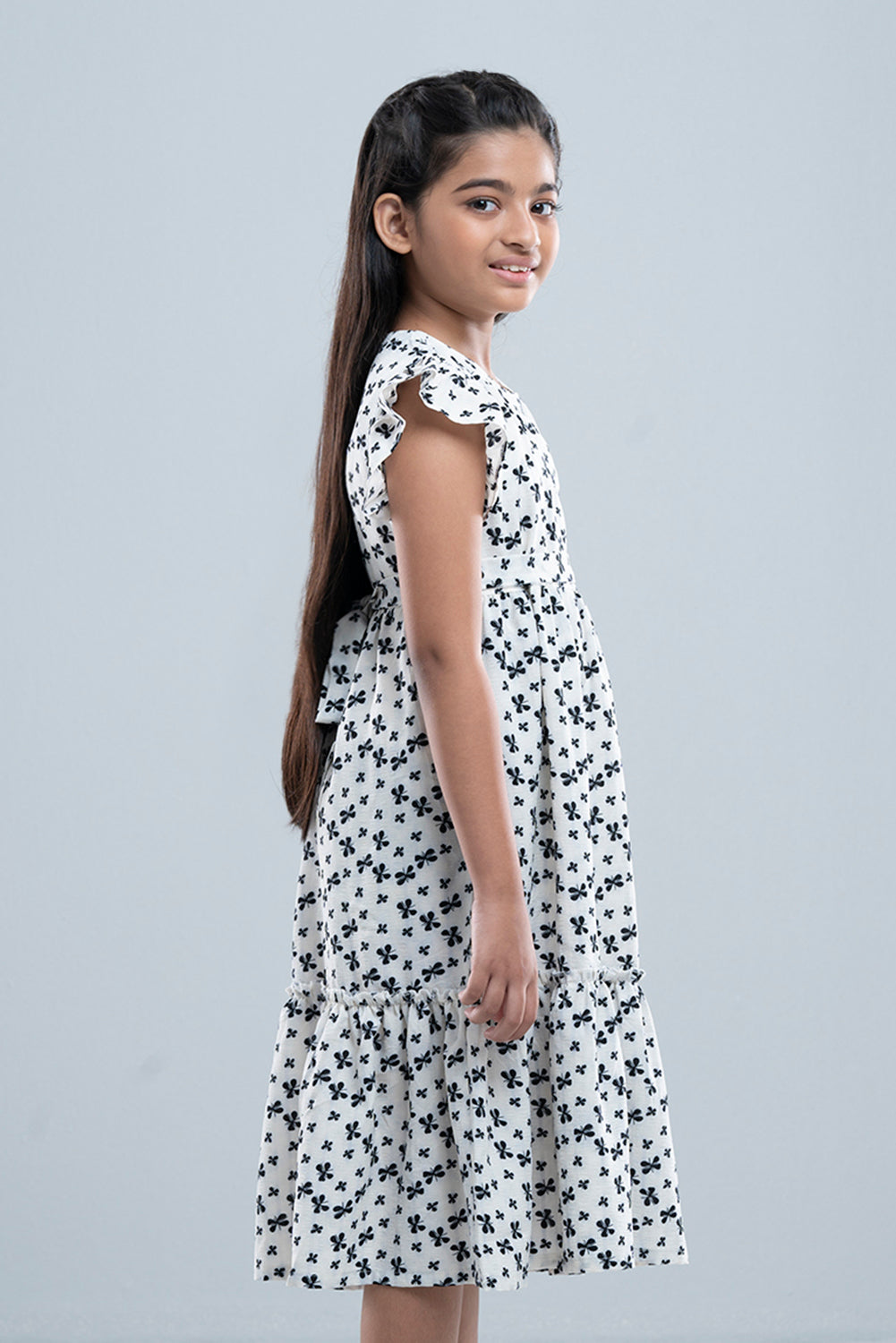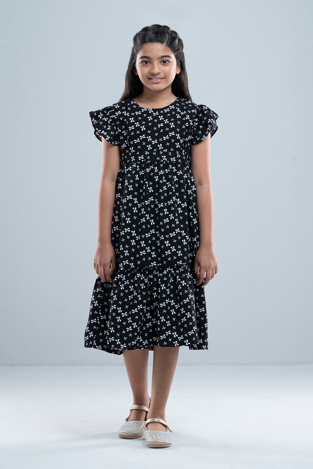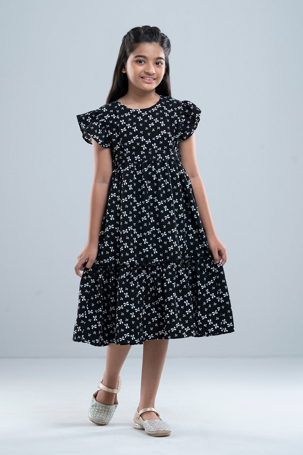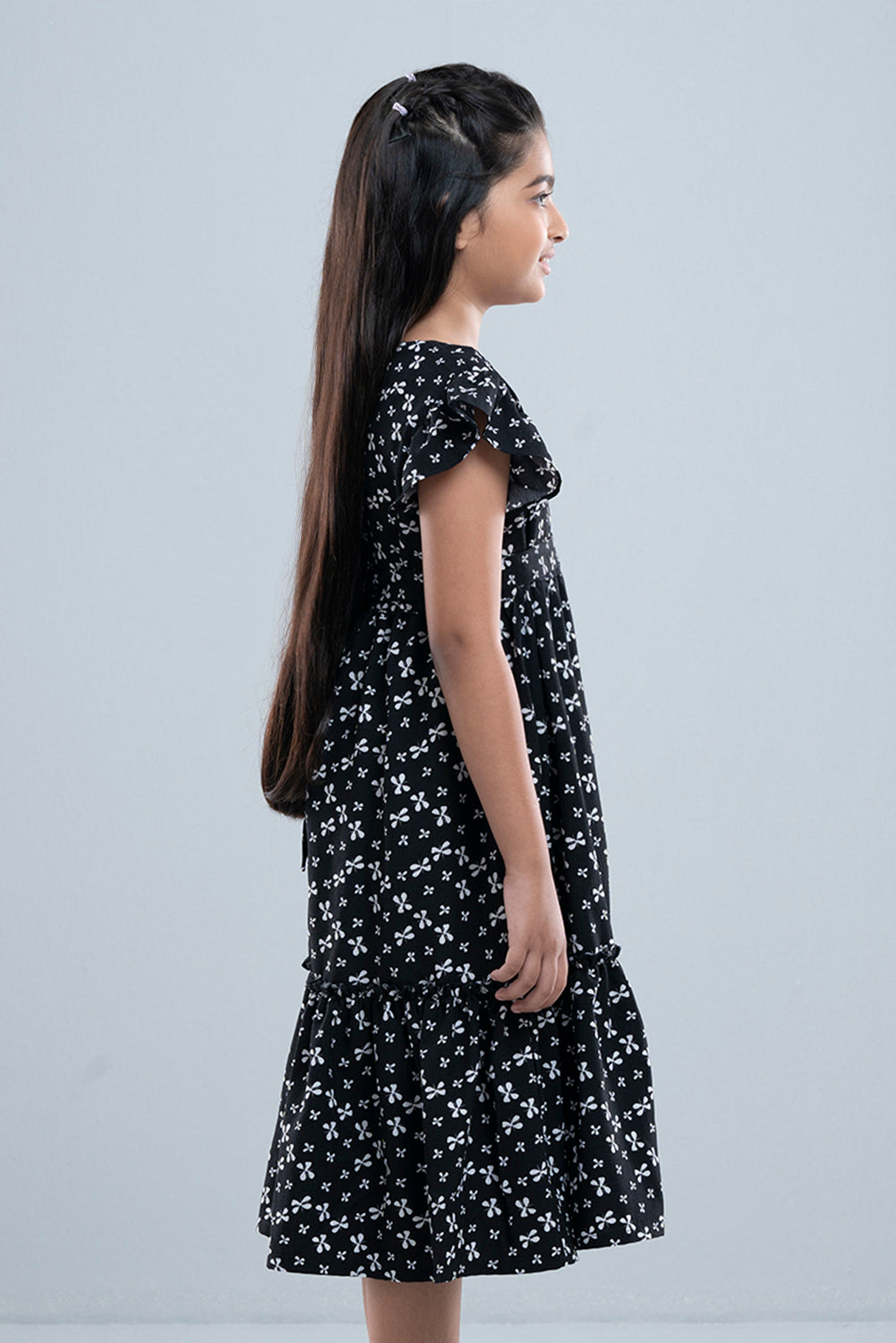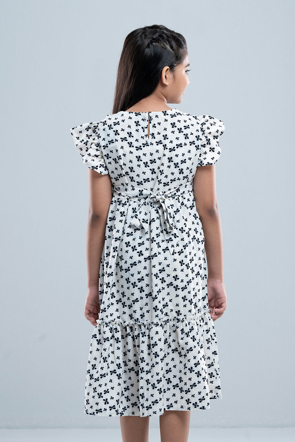 Stylish knee-length dress adorned with all-over print, featuring flutter sleeves for a playful and girly look.