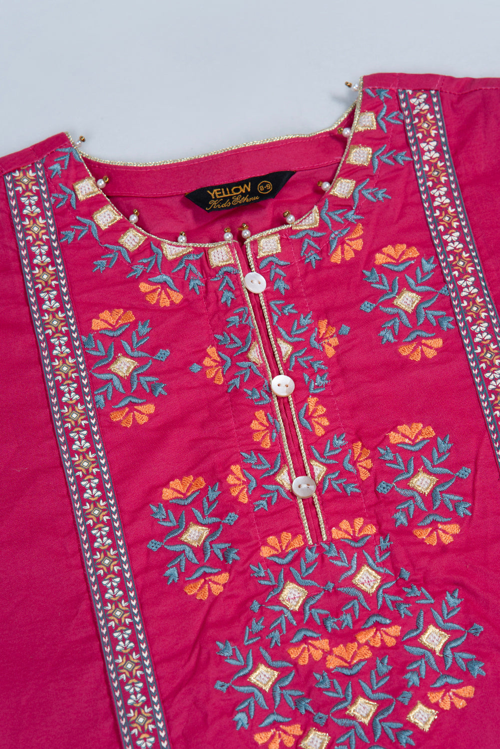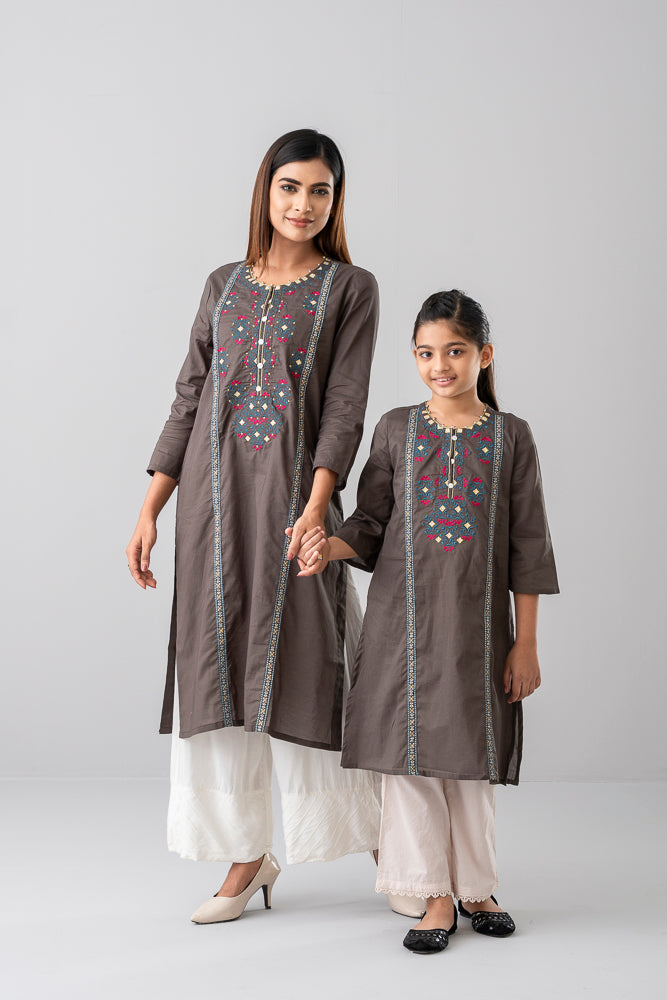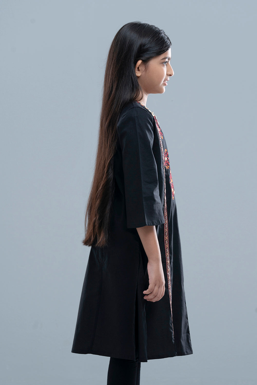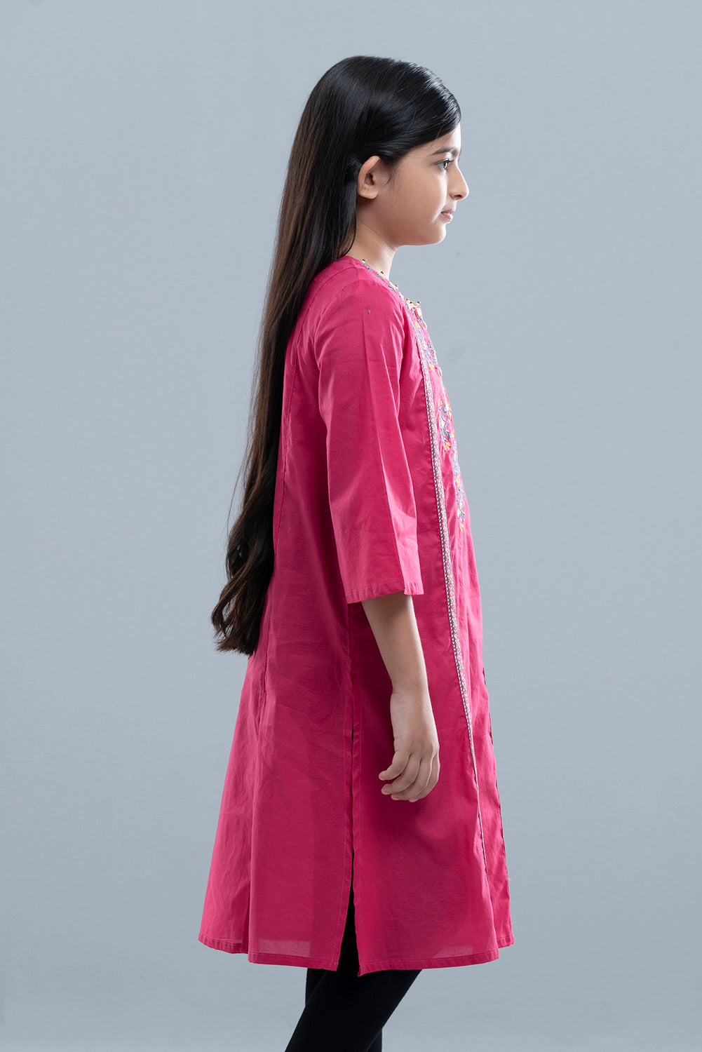Cotton kurti with vibrant ethnic embroidery on the front and delicate border detailing. Features a straight cut, 3/4 sleeves, and a comfortable fit.
