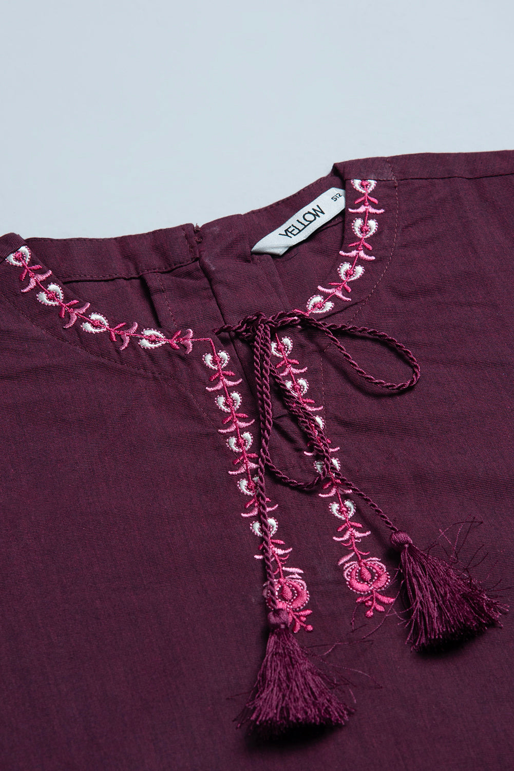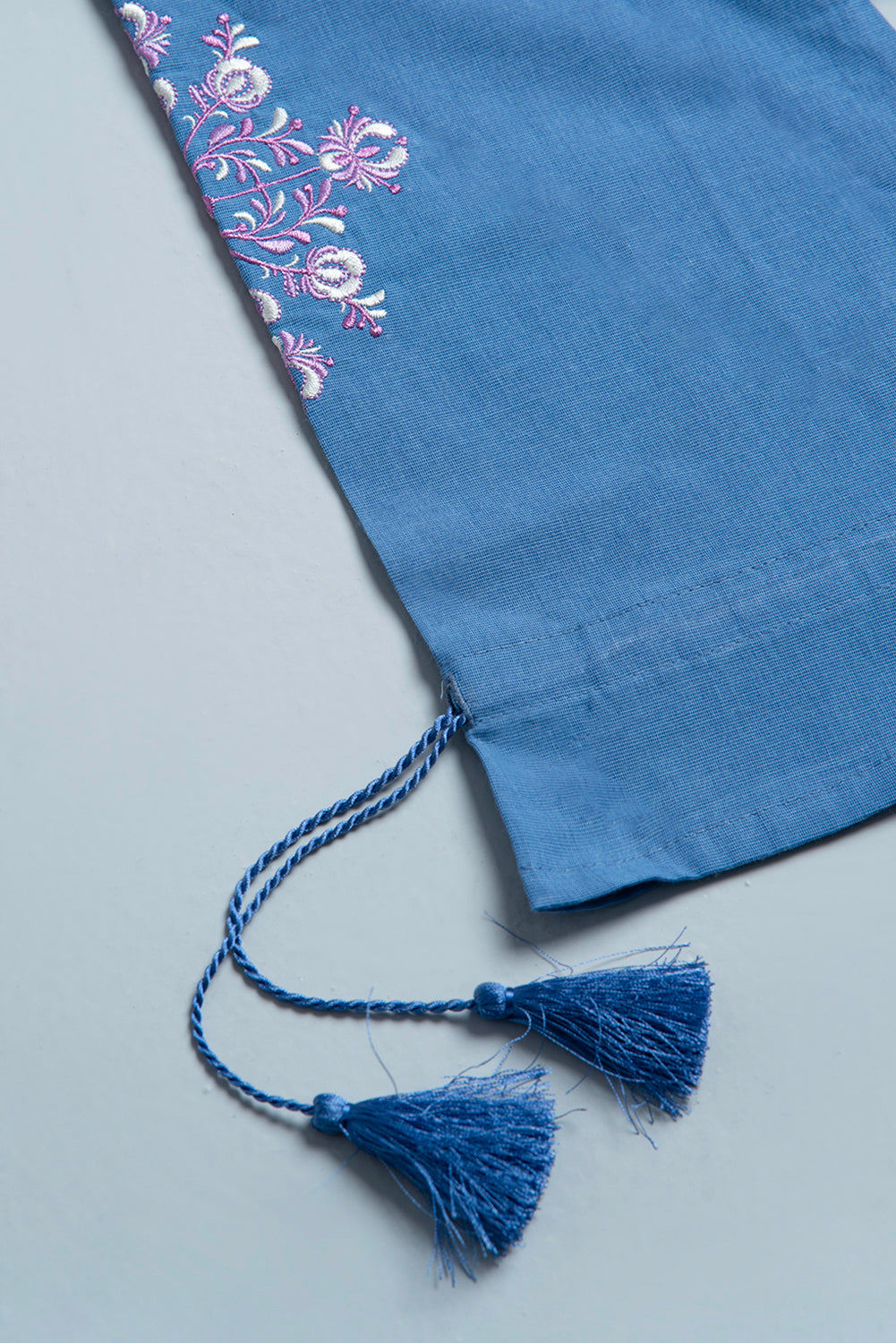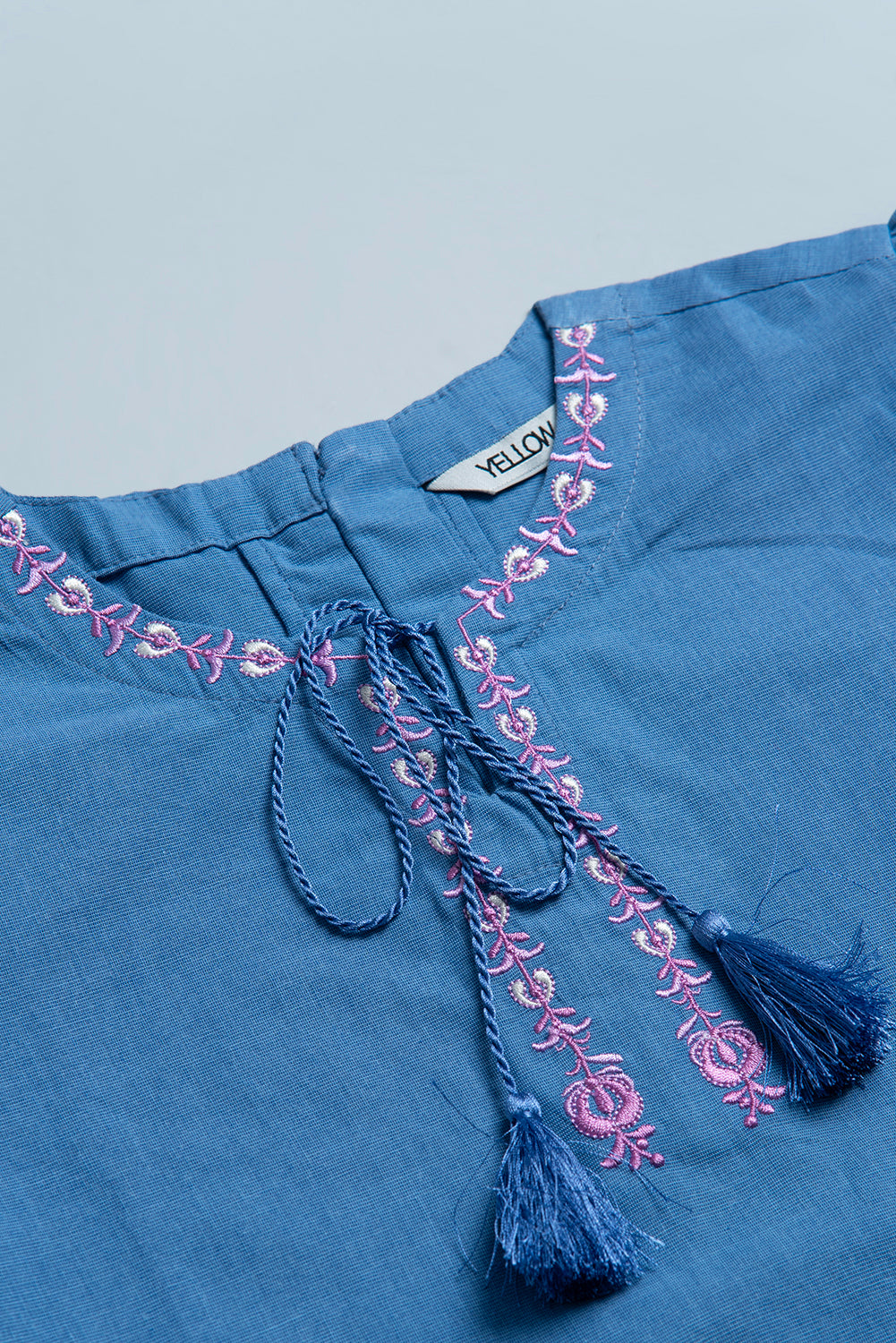 Crafted from a soft cotton-blend duo-tone fabric, this charming girls’ kurti blends comfort with refined detail. Featuring delicate embroidery, gathered sleeve accents, and playful tassels, it’s a perfect pick for effortless everyday elegance in stone blue or crimson red.