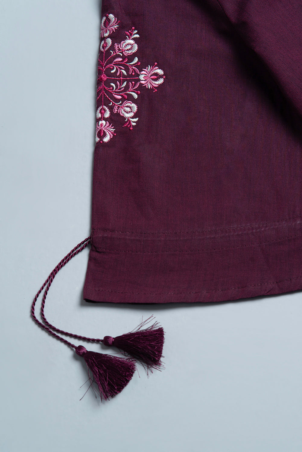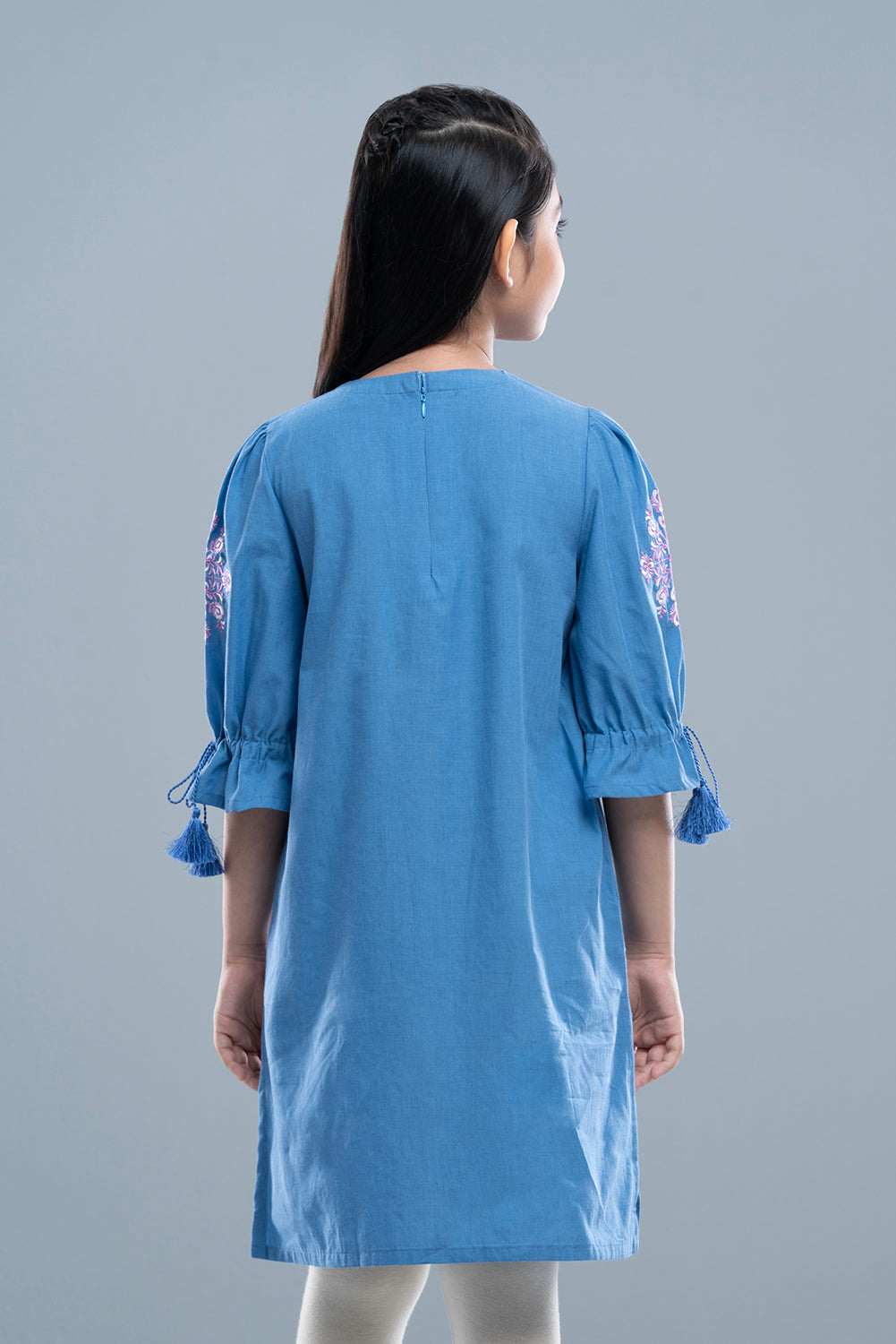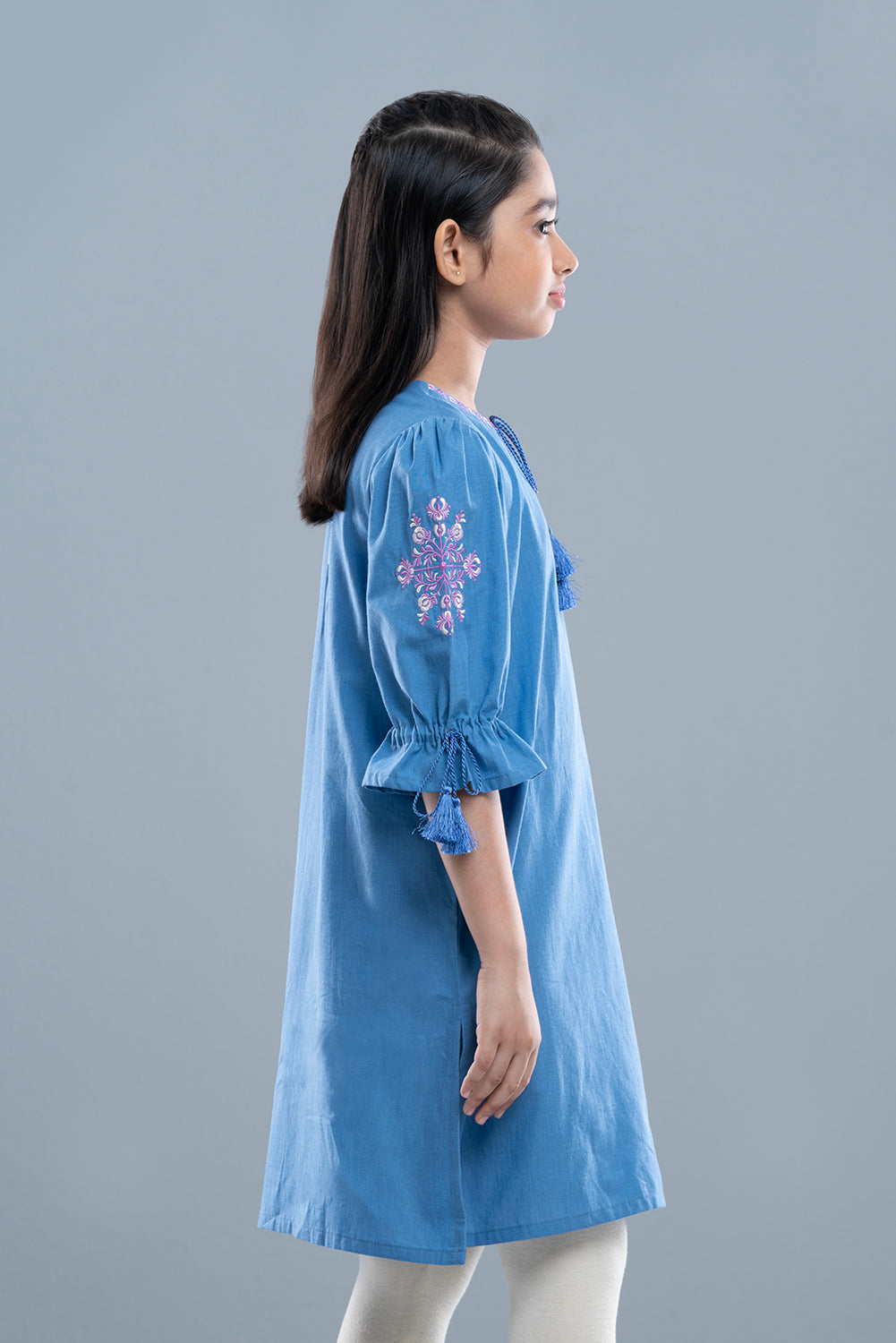 Crafted from a soft cotton-blend duo-tone fabric, this charming girls’ kurti blends comfort with refined detail. Featuring delicate embroidery, gathered sleeve accents, and playful tassels, it’s a perfect pick for effortless everyday elegance in stone blue or crimson red.