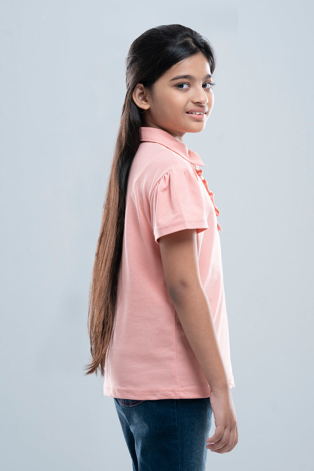 Crafted from comfortable, breathable cotton, it features sweet puff sleeves and a classic polo collar. The front placket is adorned with delicate ruffle detailing and matching buttons. 100% cotton knit s/j fabric.