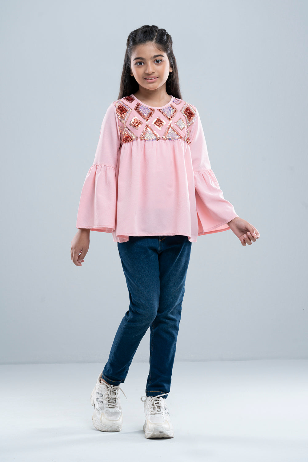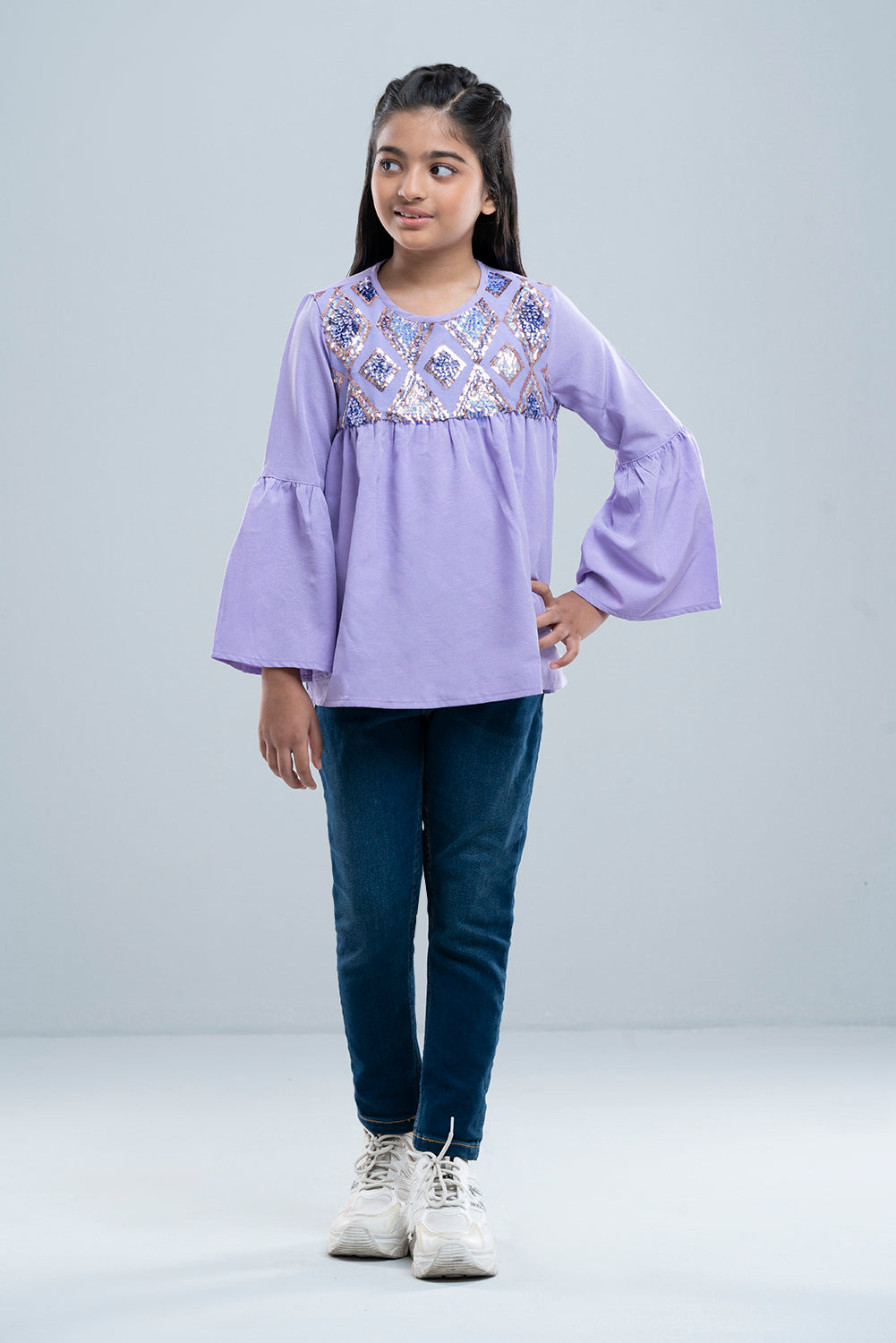Graceful lavender top featuring bell sleeves and decorative fabric, blending comfort and style effortlessly.