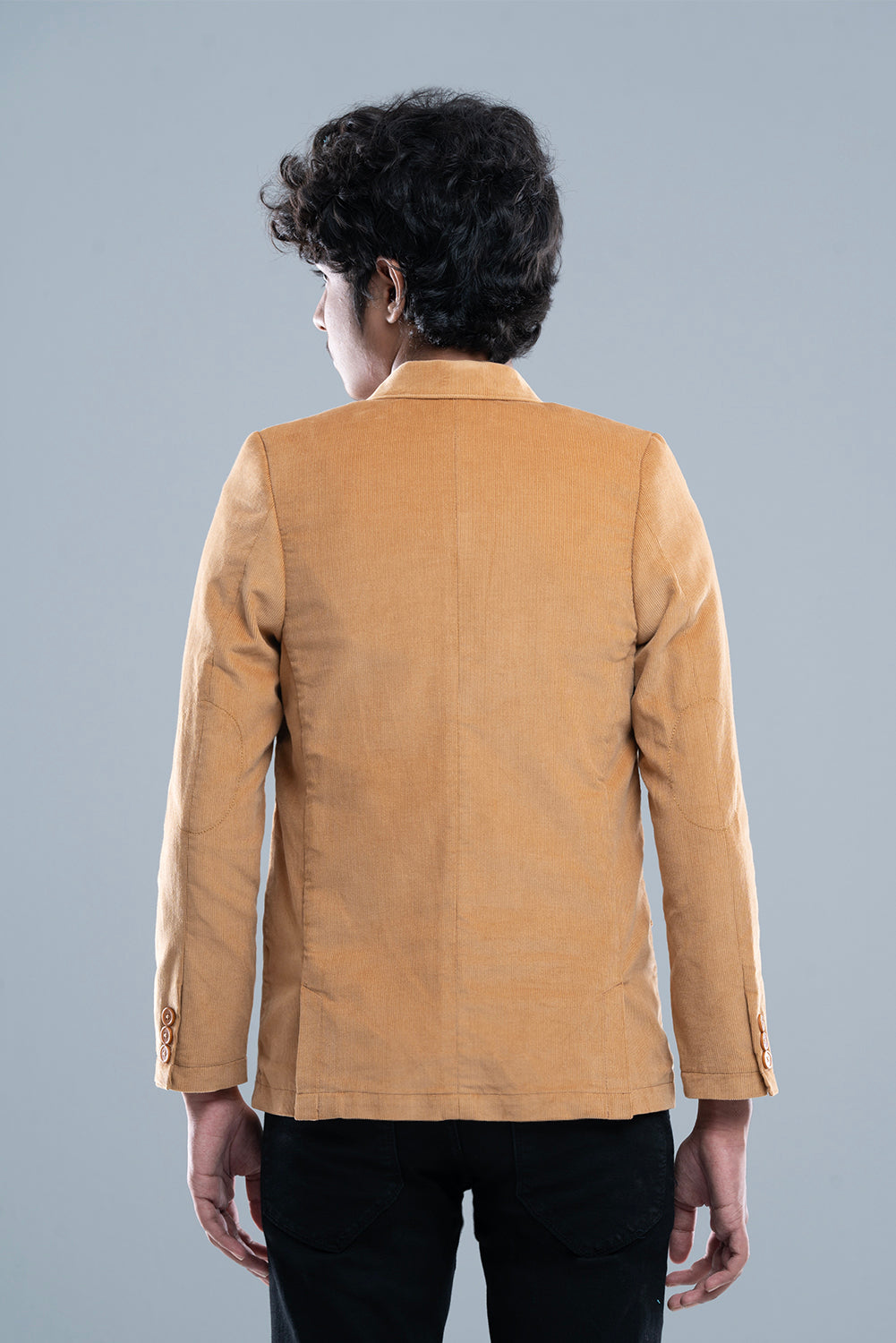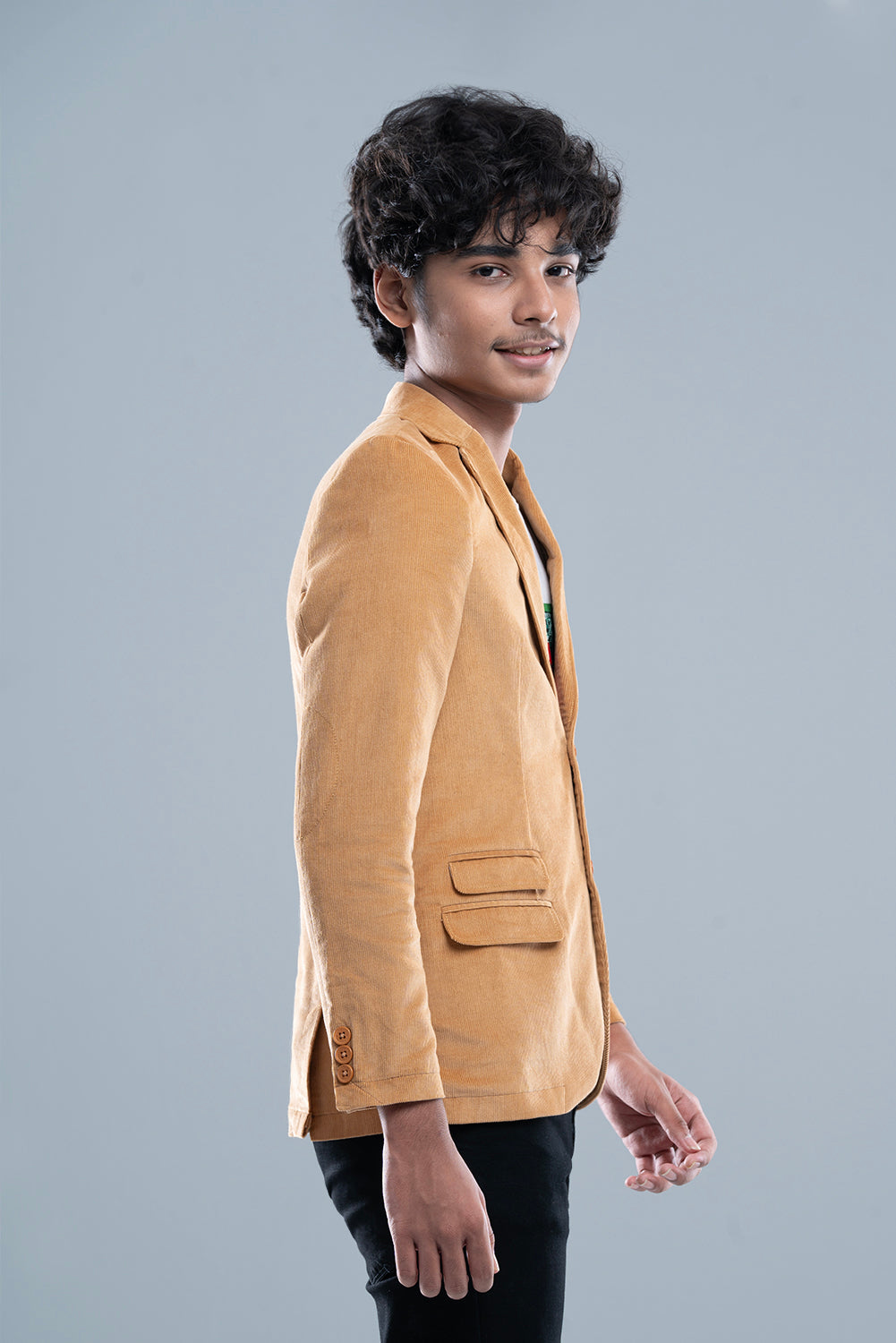 • This stylish boy's blazer is made from a rich, textured tan corduroy fabric, giving it a warm, vintage feel.