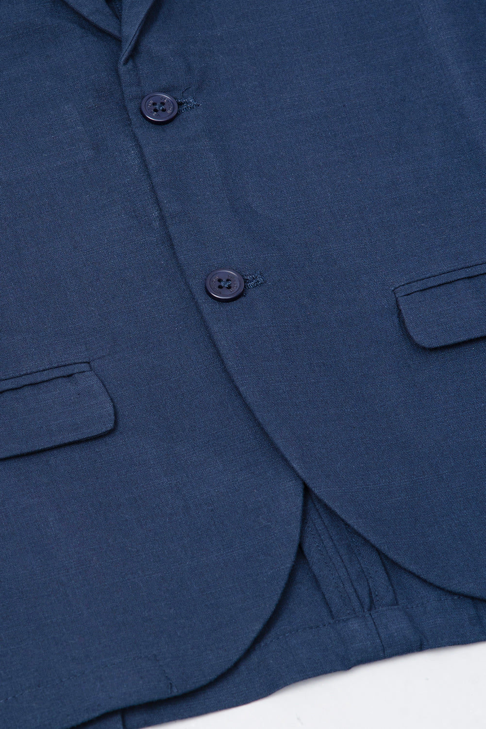 • It features a classic single-breasted design with two brown buttons and functional front flap pockets.