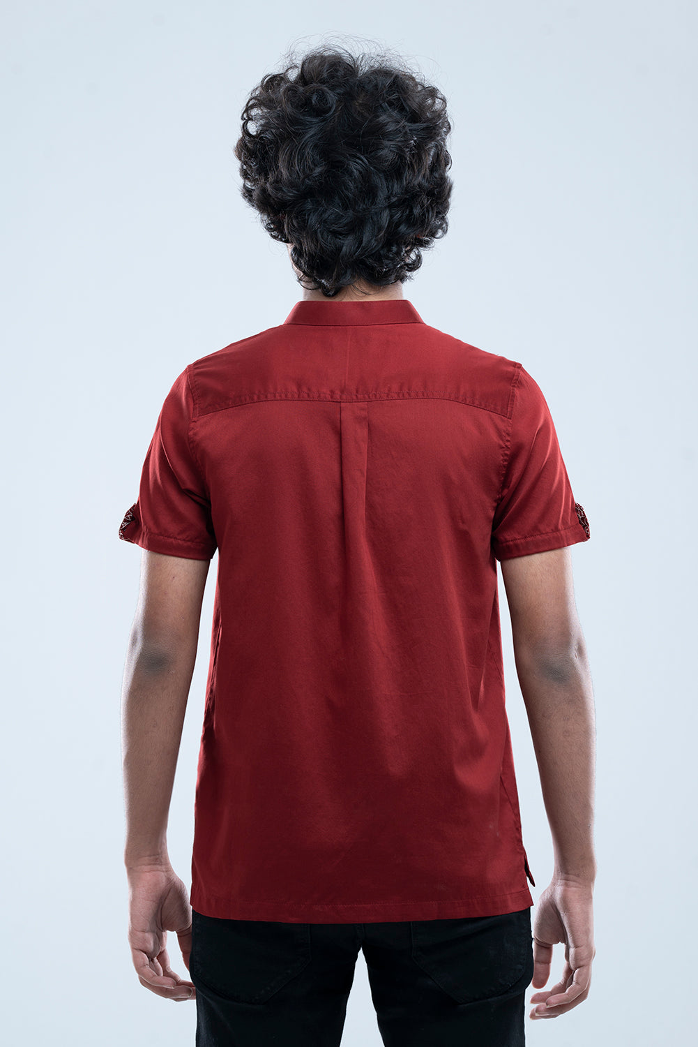 • Red Solid Band Collar Shirt