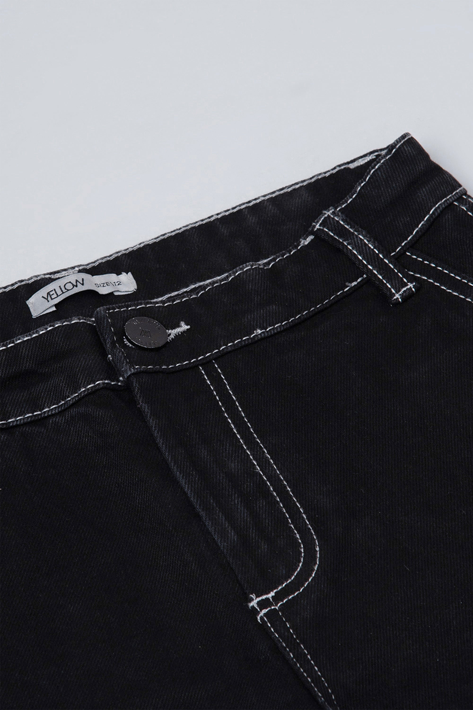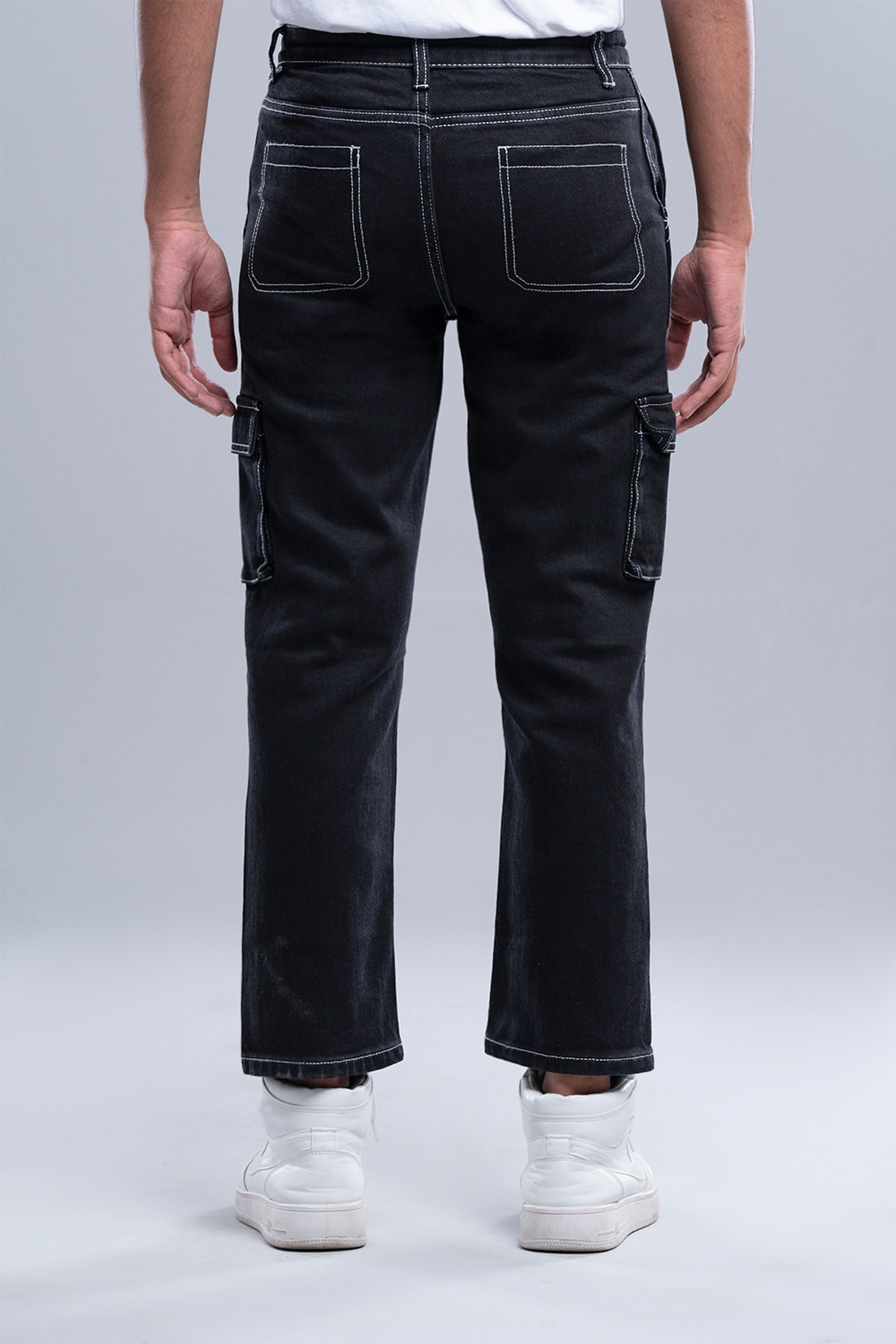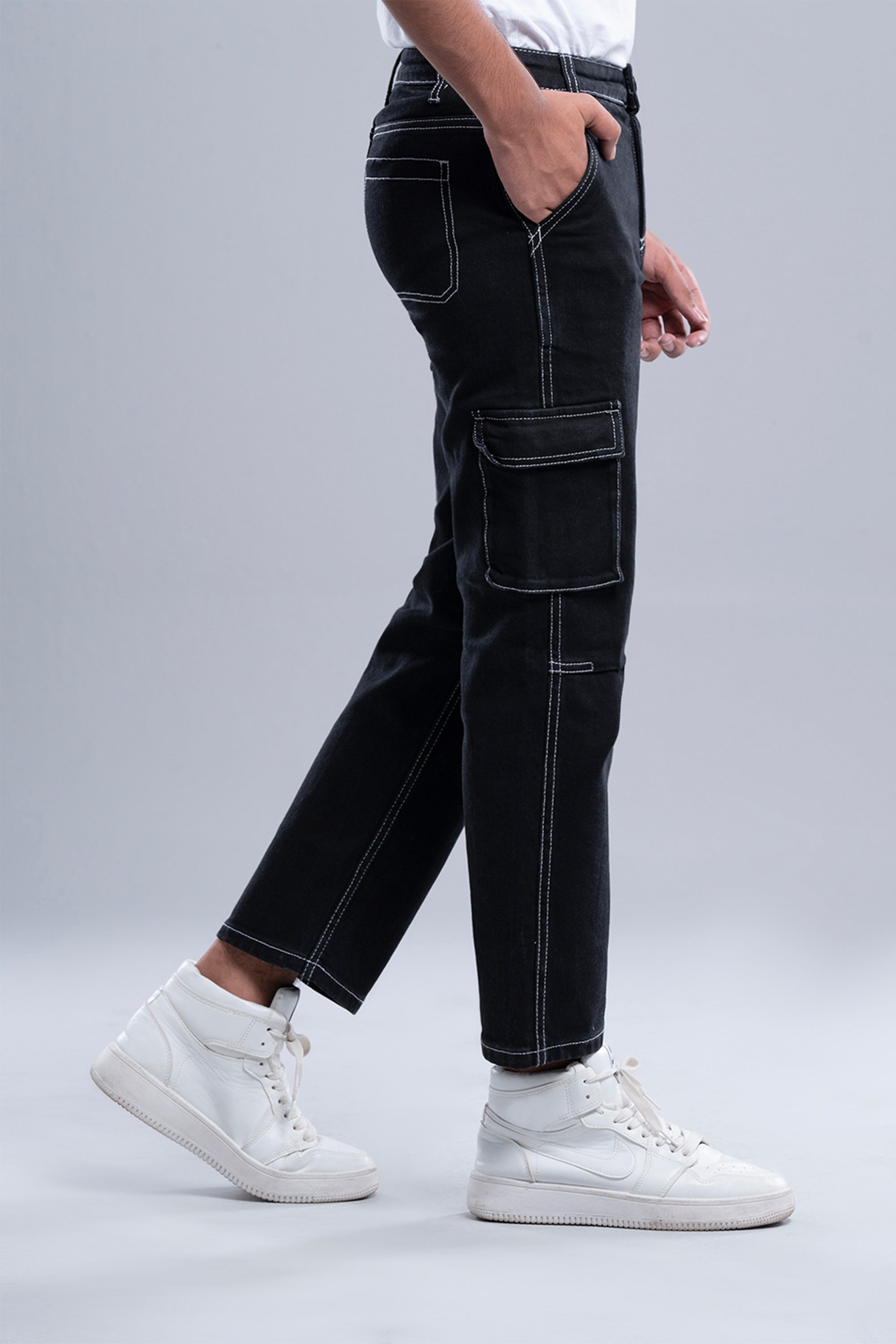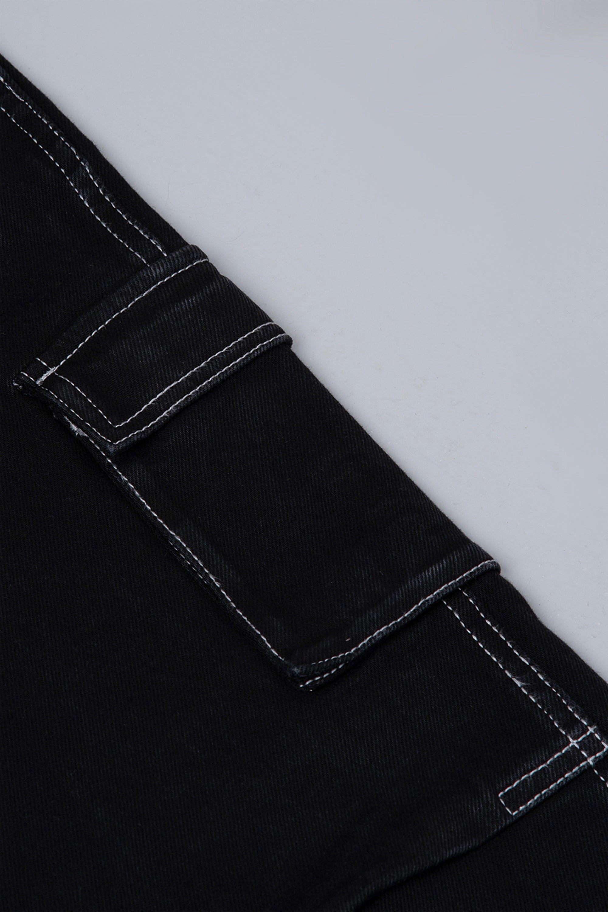Black color cargo denim with variety of styling. Fake stich pocket overlap with cross pocket. Shank Button, Flap pockets on side leg, Cut and sew under knee level. Fake stich back pocket.
