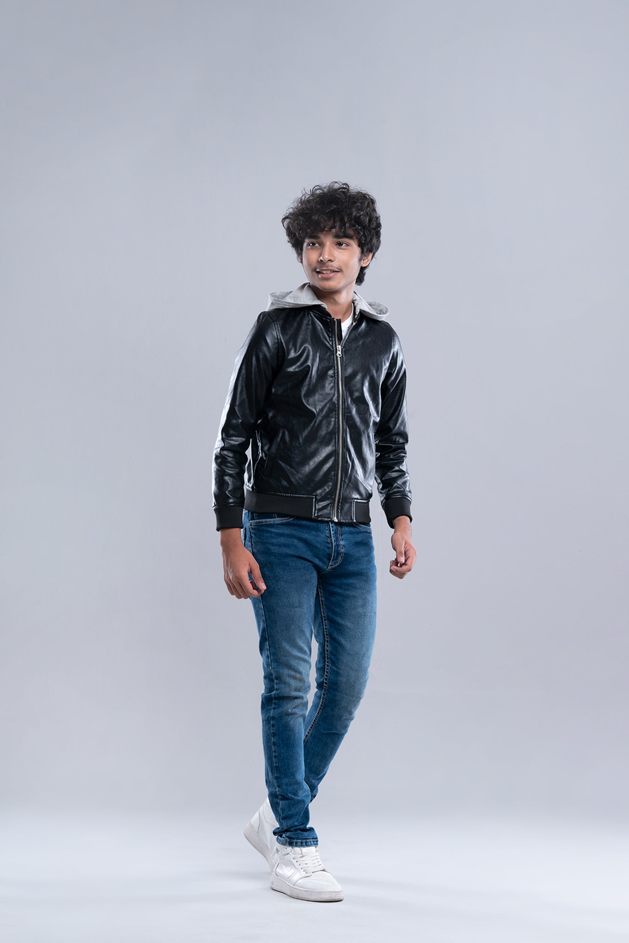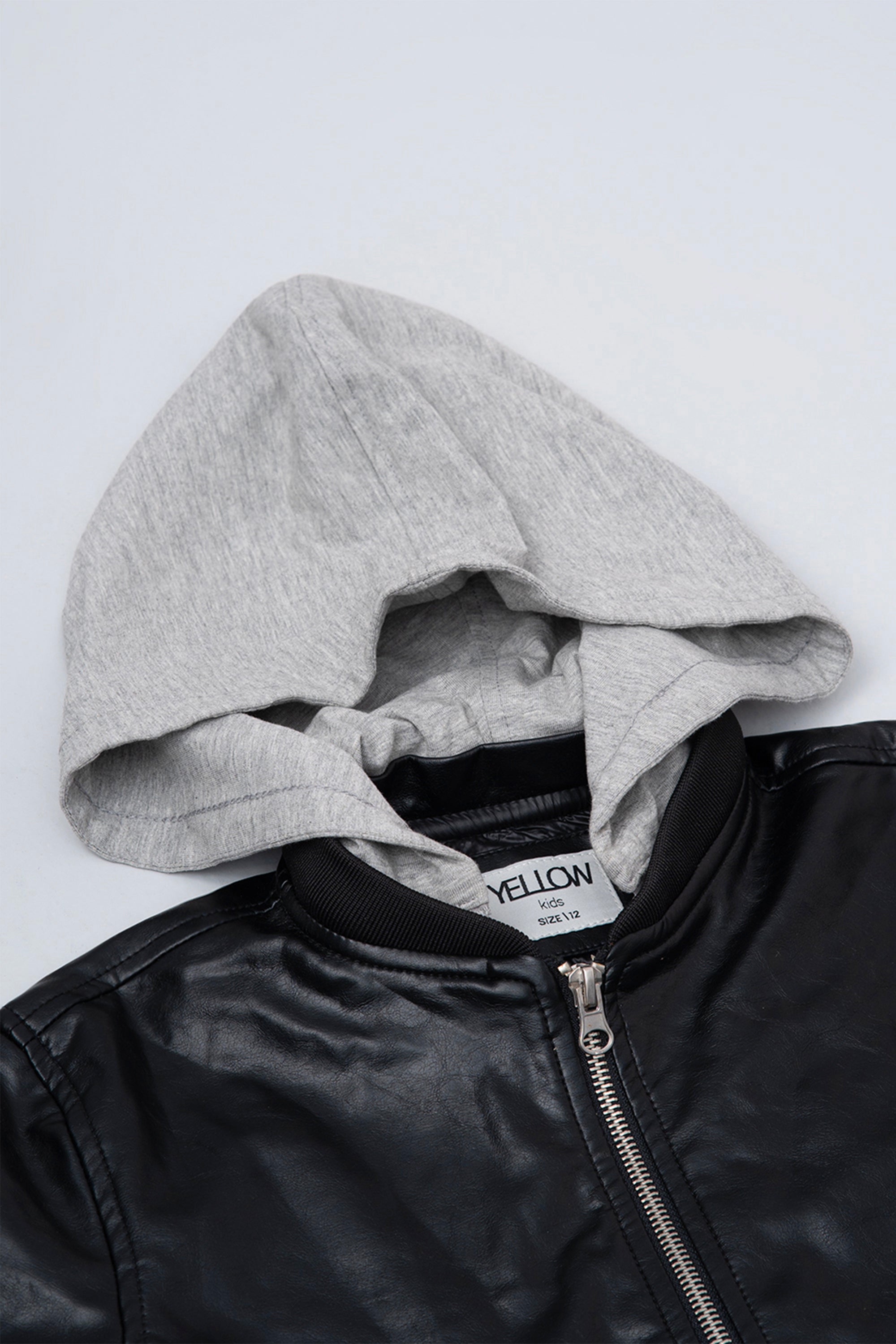 Get two looks in one with this edgy black faux leather bomber jacket. Designed for ultimate versatility, it features a contrasting grey knit hood that is completely detachable. Wear the hood for a cool, layered, street-style look, or remove it for a sharp, classic racer jacket silhouette.