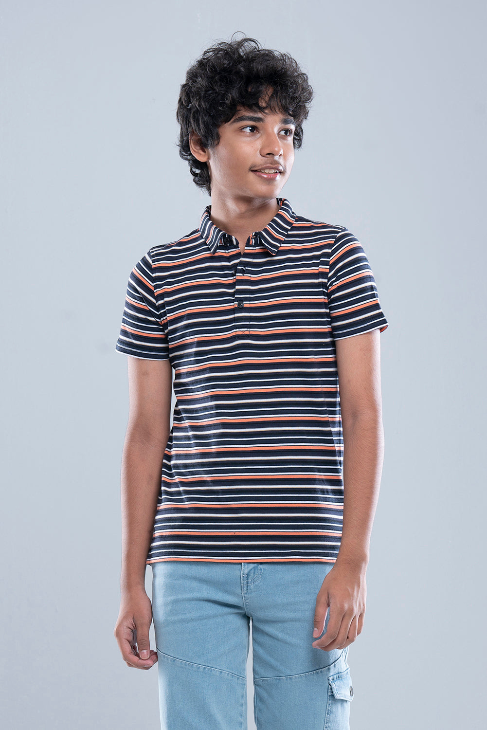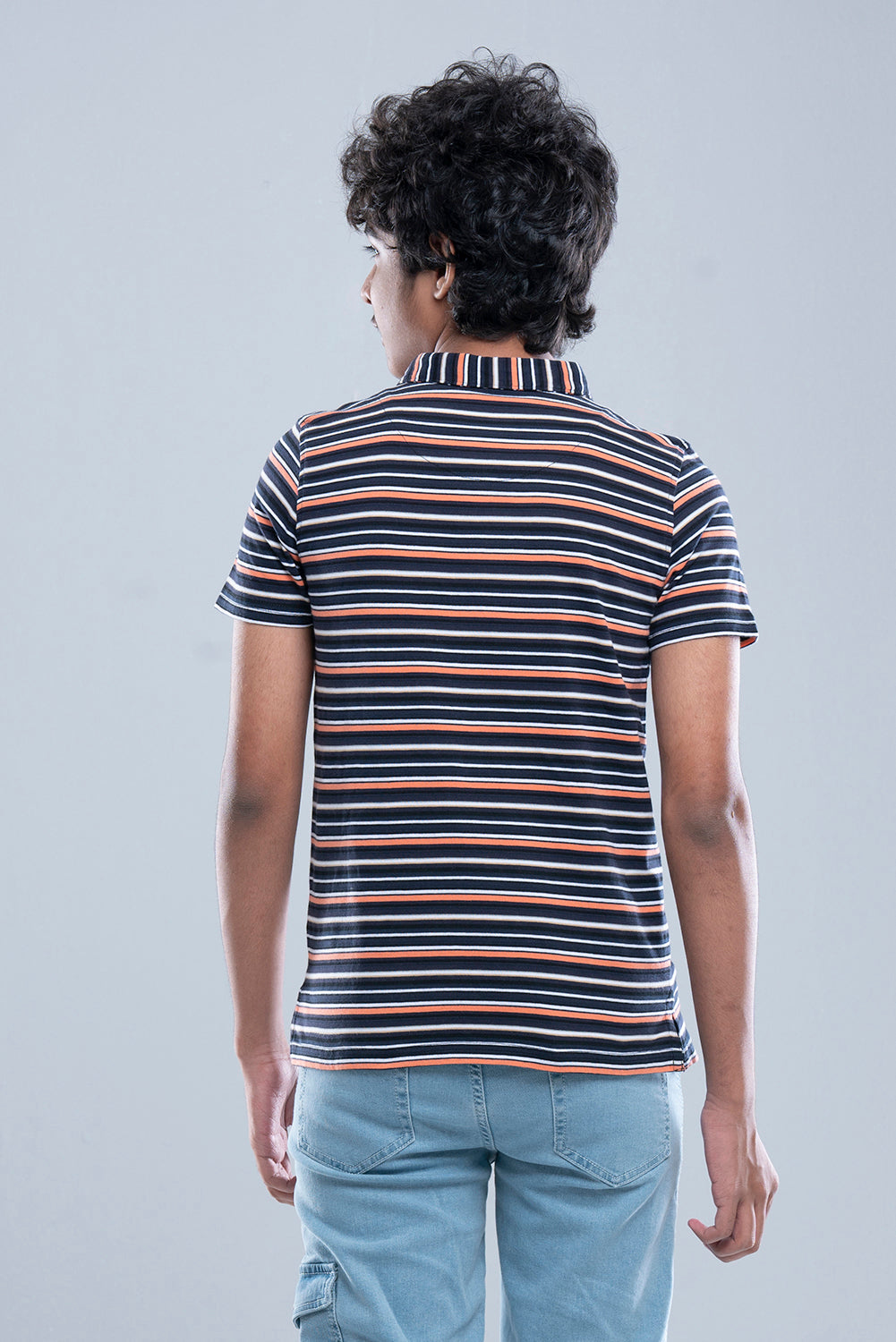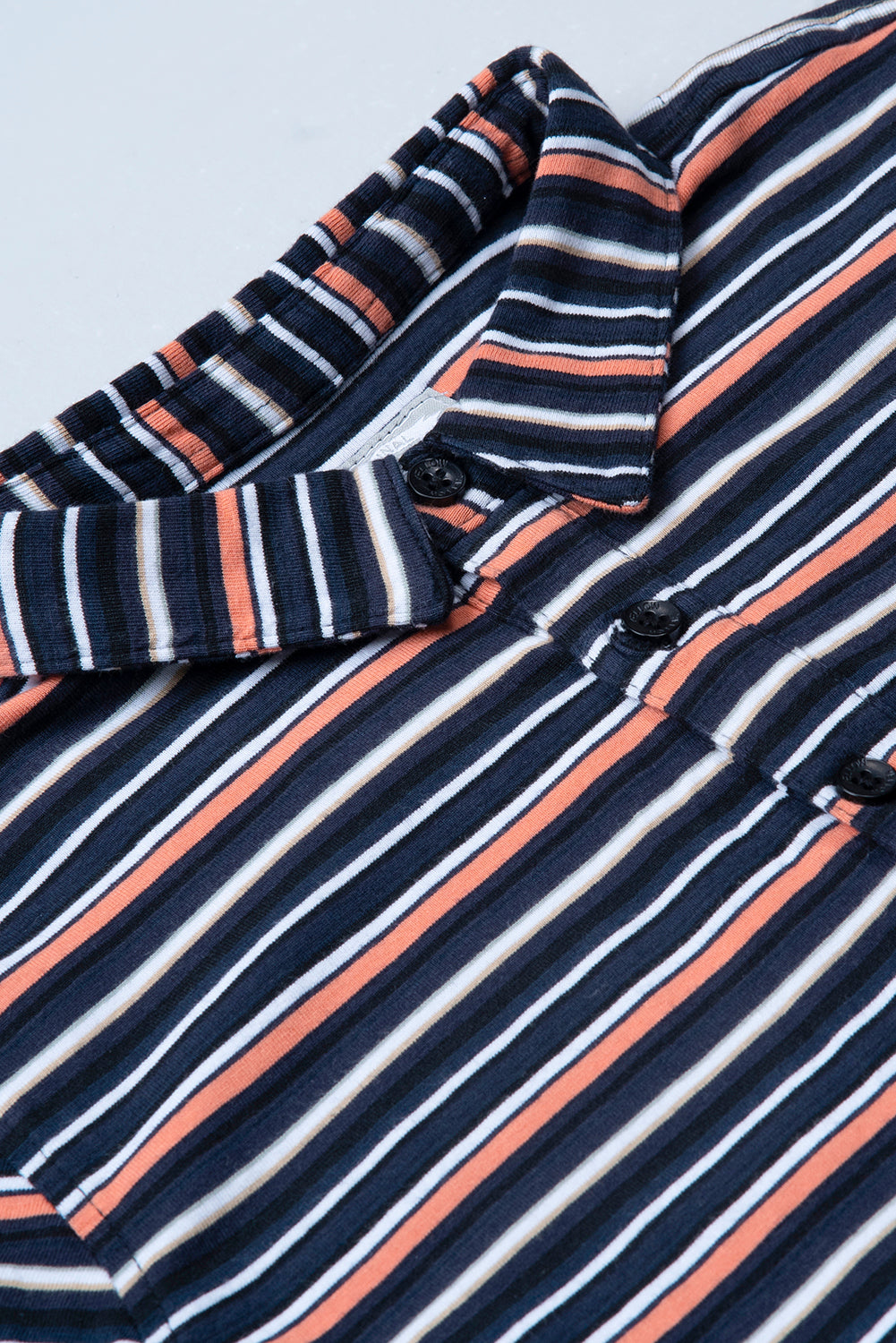 • A Casual polo with horizontal orange, white, and beige stripes,