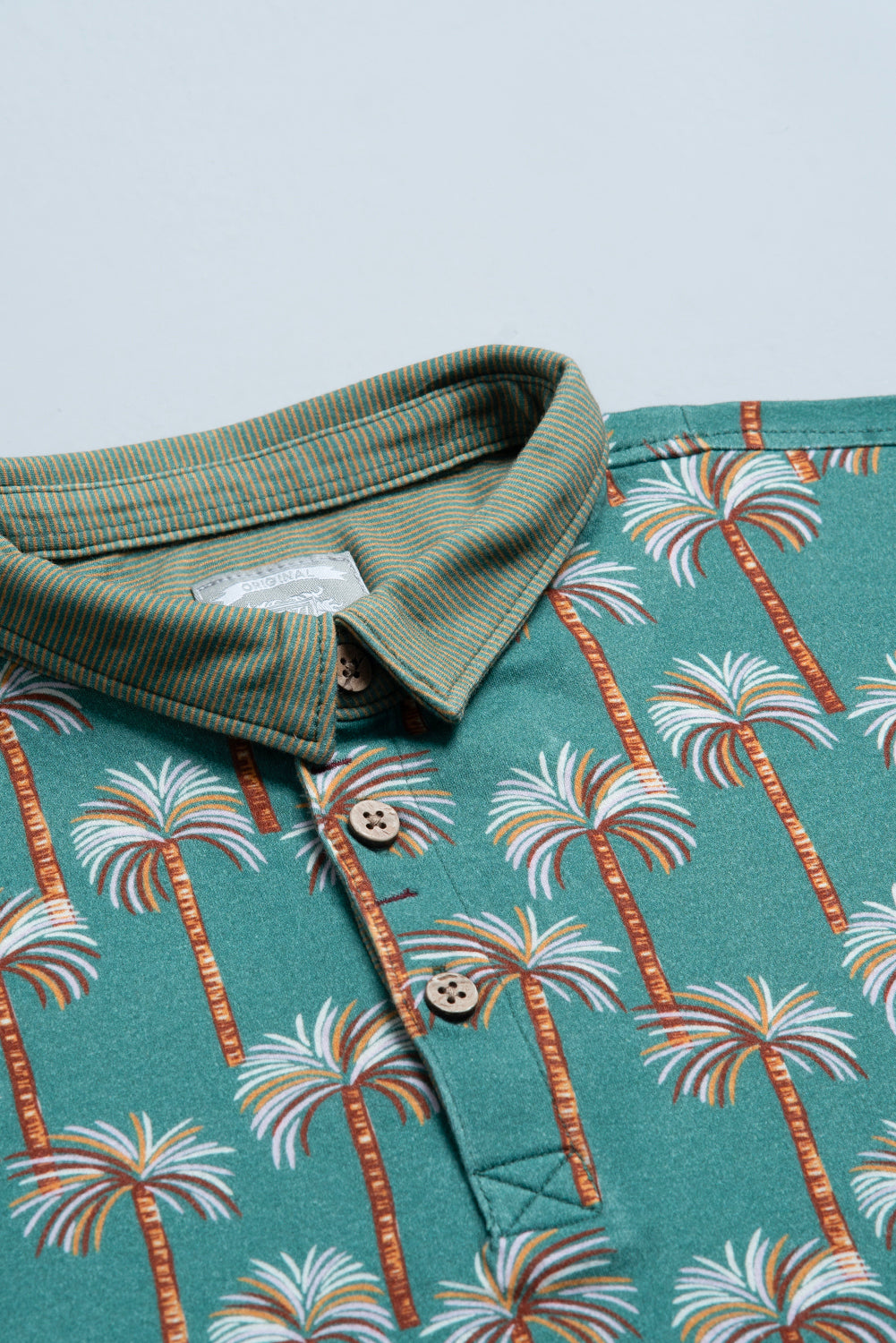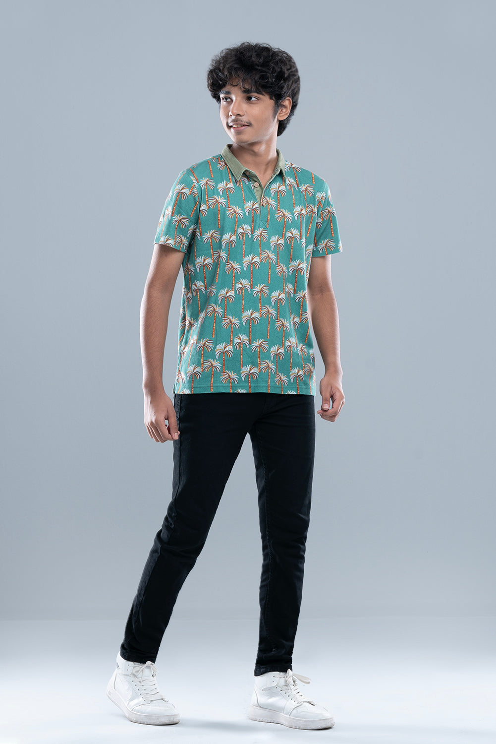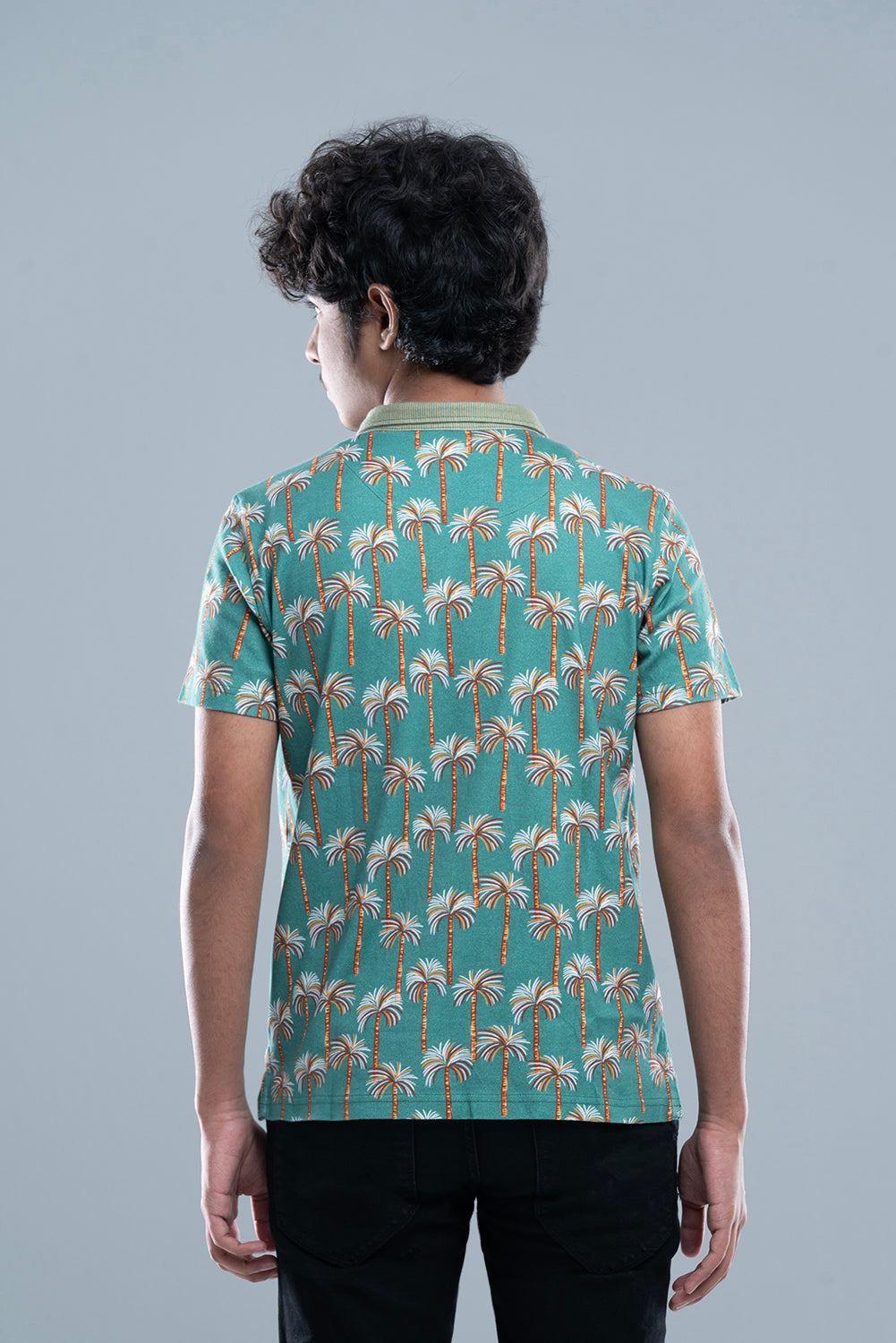 Embrace the tropical vibe with this eye-catching Slim Fit Polo Shirt. Crafted from ultra-soft 100% Cotton Interlock fabric, it provides superior comfort and a premium feel. The shirt features a vibrant all-over digital print of palm trees and is finished with a sophisticated contrast striped collar, blending a bold pattern with a smart, polished look.