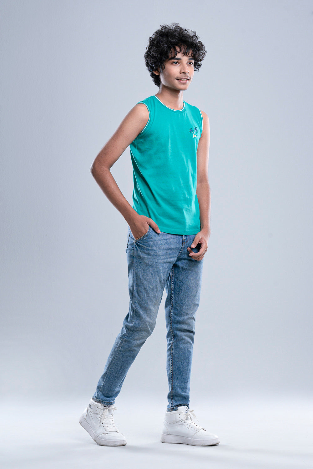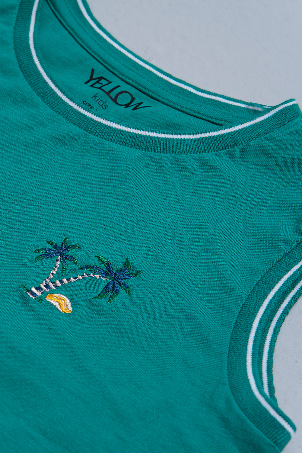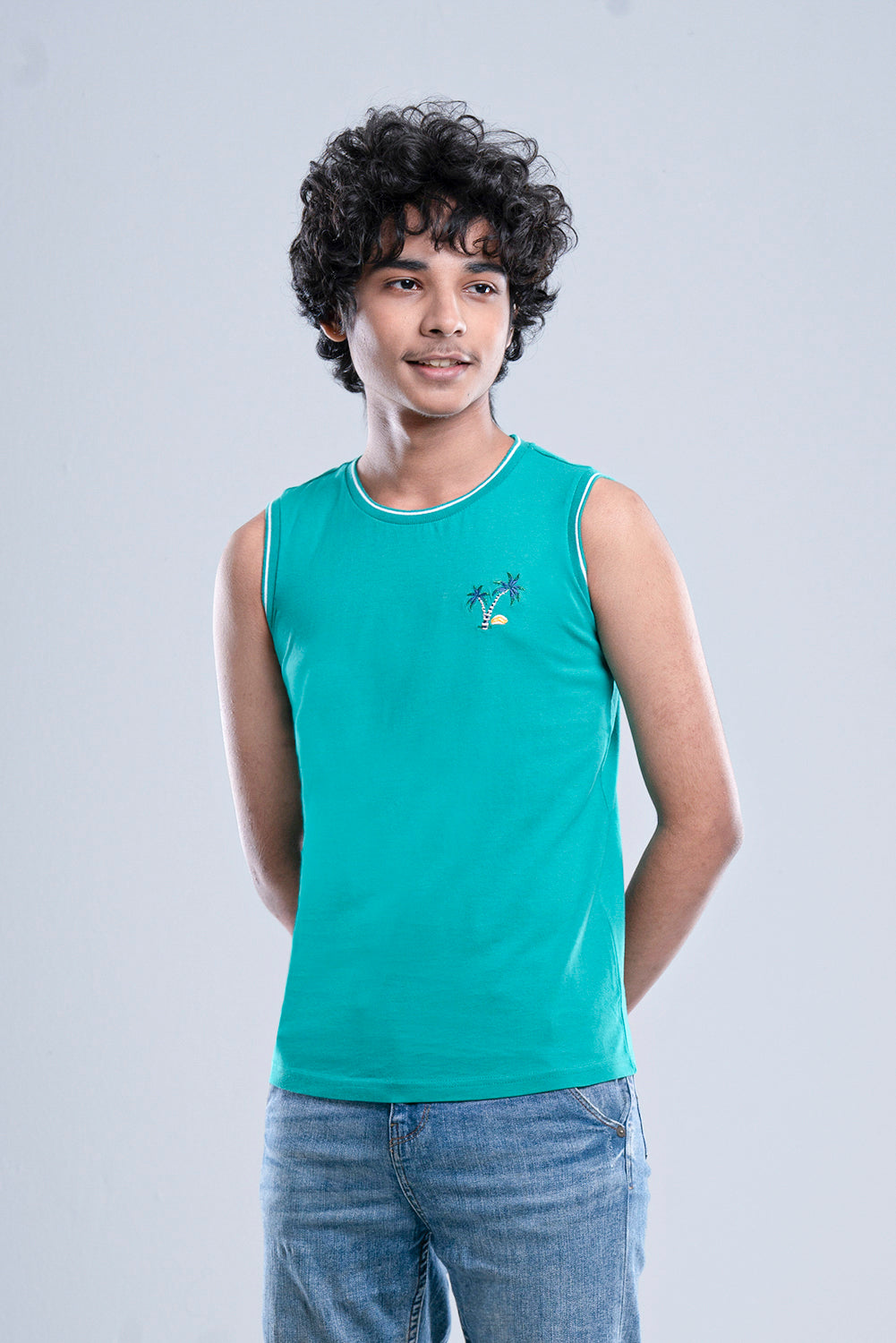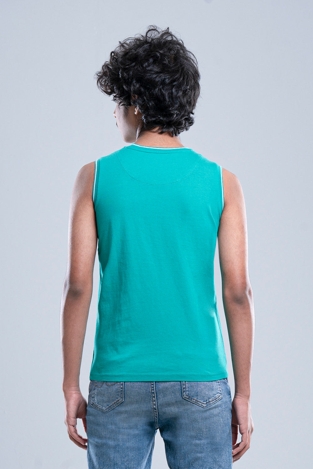 • Sleeveless green sando with white-trimmed edges around the neck and armholes