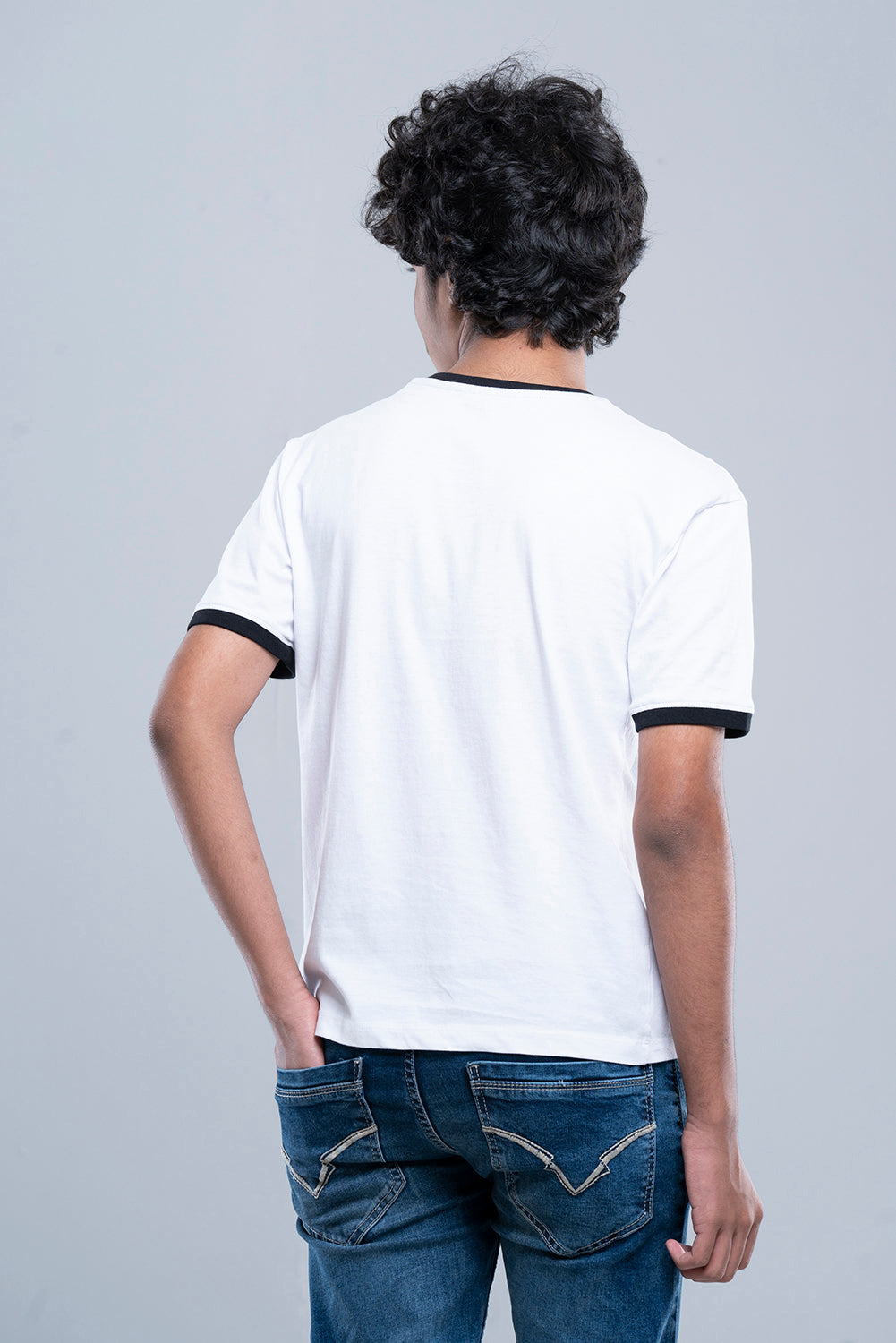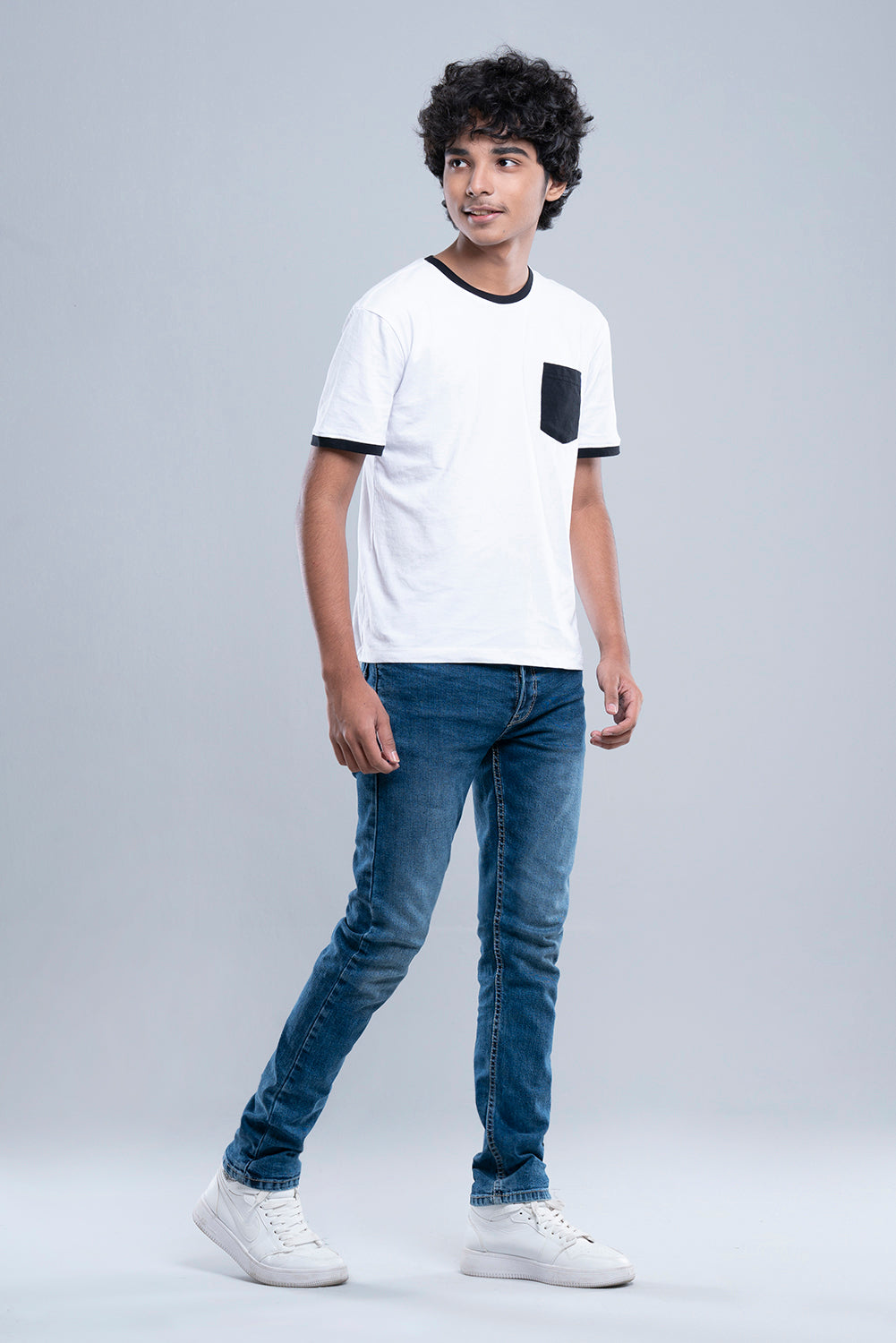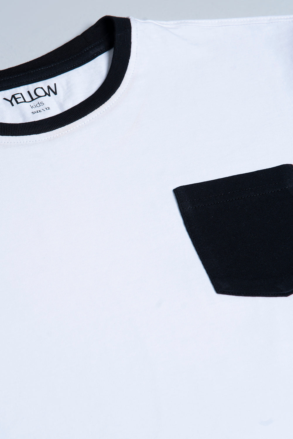 • Classic white crew-neck tee with black pocket and trims – simple, modern, and effortlessly cool.
