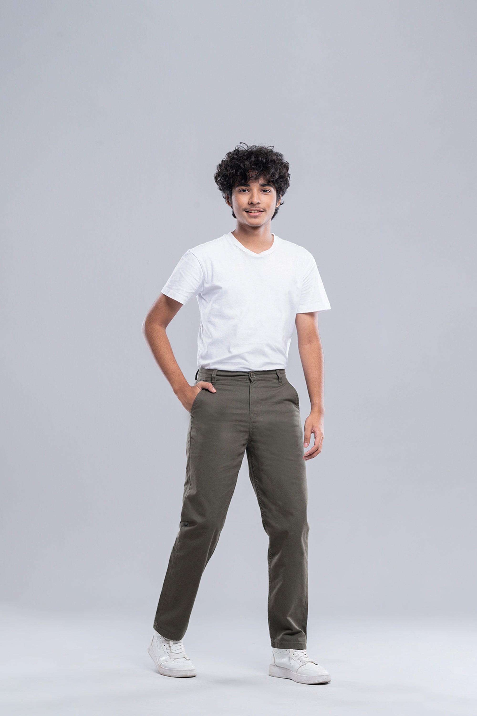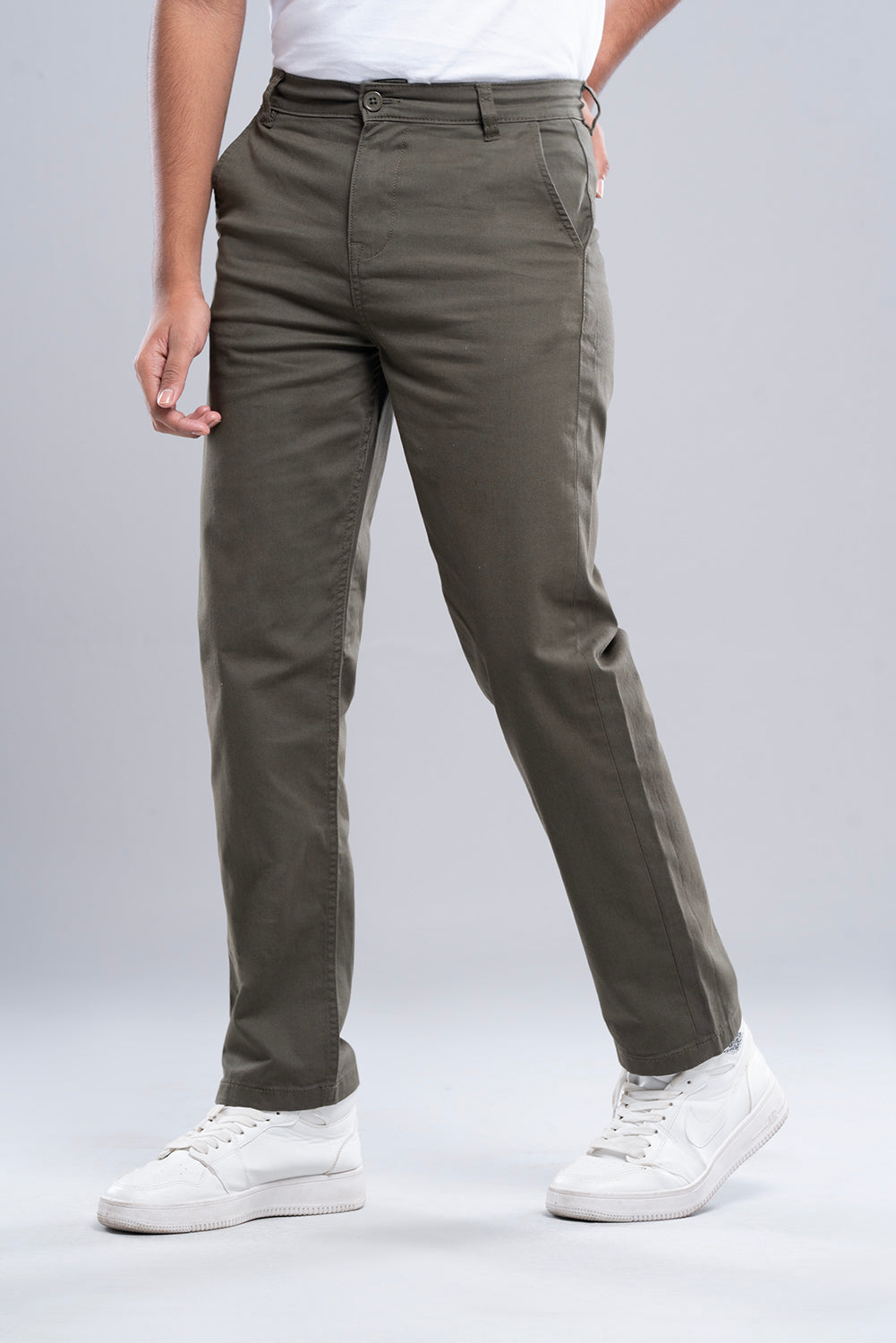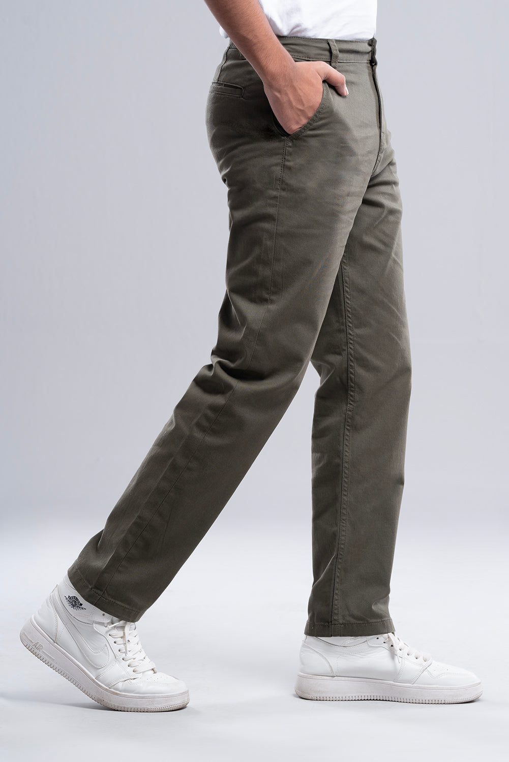 • Straight fit with adjustable elastic at the waist and a fly with zipper and button.