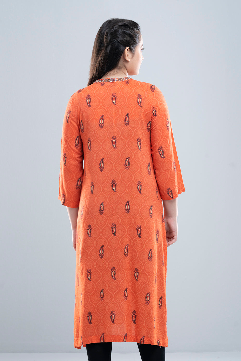 Brighten up any day with this vibrant orange kurti, crafted from soft and breathable viscose fabric for a comfortable, airy feel. The dress features an allover ethnic paisley motif, complemented by a richly detailed border print at the hemline, adding a bold and traditional touch.