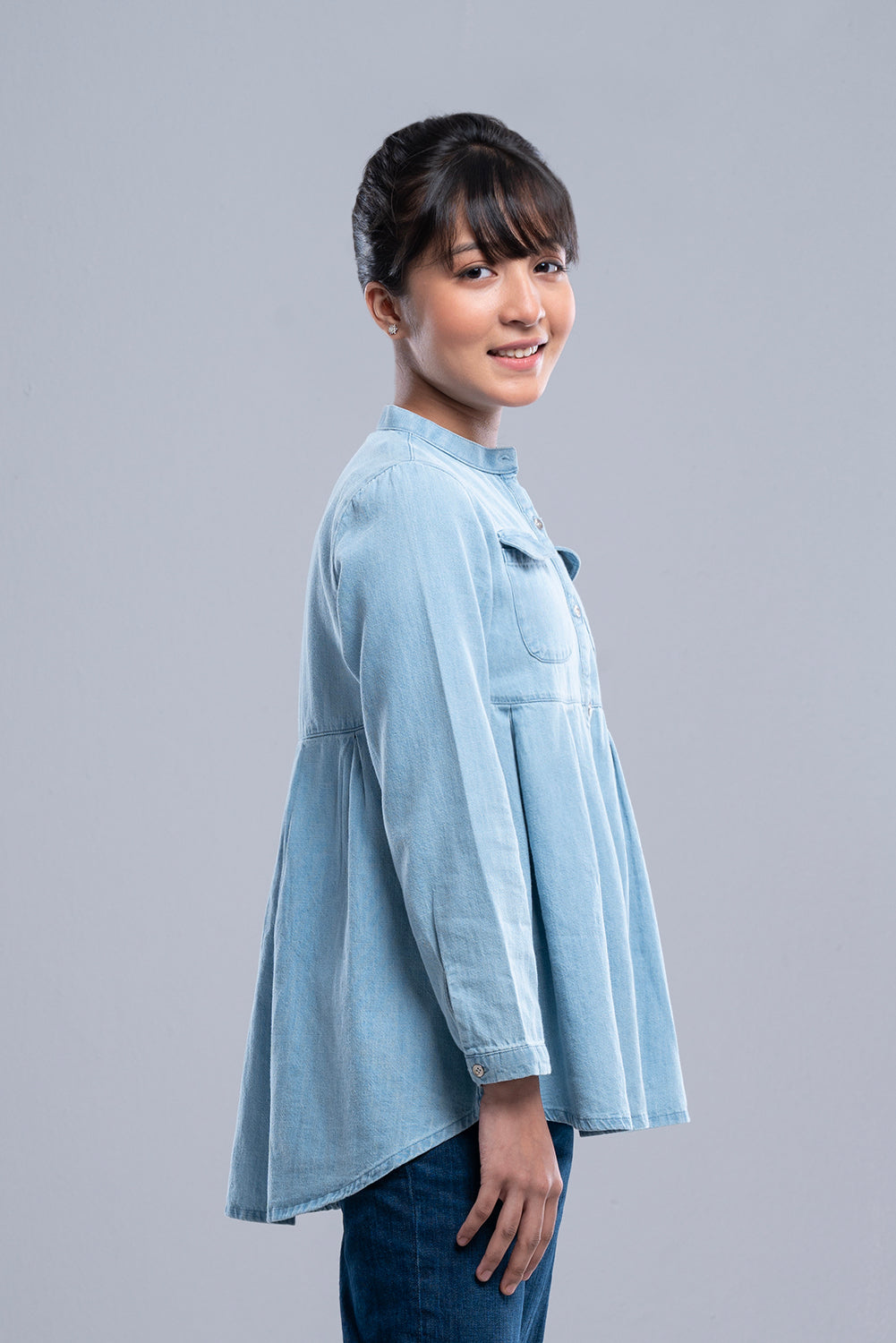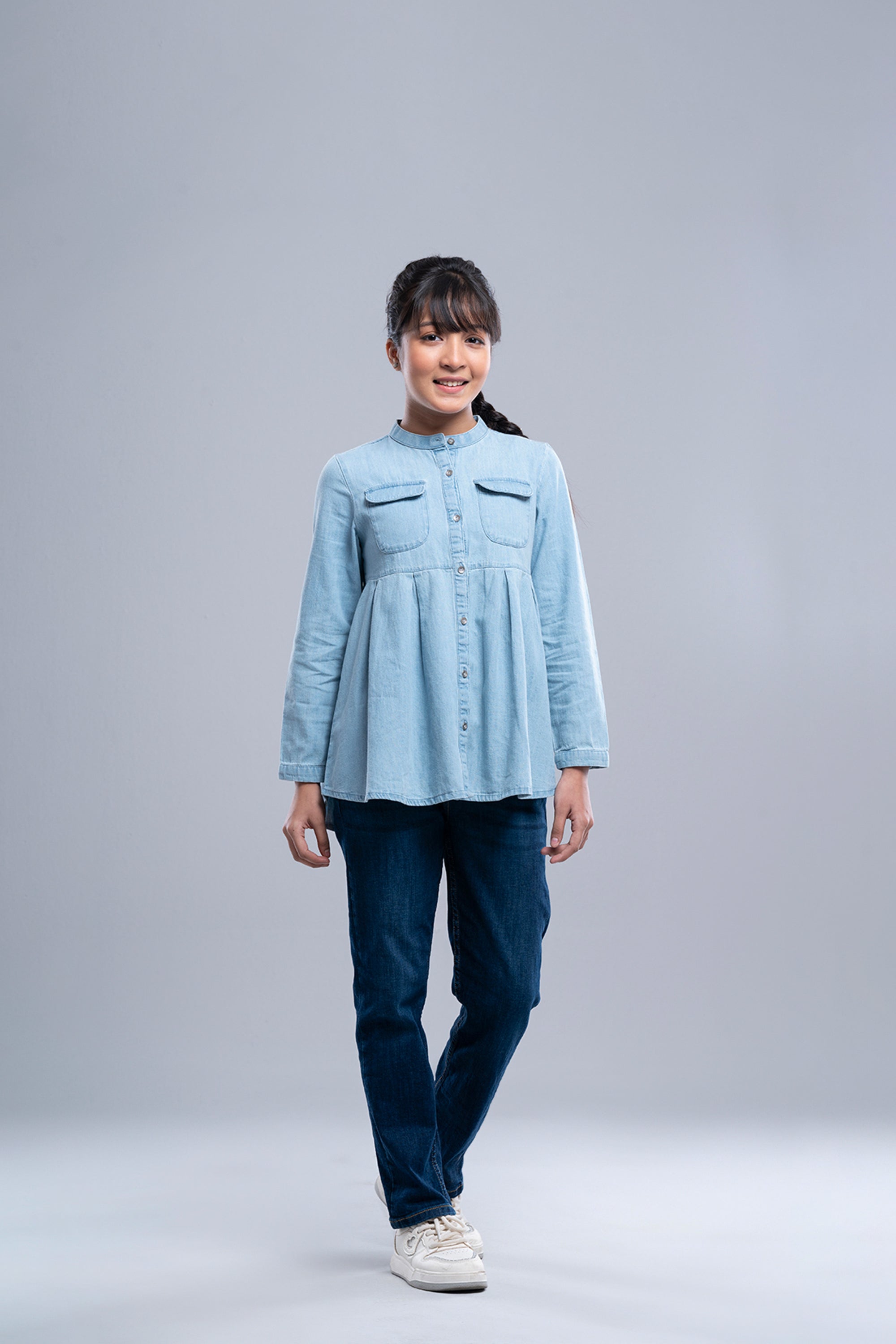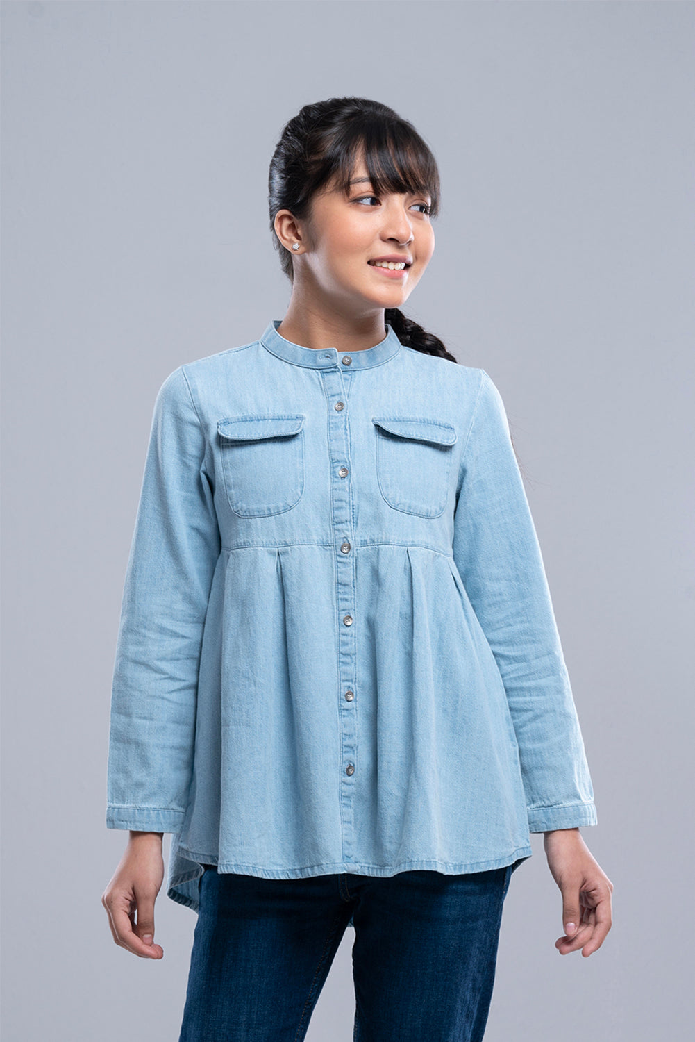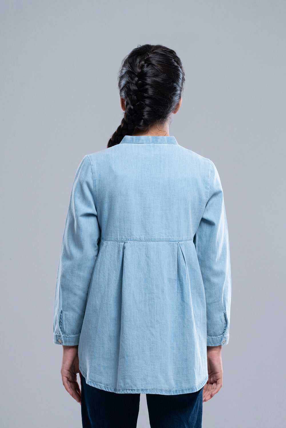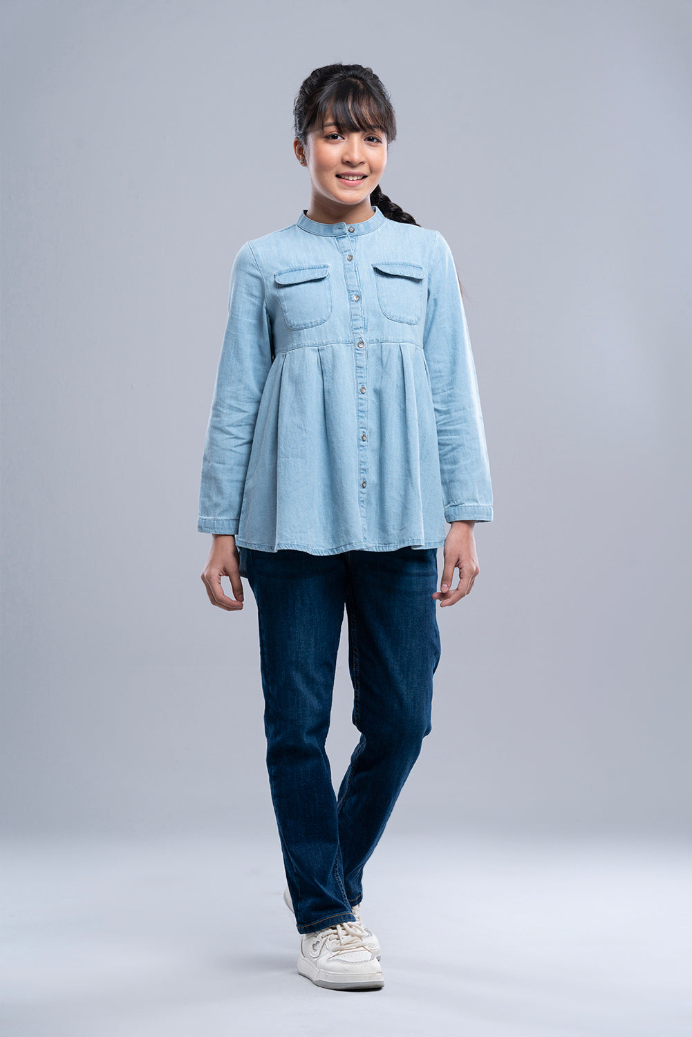 • Pleated design, band collar, full length sleeve, yoke with pocket, front opening with button placket.