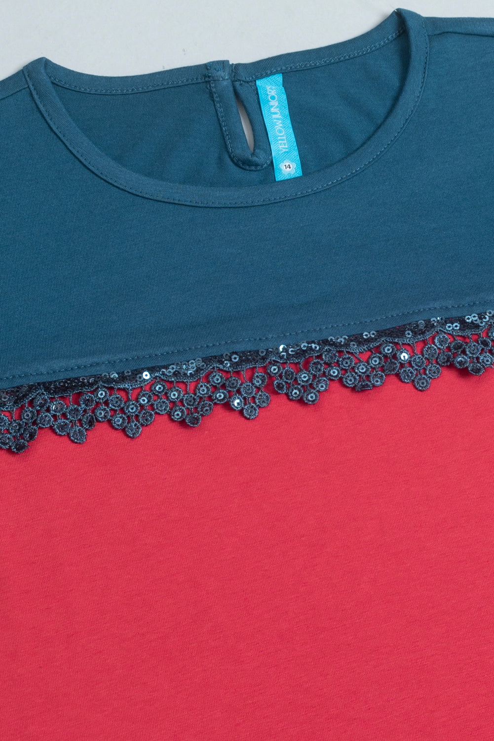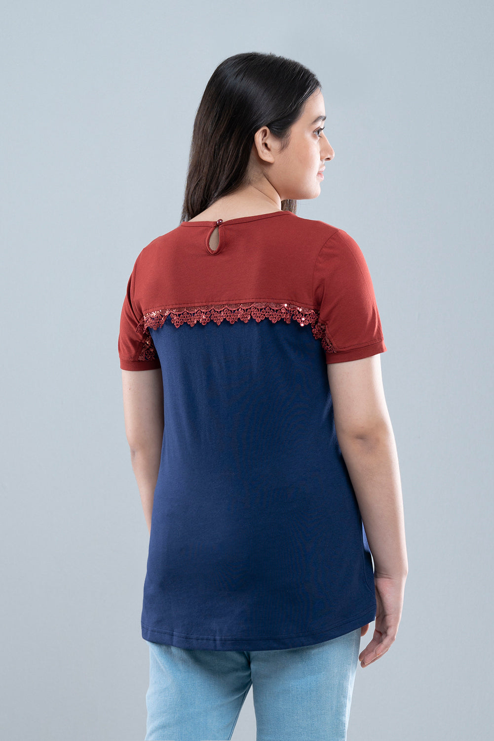 • Trendy short-sleeve top with a vibrant body and contrasting shoulders