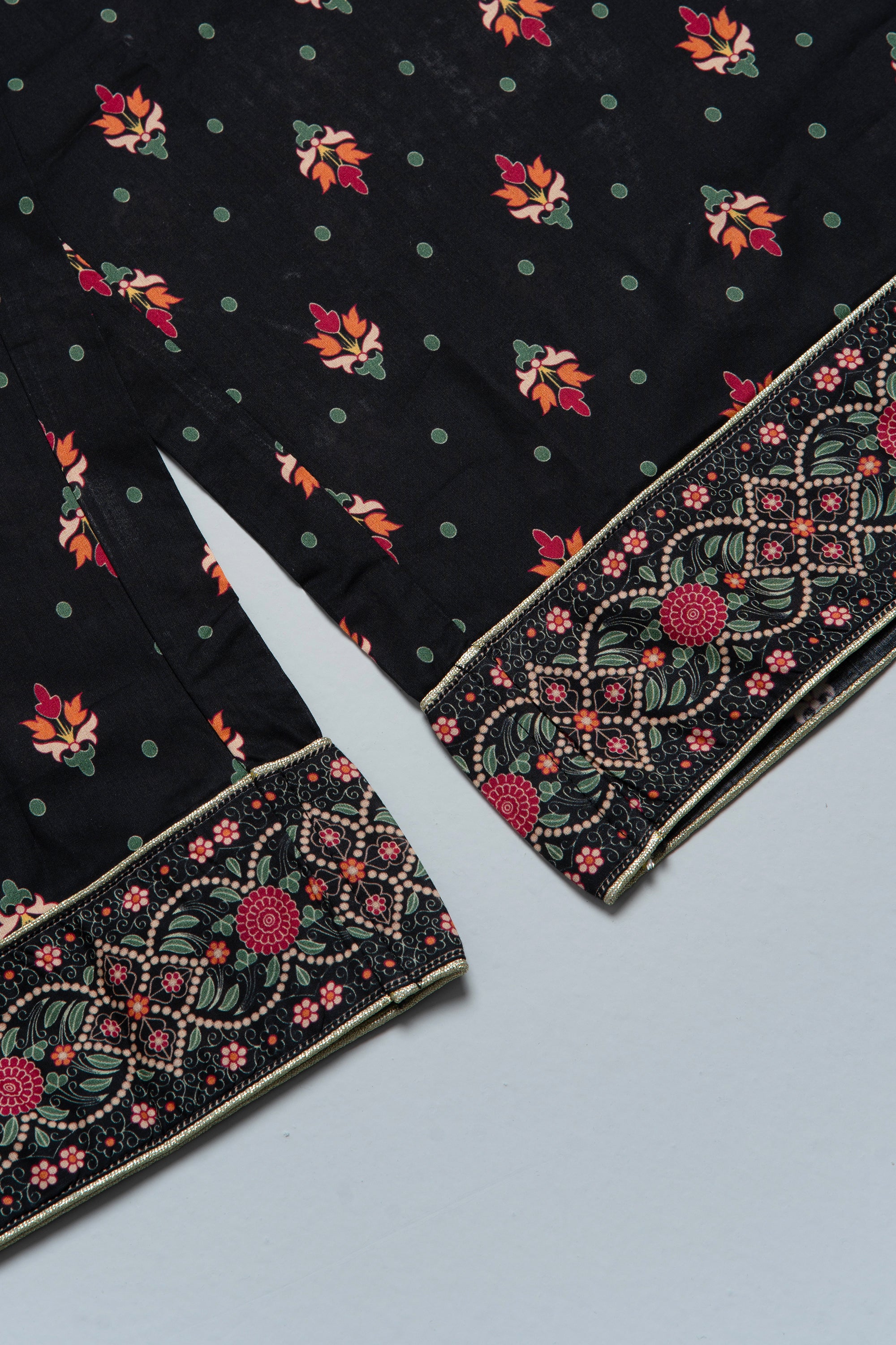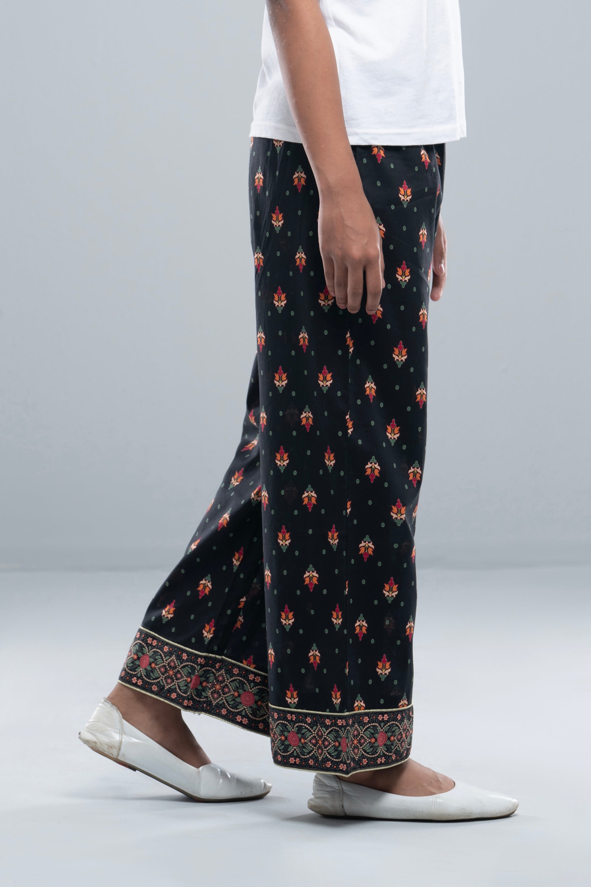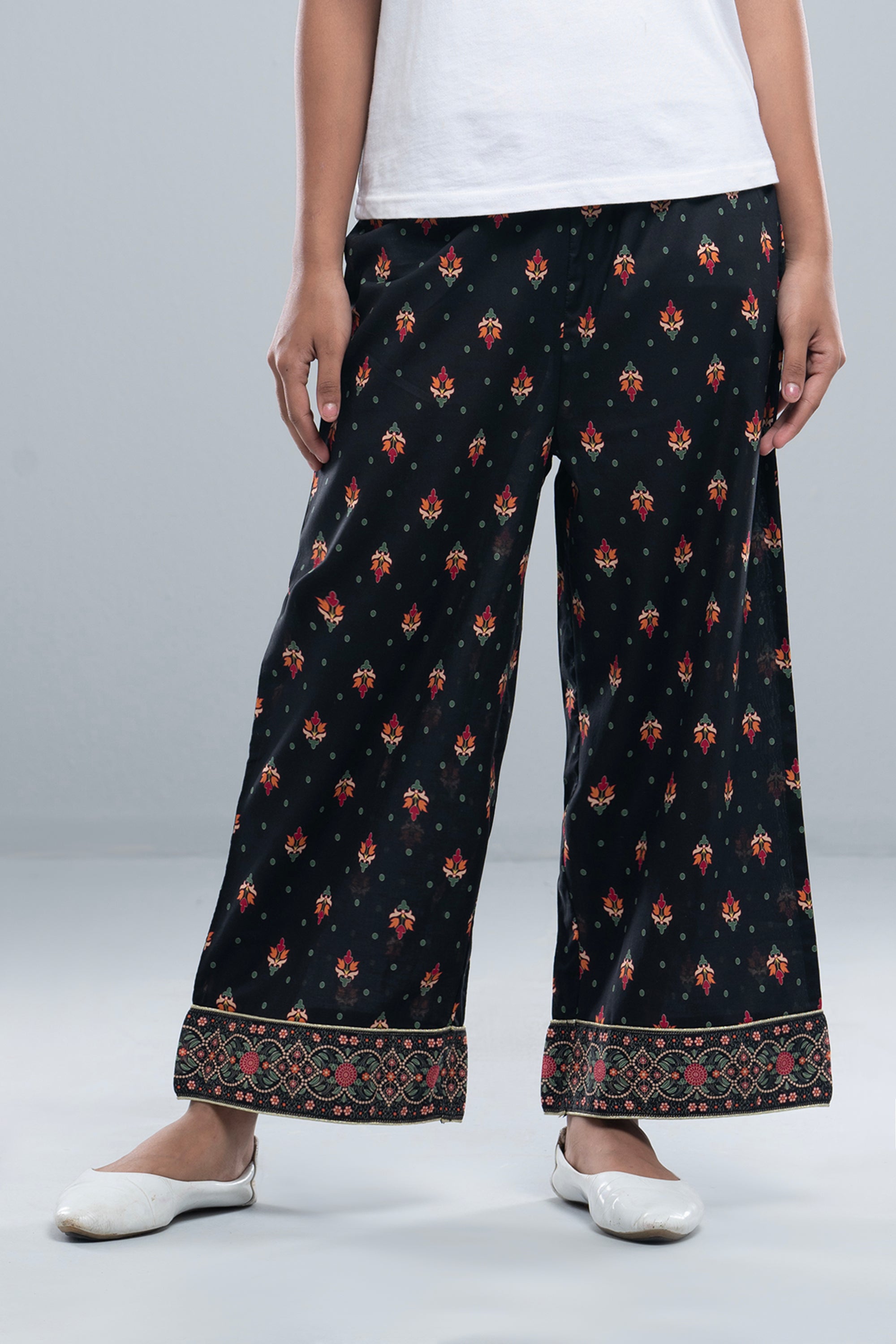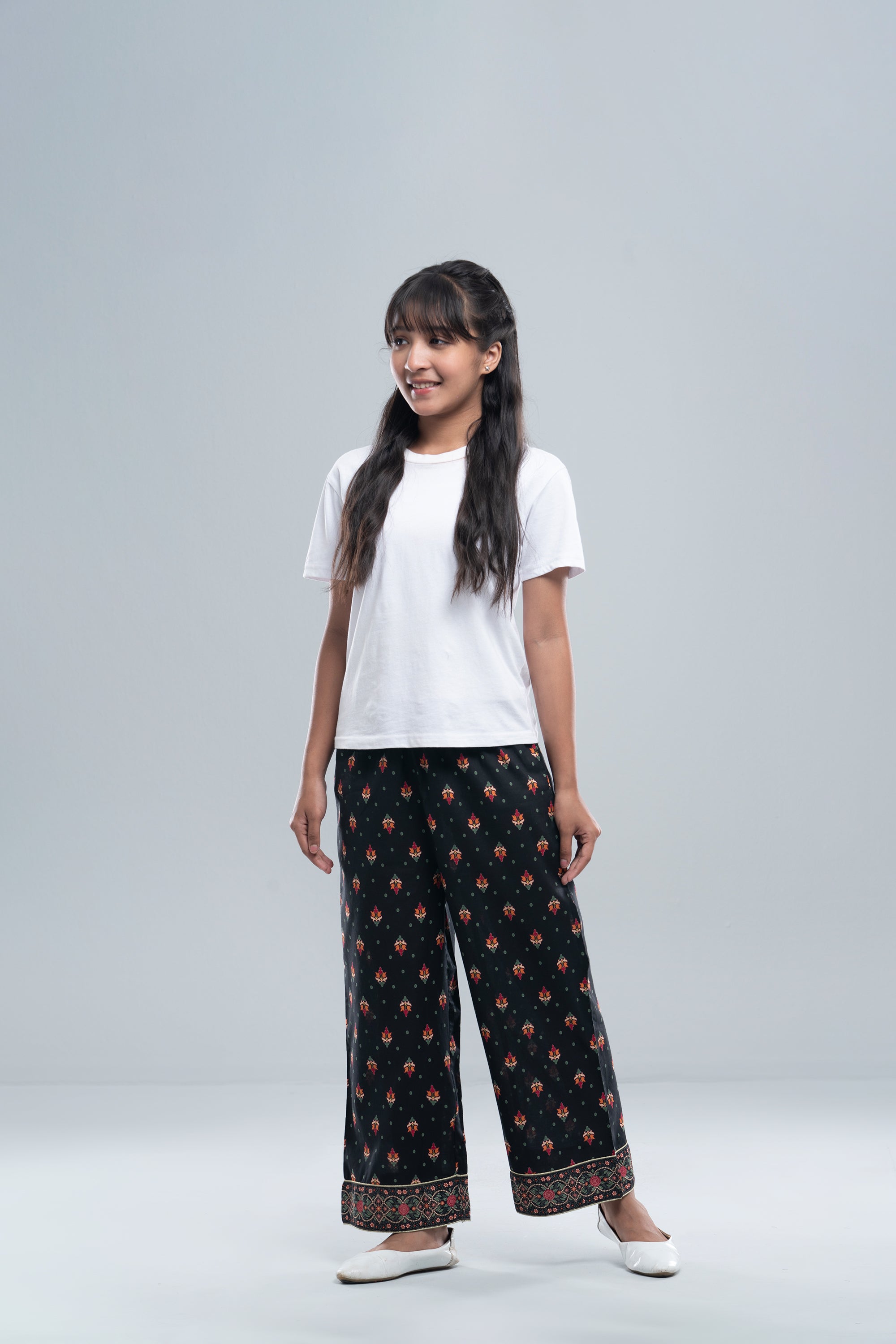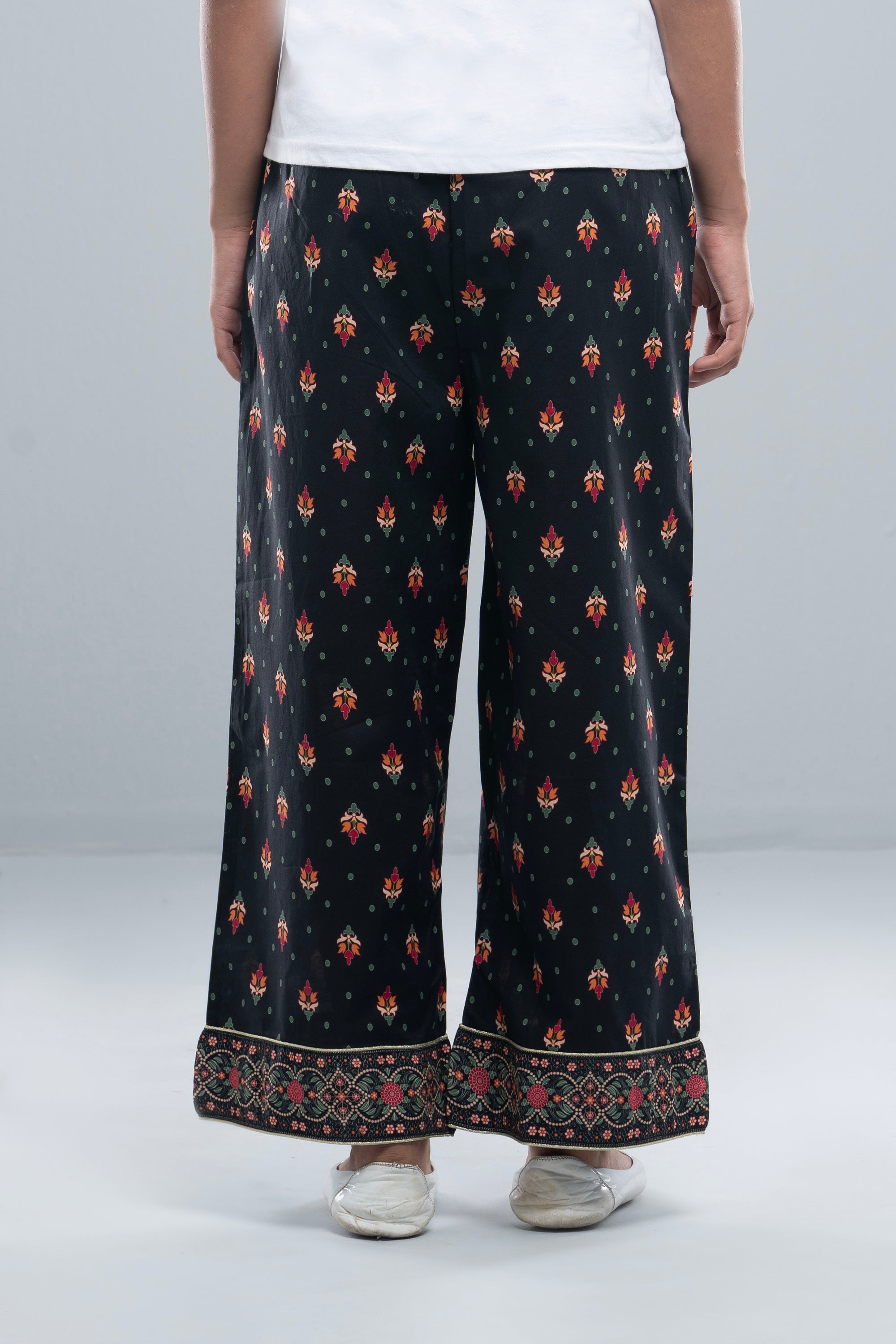 Add a pop of tradition to any outfit with these stylish wide-leg trousers. Crafted from soft, breathable cotton, they feature a vibrant all-over floral motif on a deep black base, finished with an intricate ethnic border at the hem. Perfect for pairing with tunics or kurtas for a comfortable, chic look.
