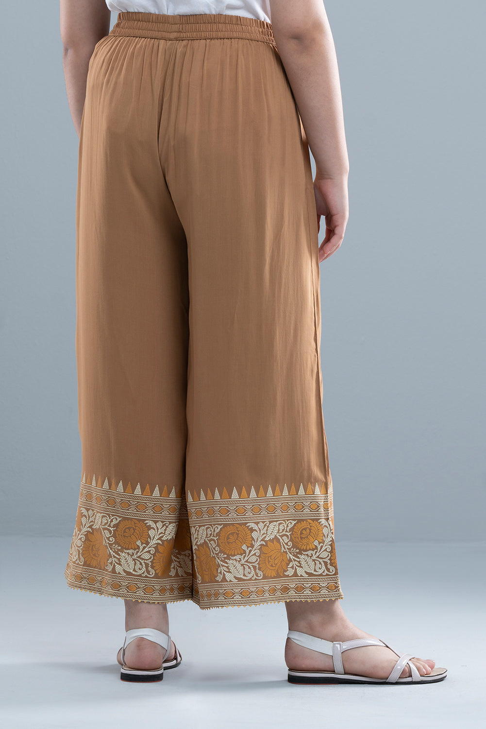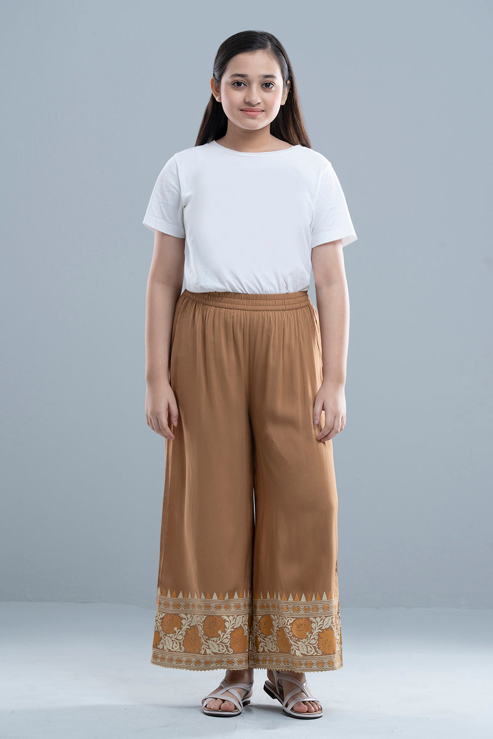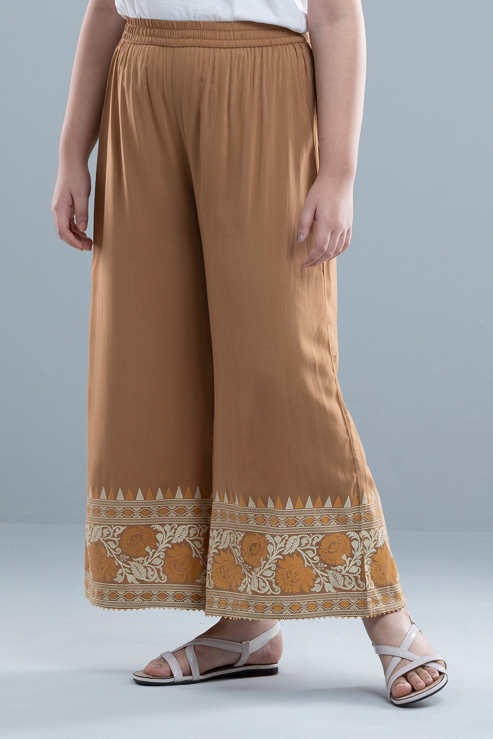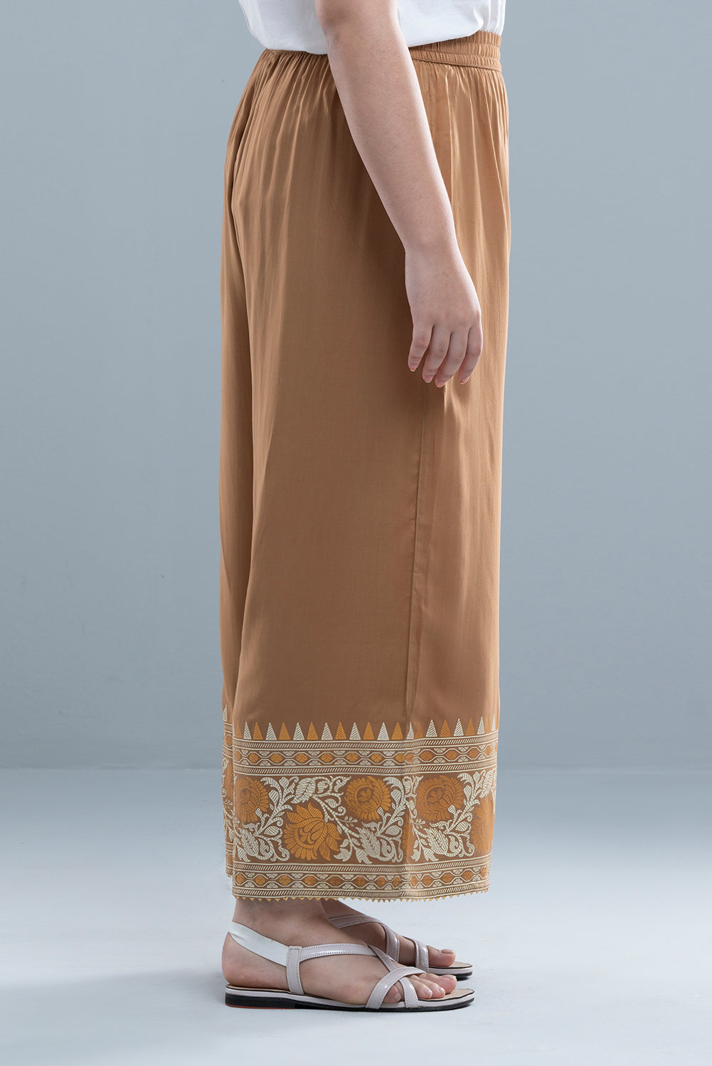 Soft and flowy viscose palazzo designed for all-day comfort. Features elegant prints at the hem and sides, adding a stylish touch to a classic silhouette. Perfect to pair with kurtis or tunics for a trendy look.