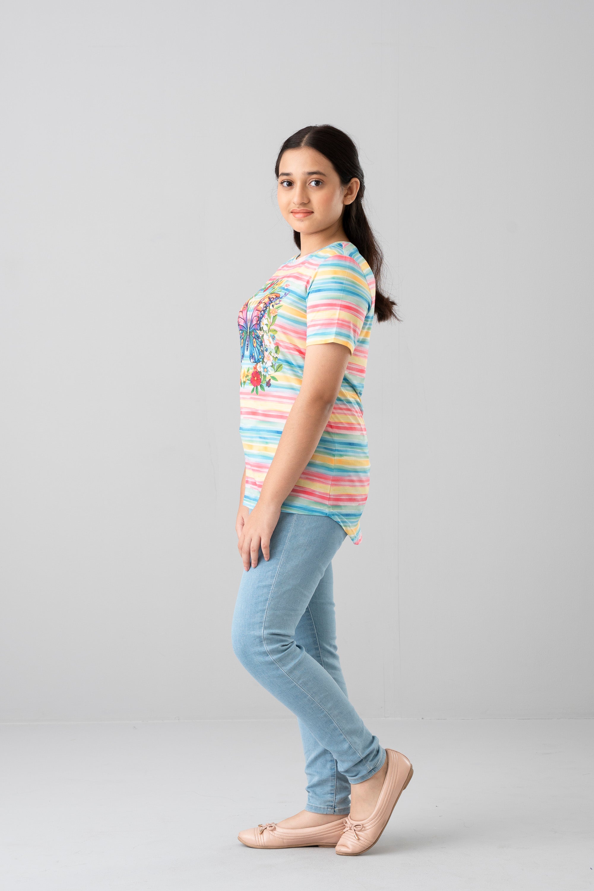 • Junior girls knit fashion tops with rainbow sublimation print.