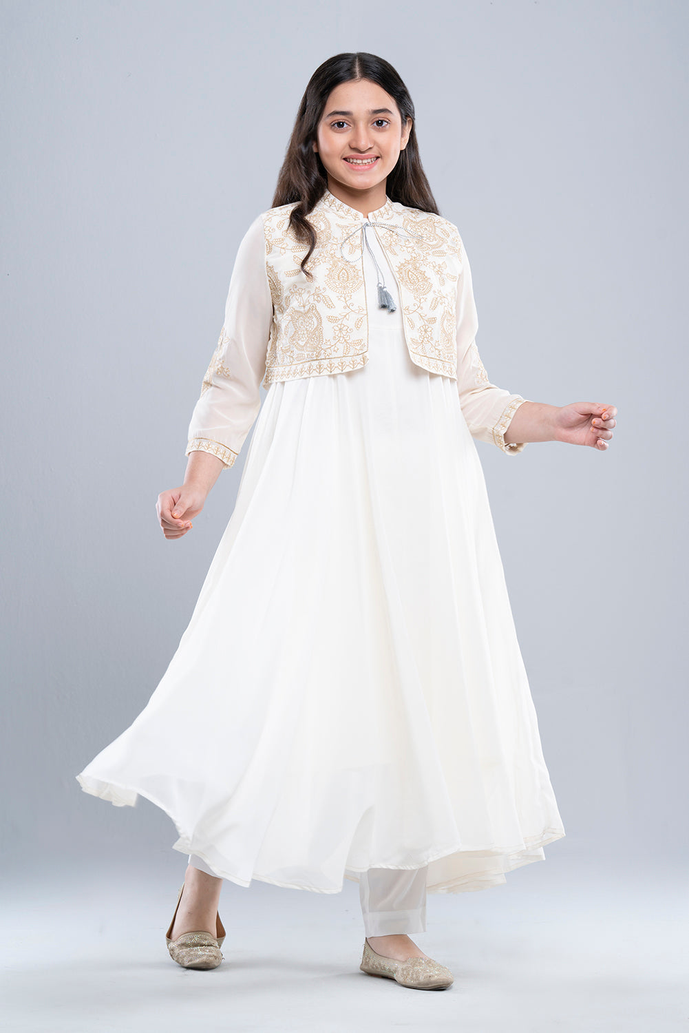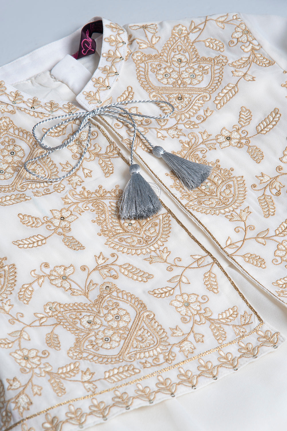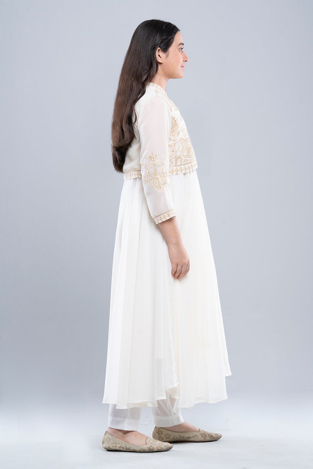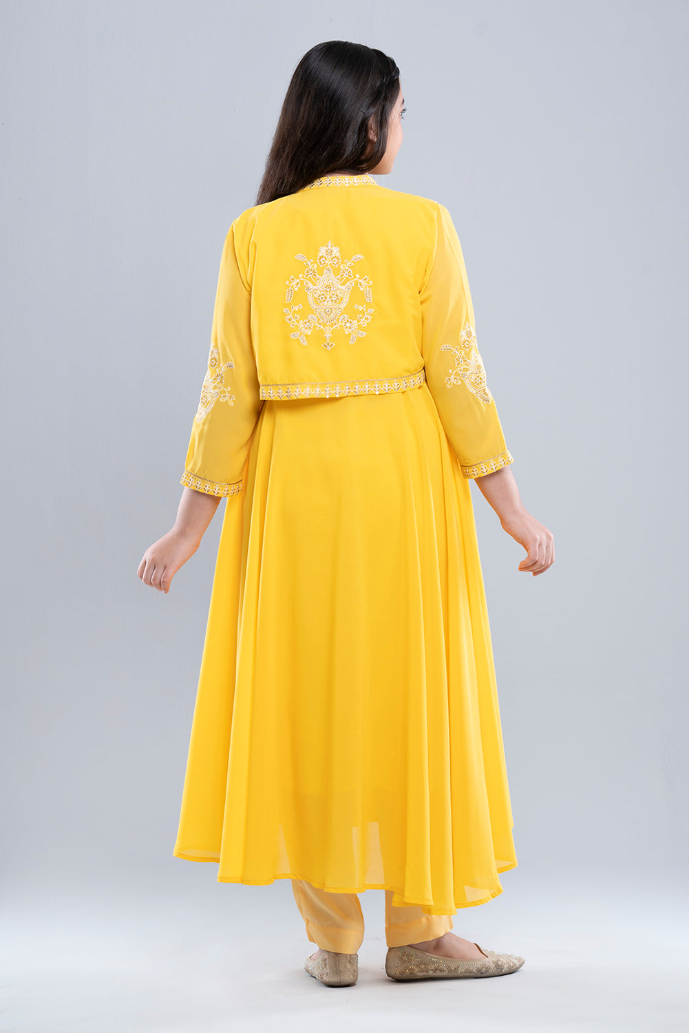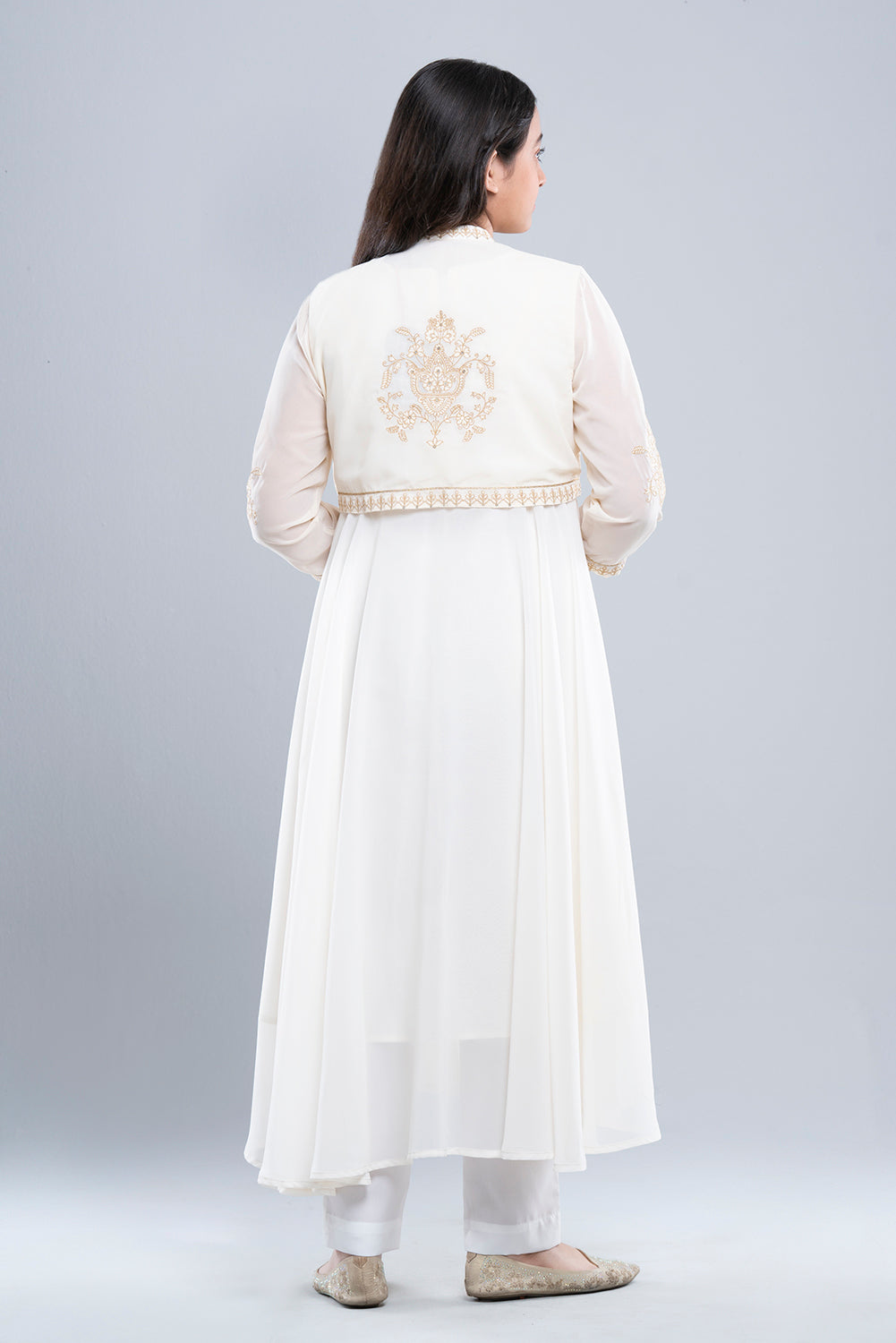 • 3 pieces - first one part is a waist coat with exclusive embroidery and the second part is a flared kurta with long length and a pajama.