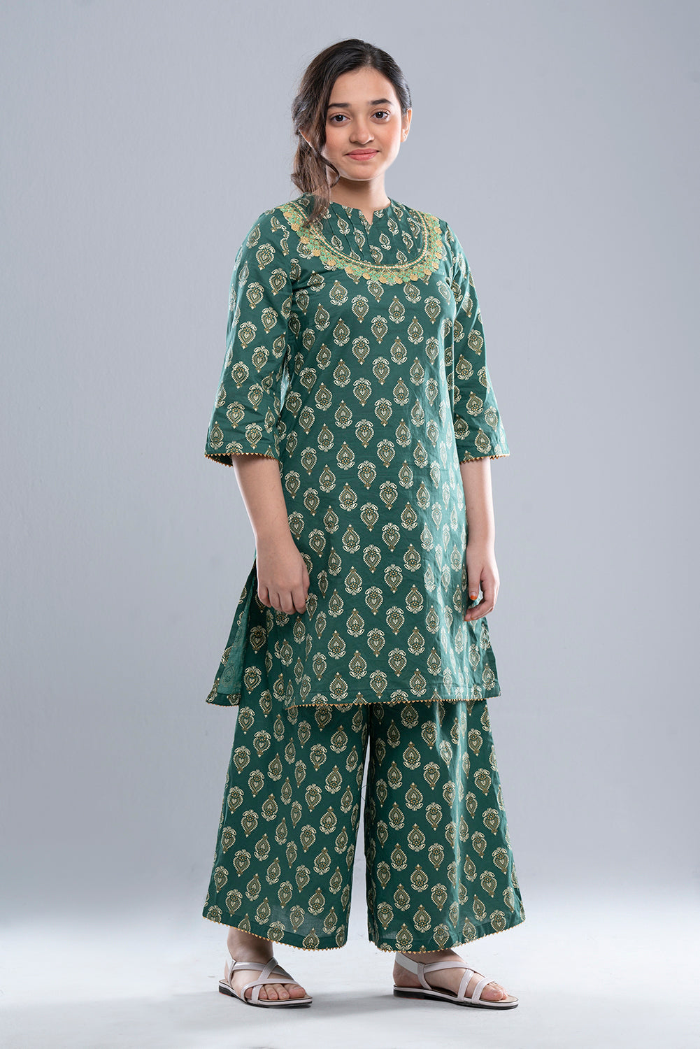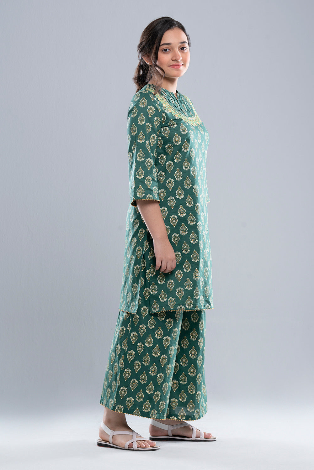 • Made of soft cotton lawn in green, adorned with all-over gold buti (paisley) print