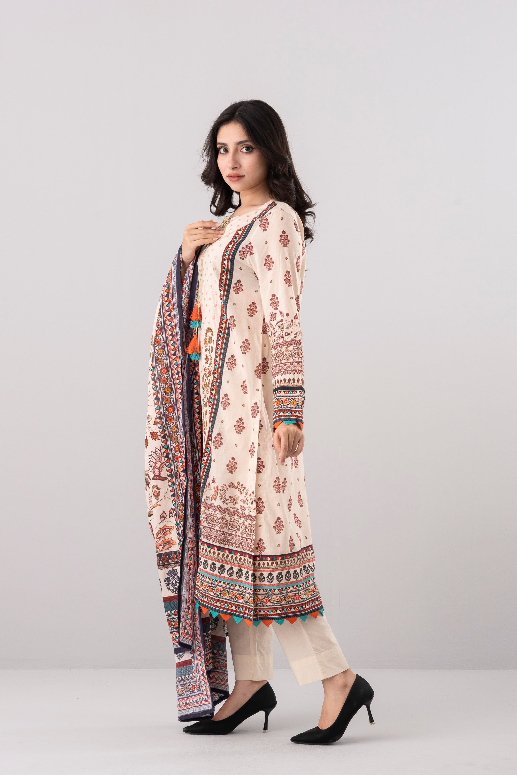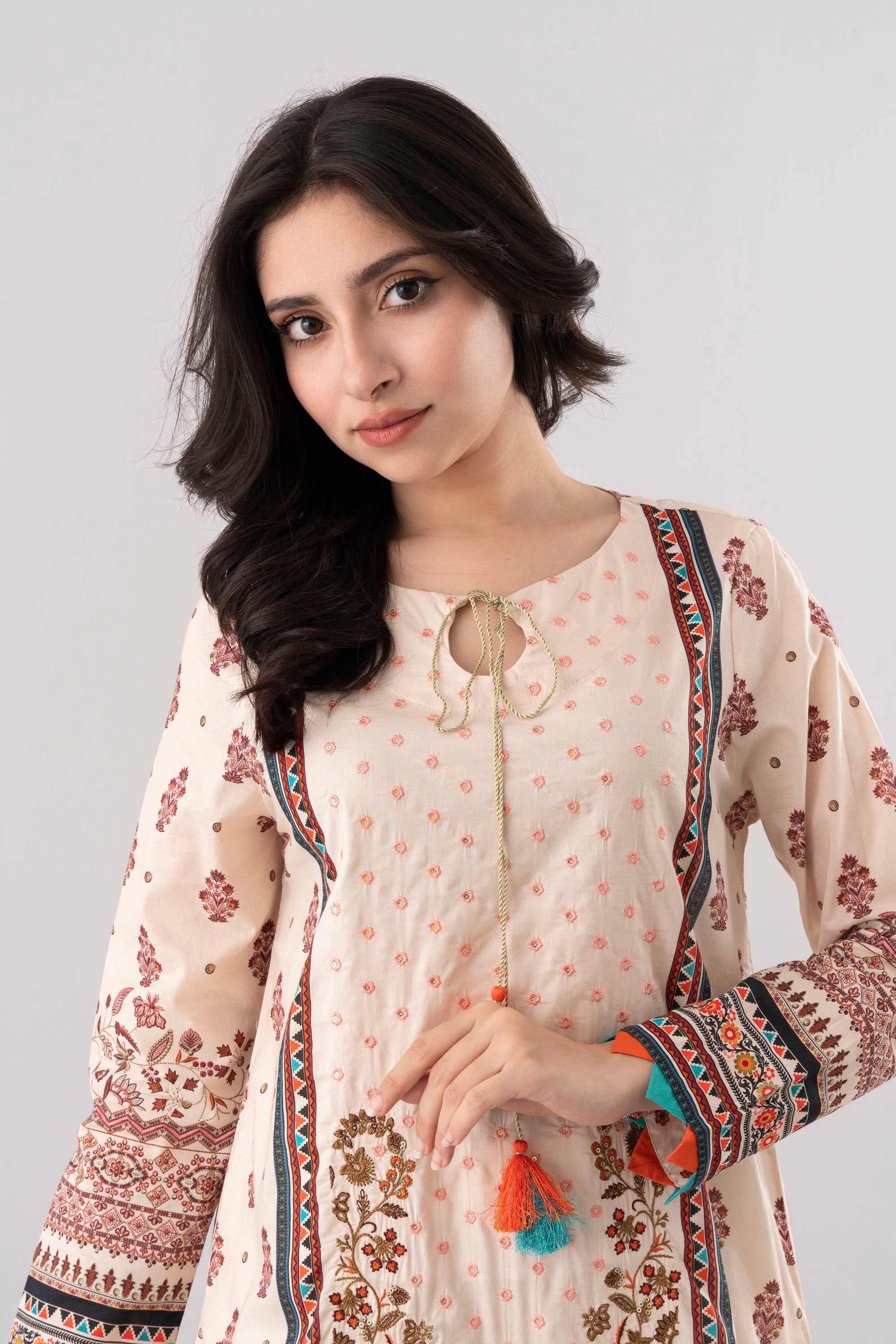 Enhance your style with our ready-to-wear 2-piece Lawn kameez suit, complemented by a cotton dupatta. The suit features full front embroidery, key hole, Contrast fabric triangle at sleeves and bottom hem, and decorative tassels detailing. Creating a refined and elegant look. perfect for special occasions or to add refined charm to your everyday style.
