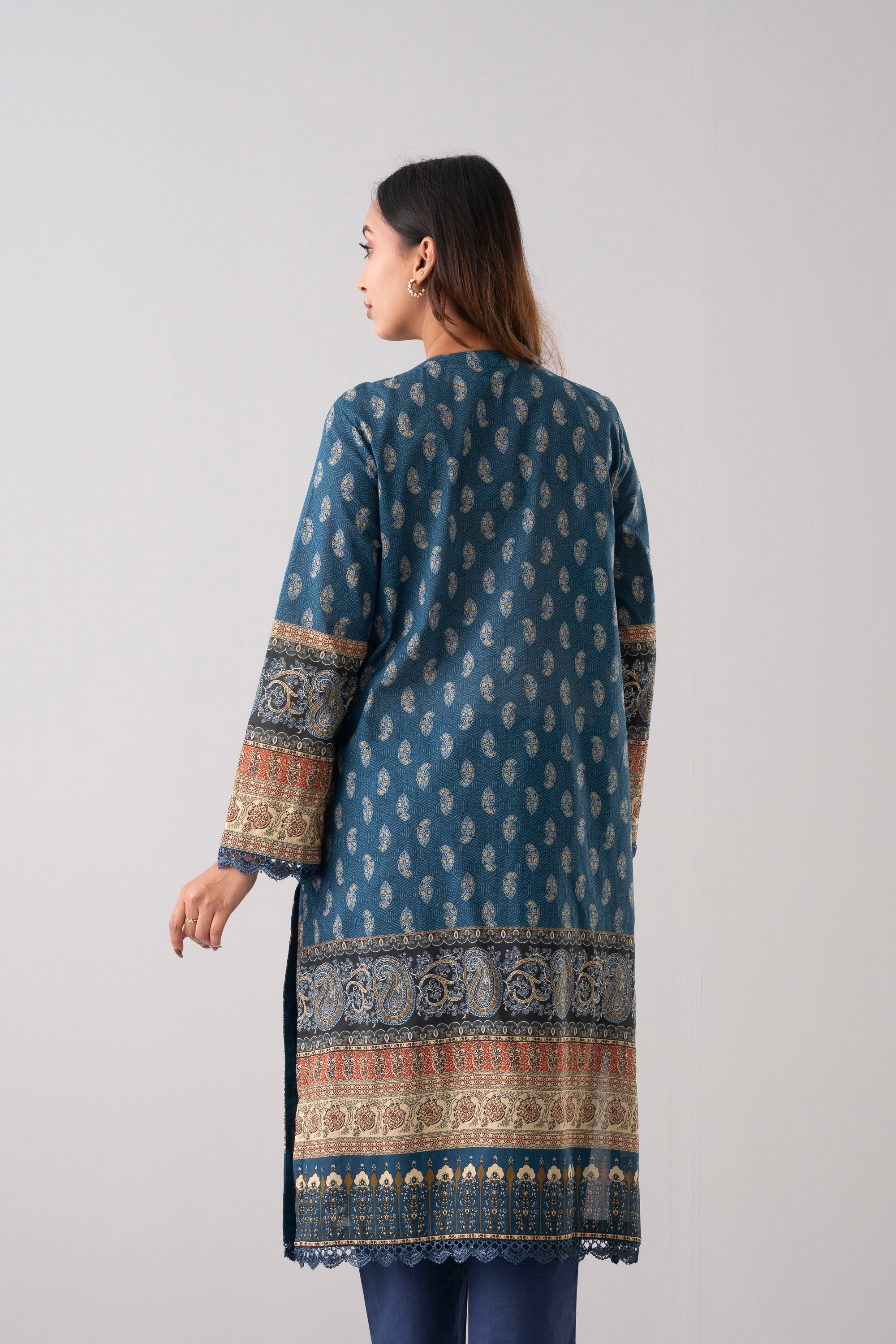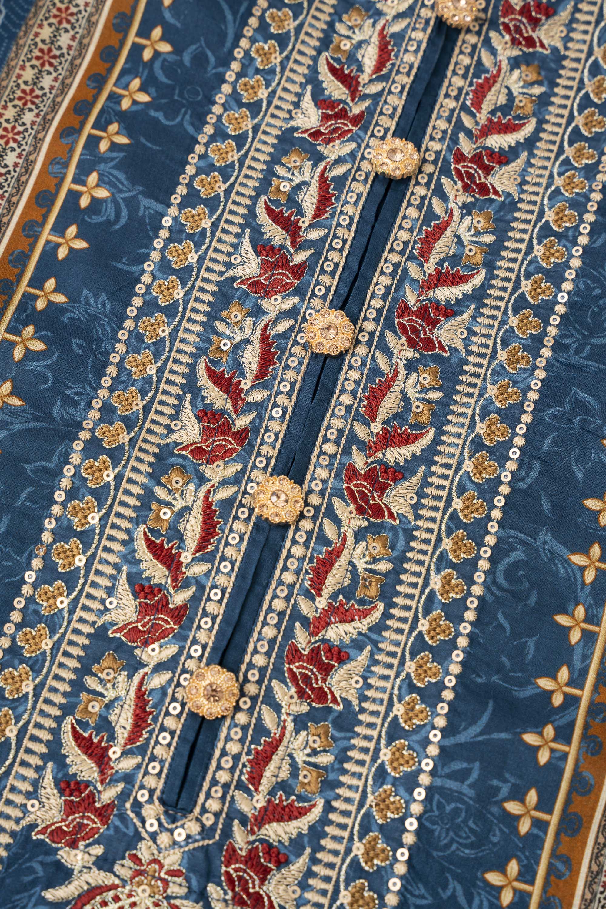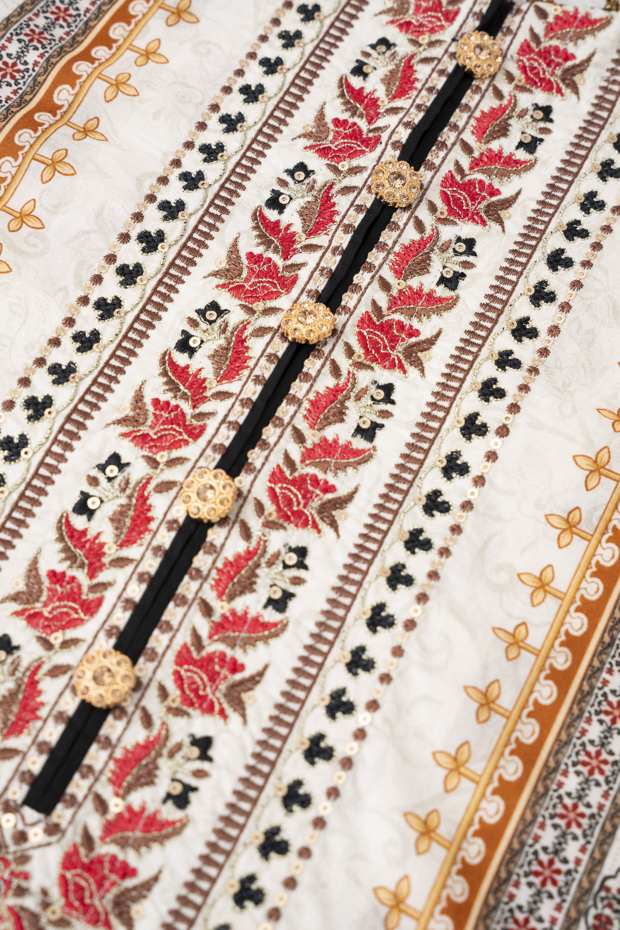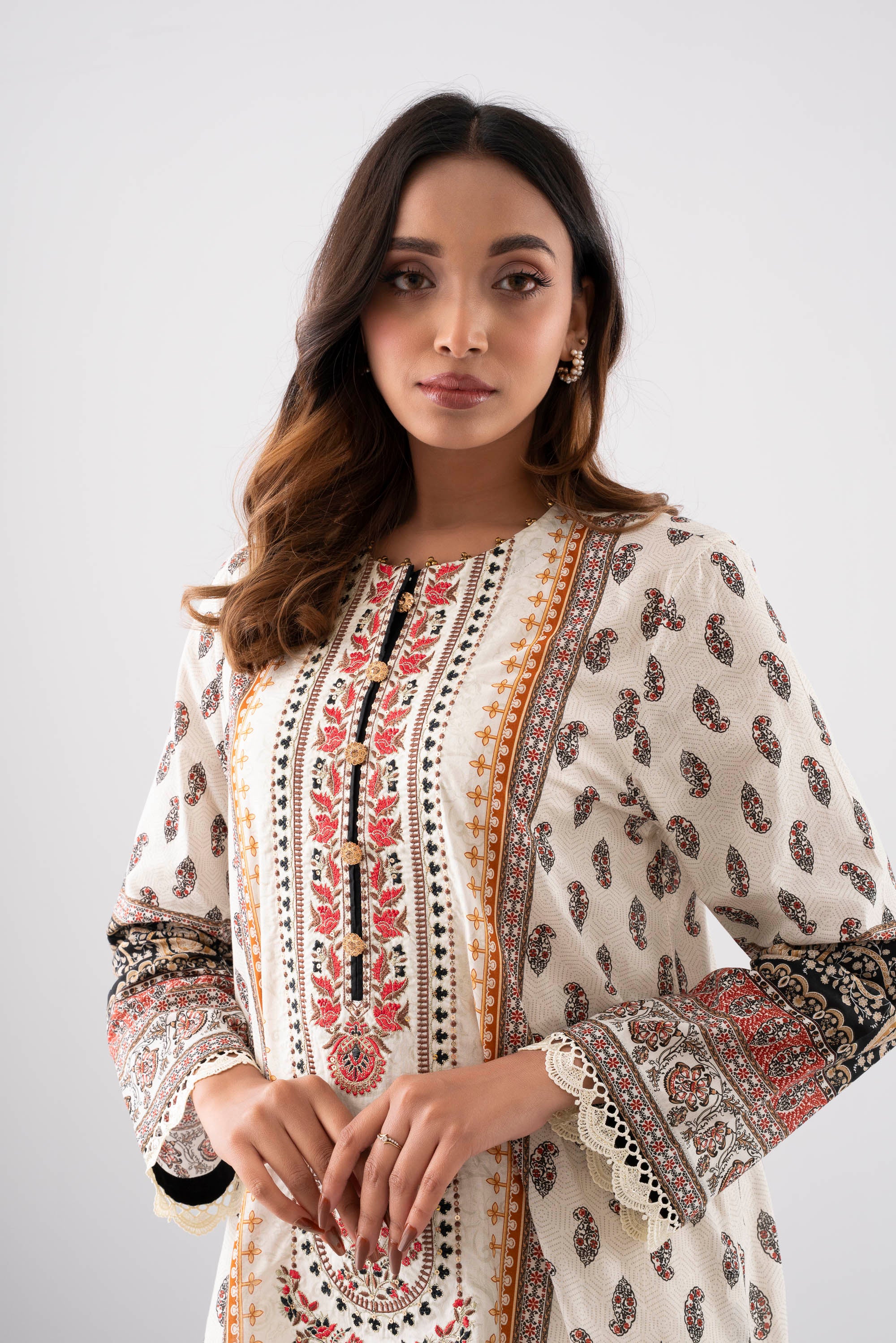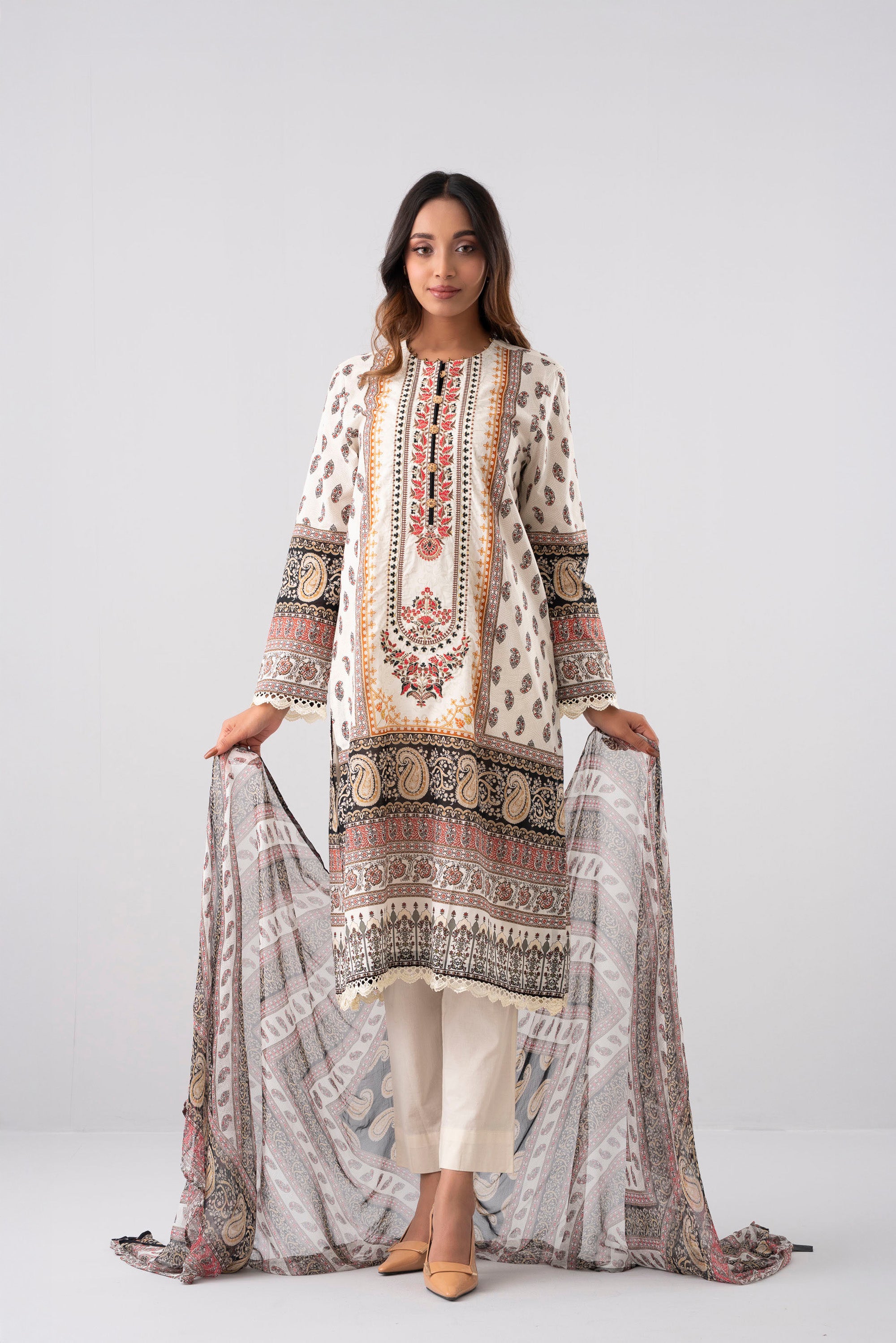 Elevate your everyday style with our ready-to-wear 2-piece lawn suit, featuring a beautifully printed lawn kameez adorned with embroidery at neck, solid contrast piping, decorative buttons, beads and sequin lace for added charm. Paired with a digitally printed chiffon dupatta,this ensemble is perfect for festive occasions or for bringing sophisticated elegance to your everyday wardrobe.