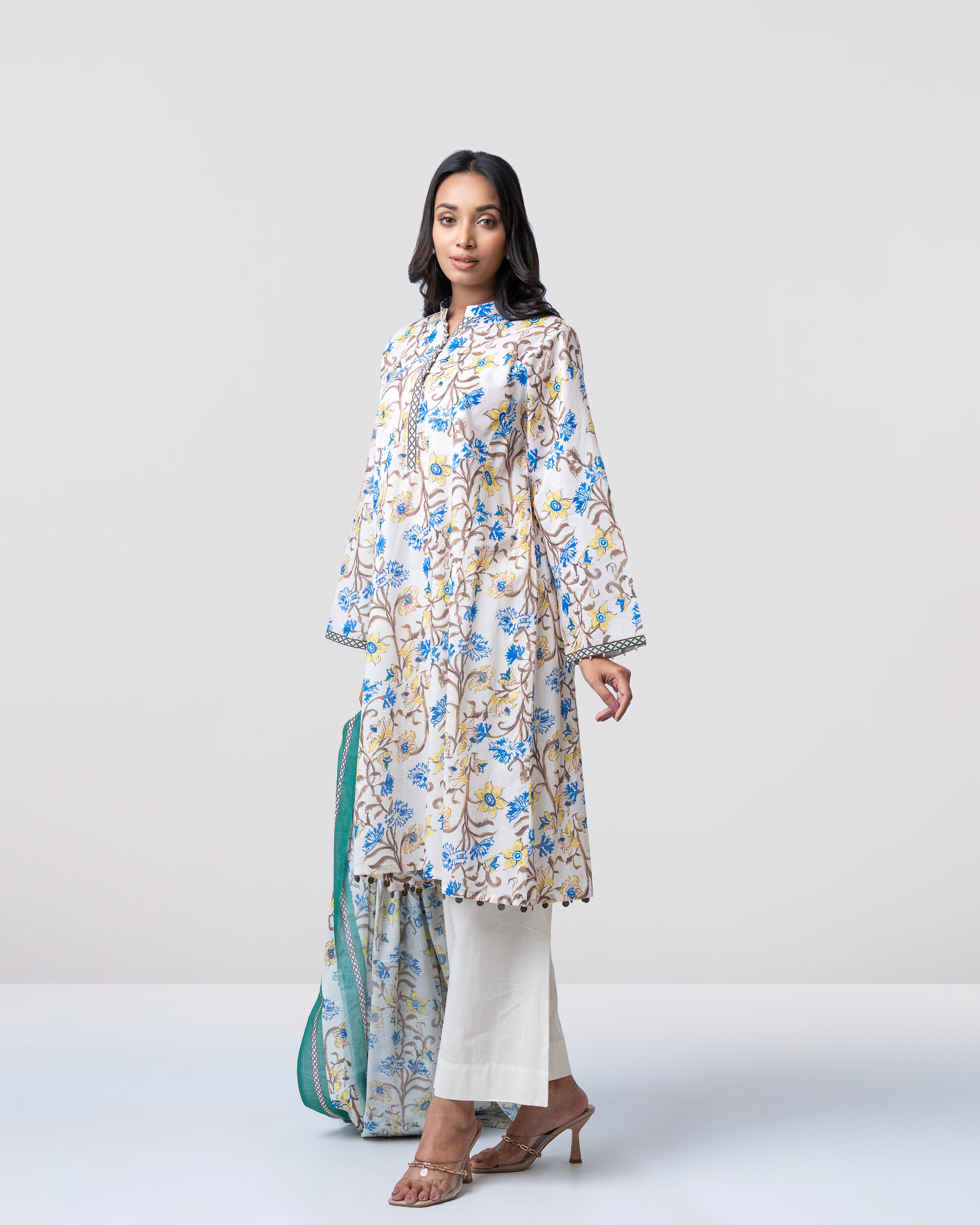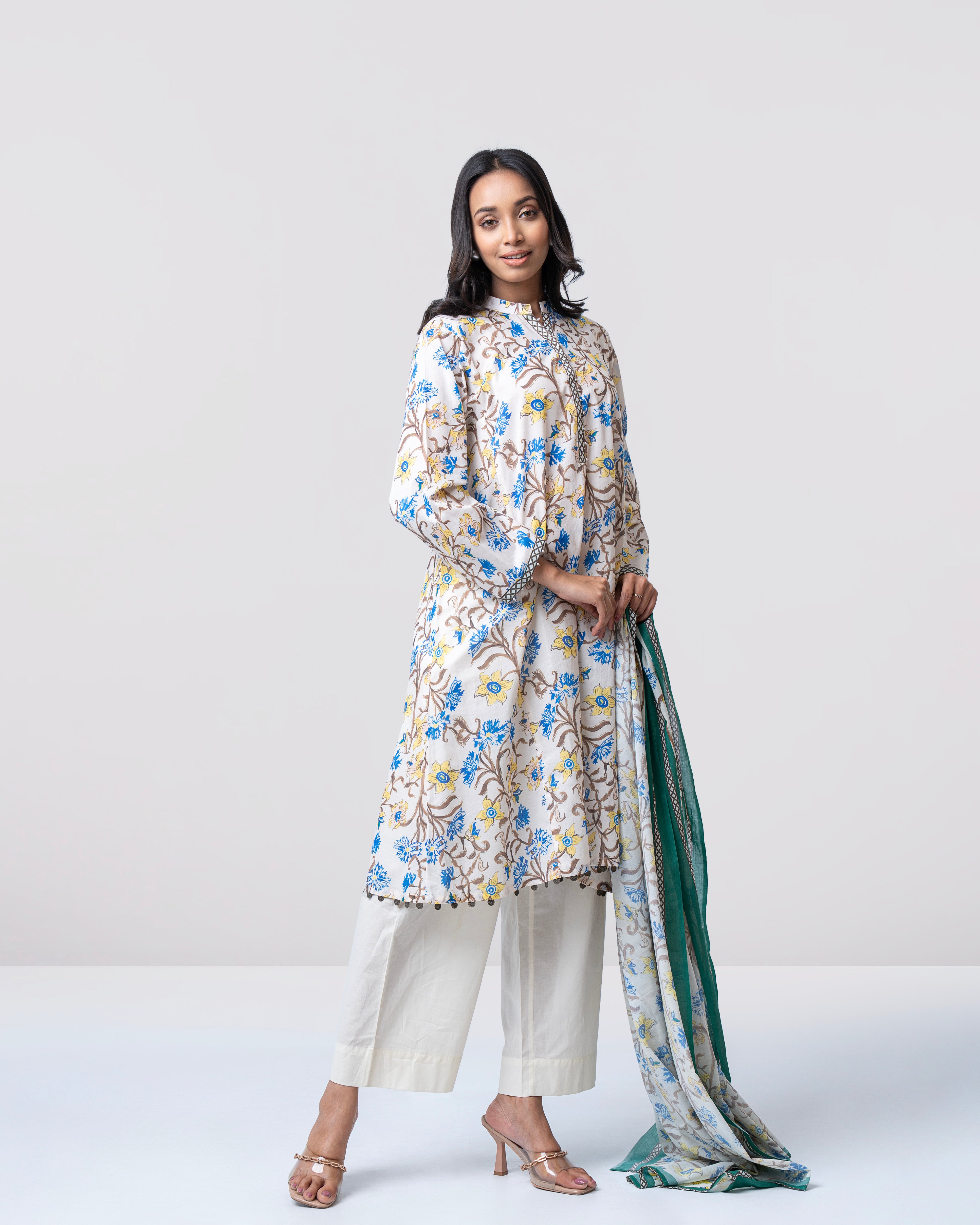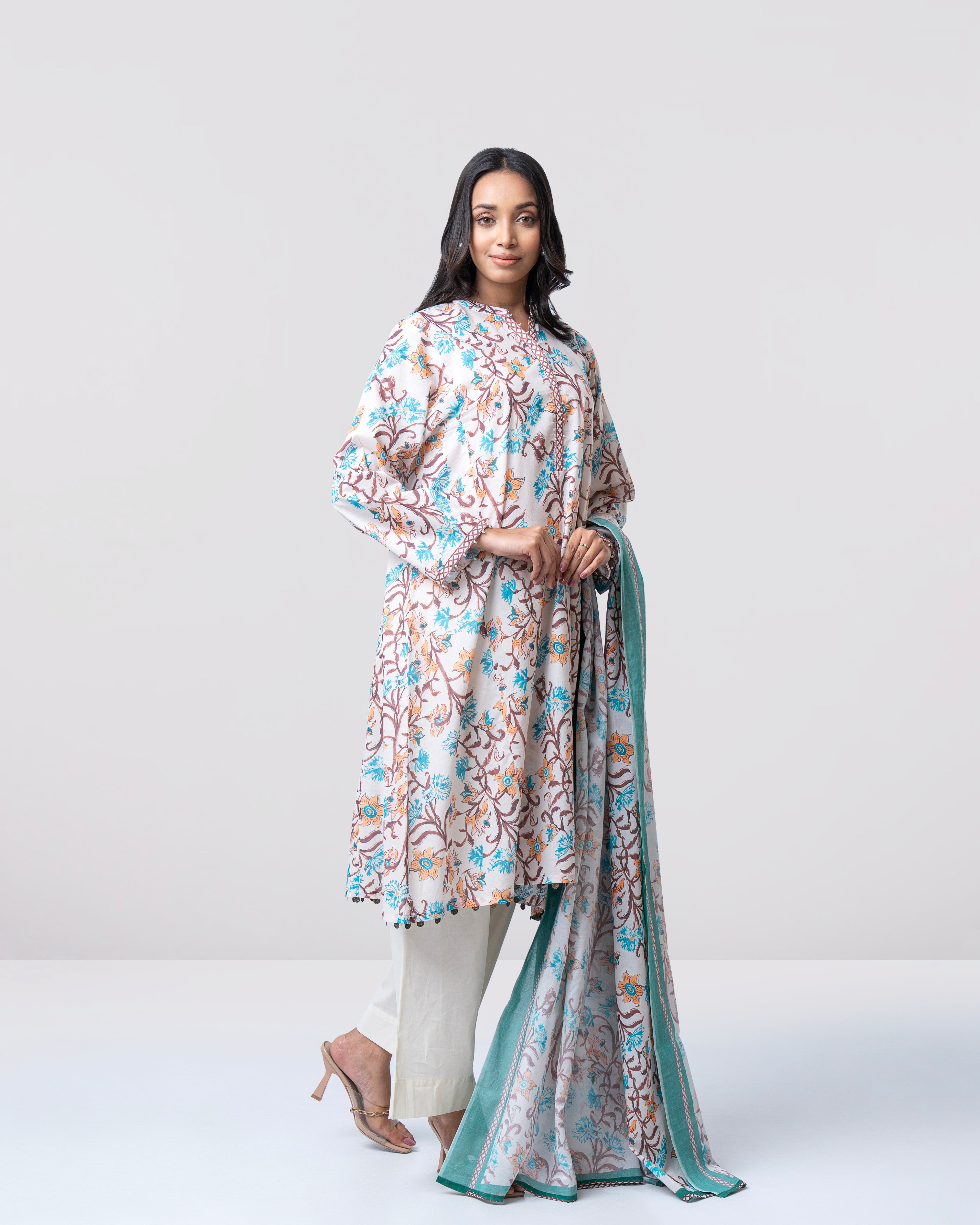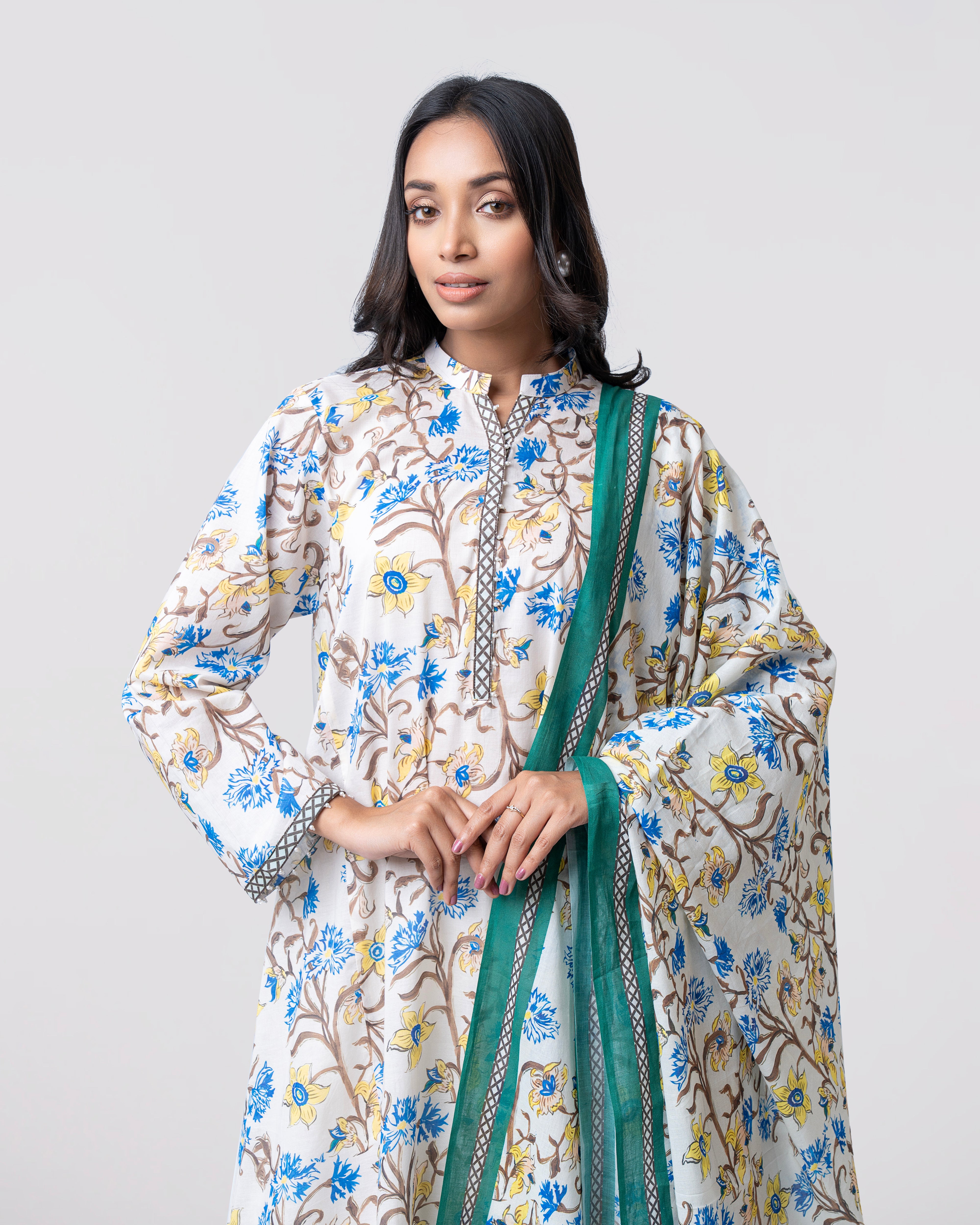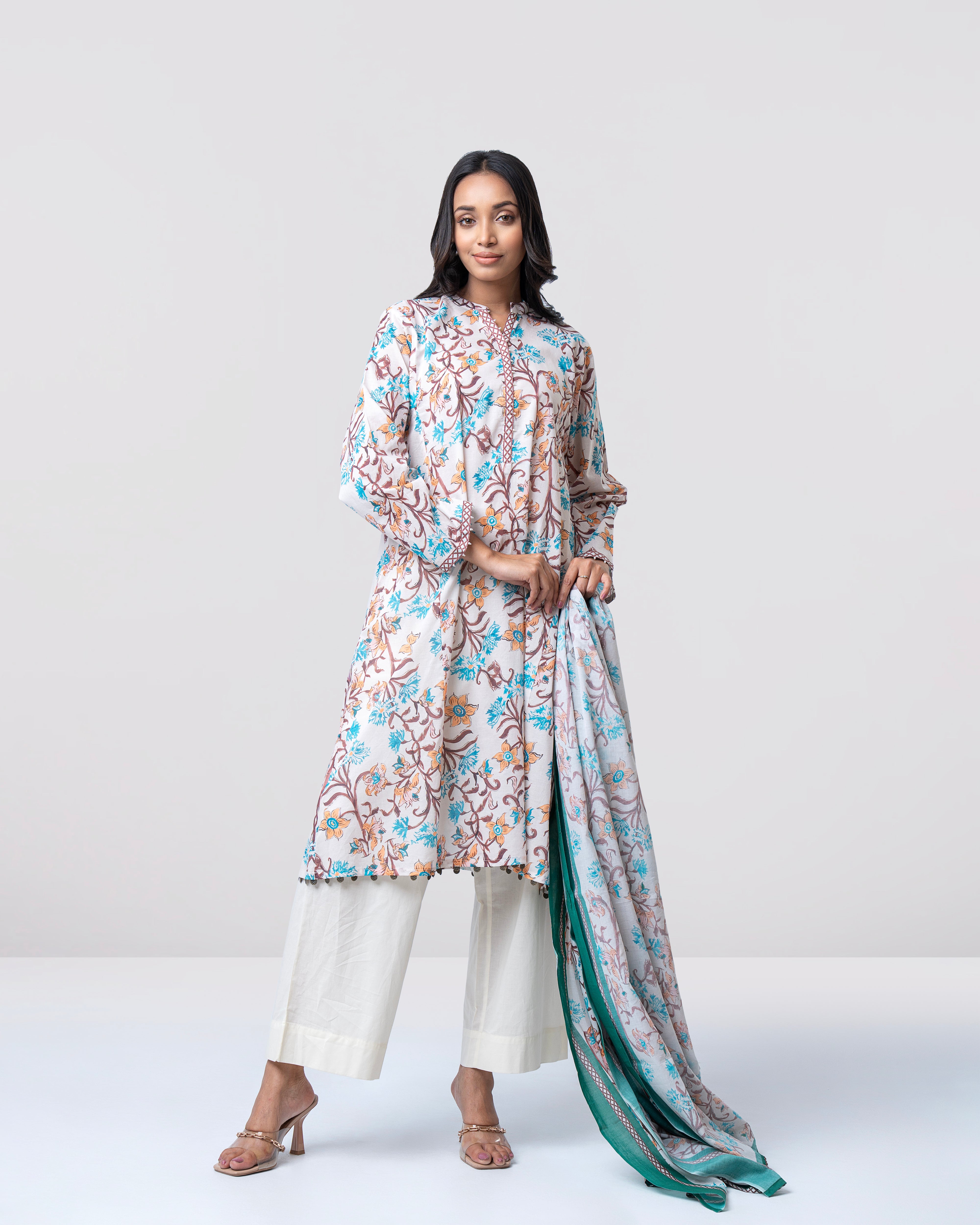 Elevate your everyday style with our ready-to-wear 2-piece lawn suit, featuring a beautifully printed lawn kameez adorned with delicate printed placket and pearl detailing. Paired with a digitally printed cotton dupatta, this ensemble is perfect for festive occasions or for bringing sophisticated elegance to your everyday wardrobe.