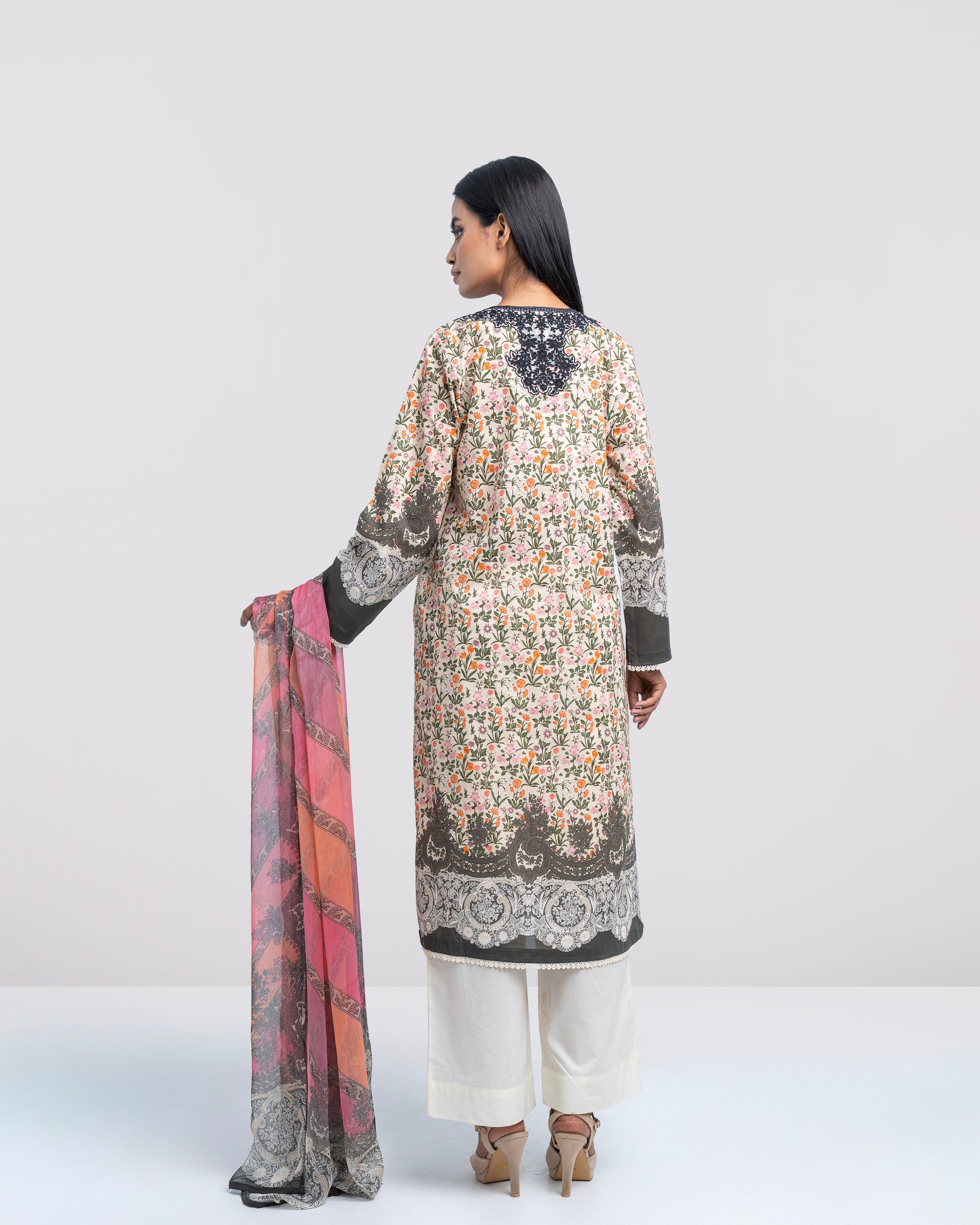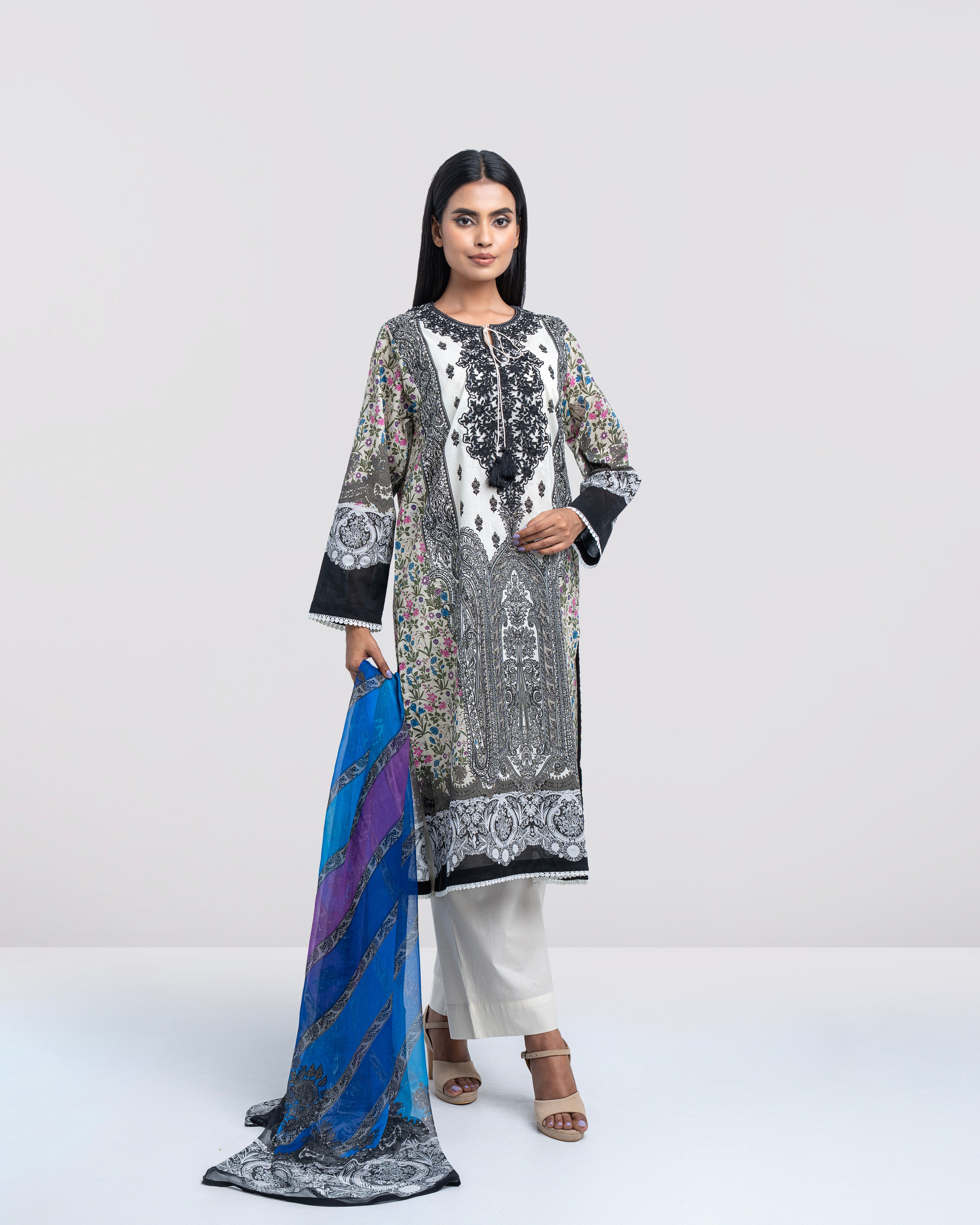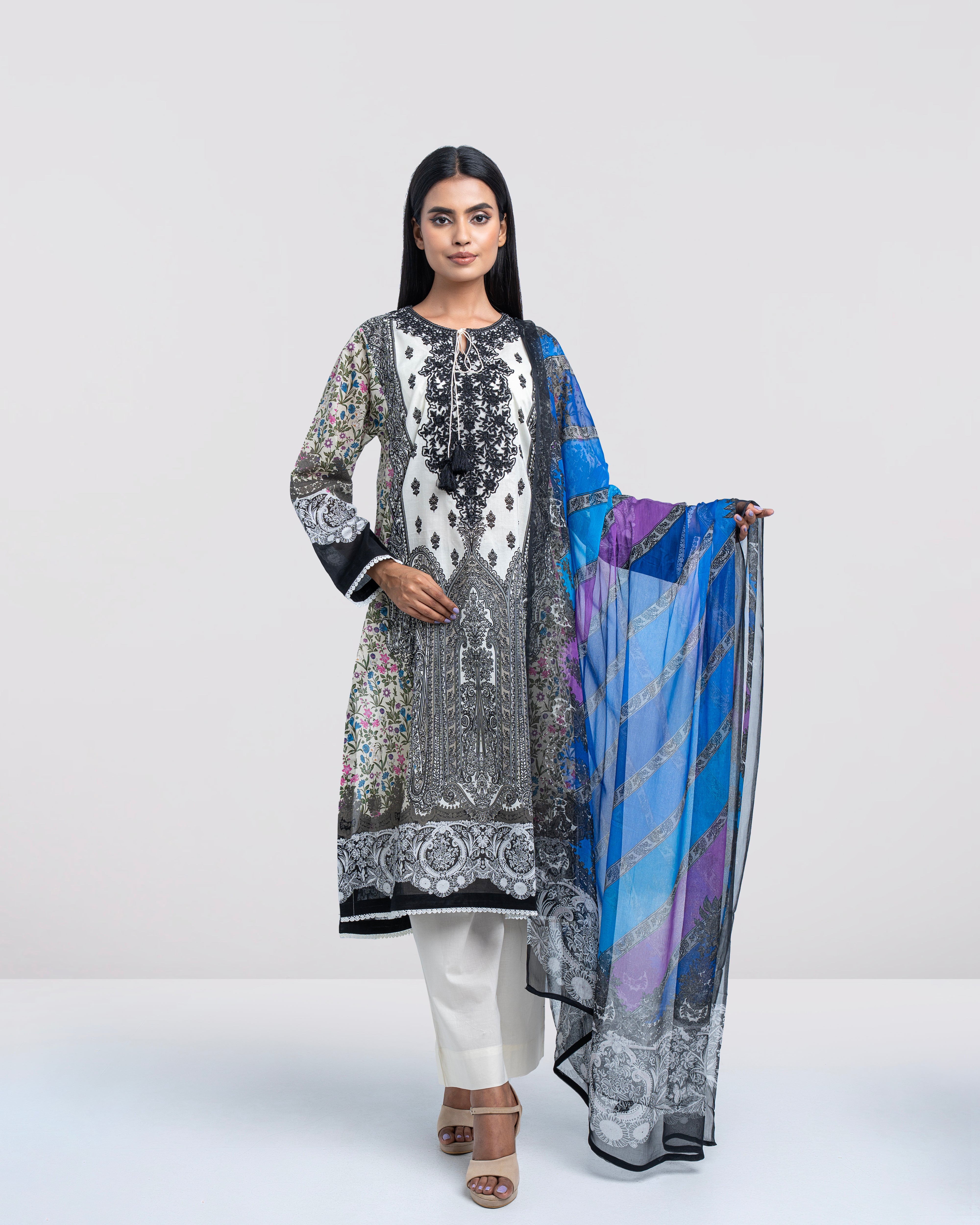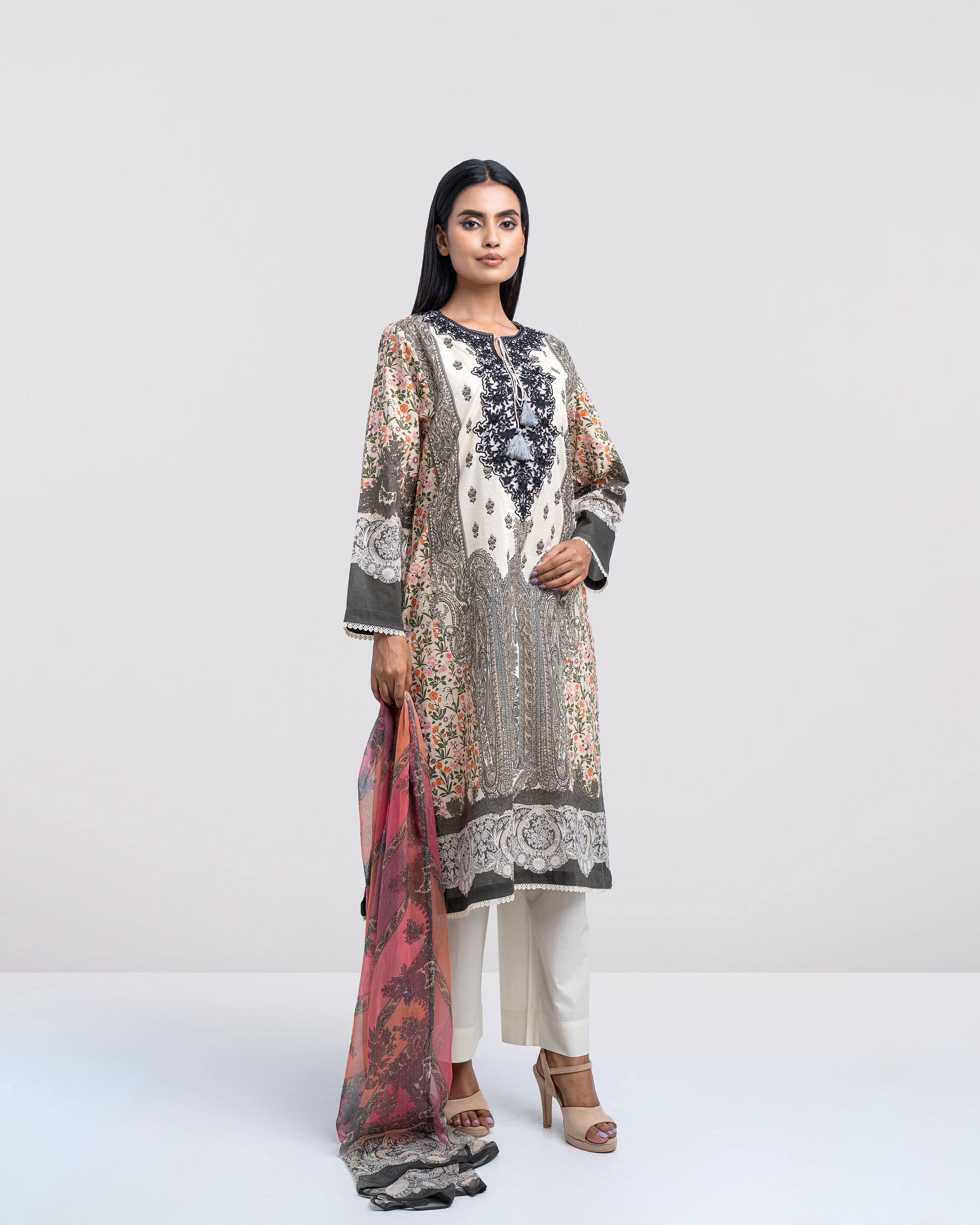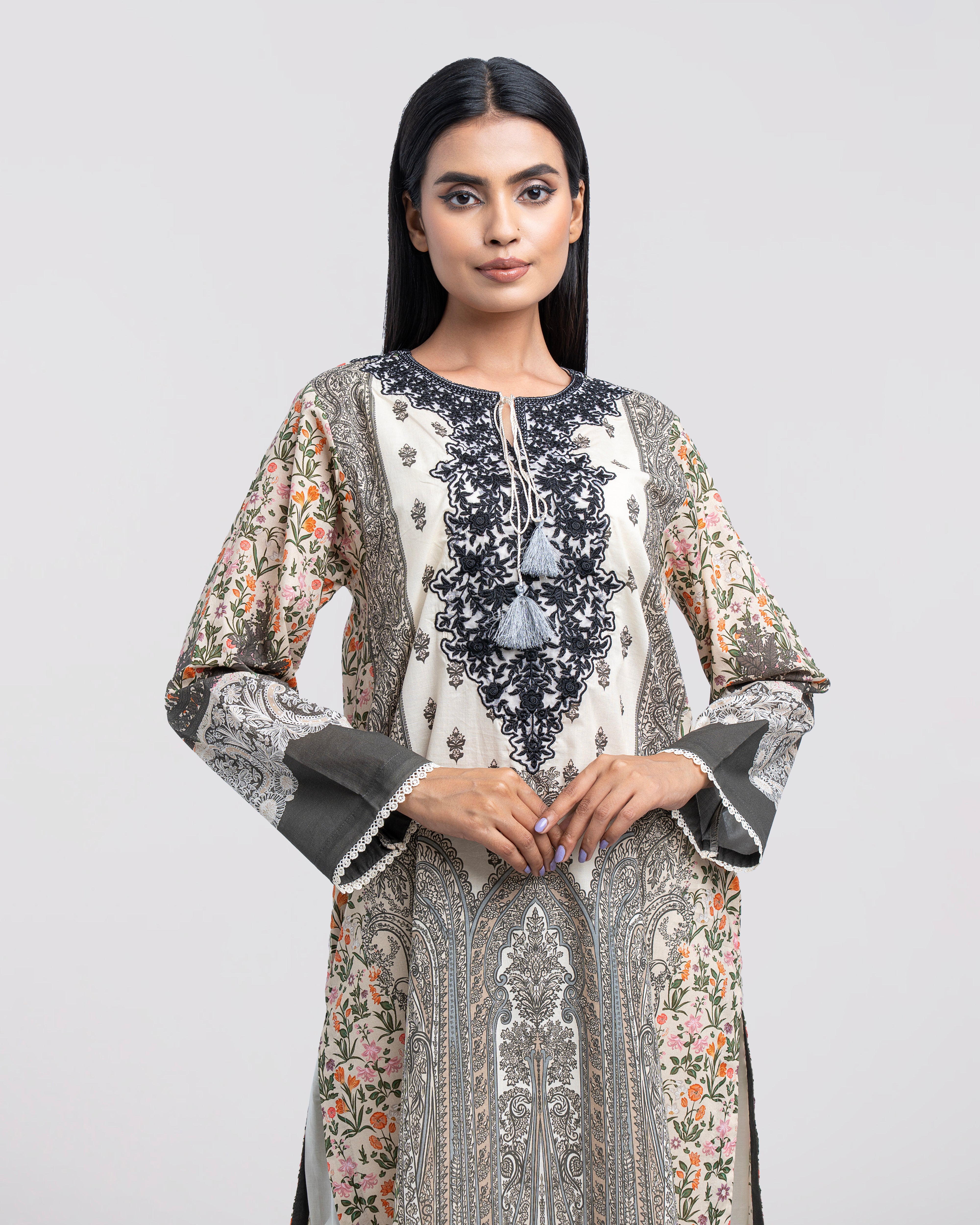 Elevate your elegance with our ready-to-wear 2-piece digitally printed lawn kameez suit, paired with a graceful chiffon dupatta. Designed with a round neck, beautifully embellished with contrast embroidery patch on organza, decorative tassels this ensemble offers a refined and feminine look. The sleeves are enhanced with lace detailing, adding a subtle festive touch. Tailored in a relaxed-fit silhouette, it is perfect for both special occasions and elegant everyday wear.
