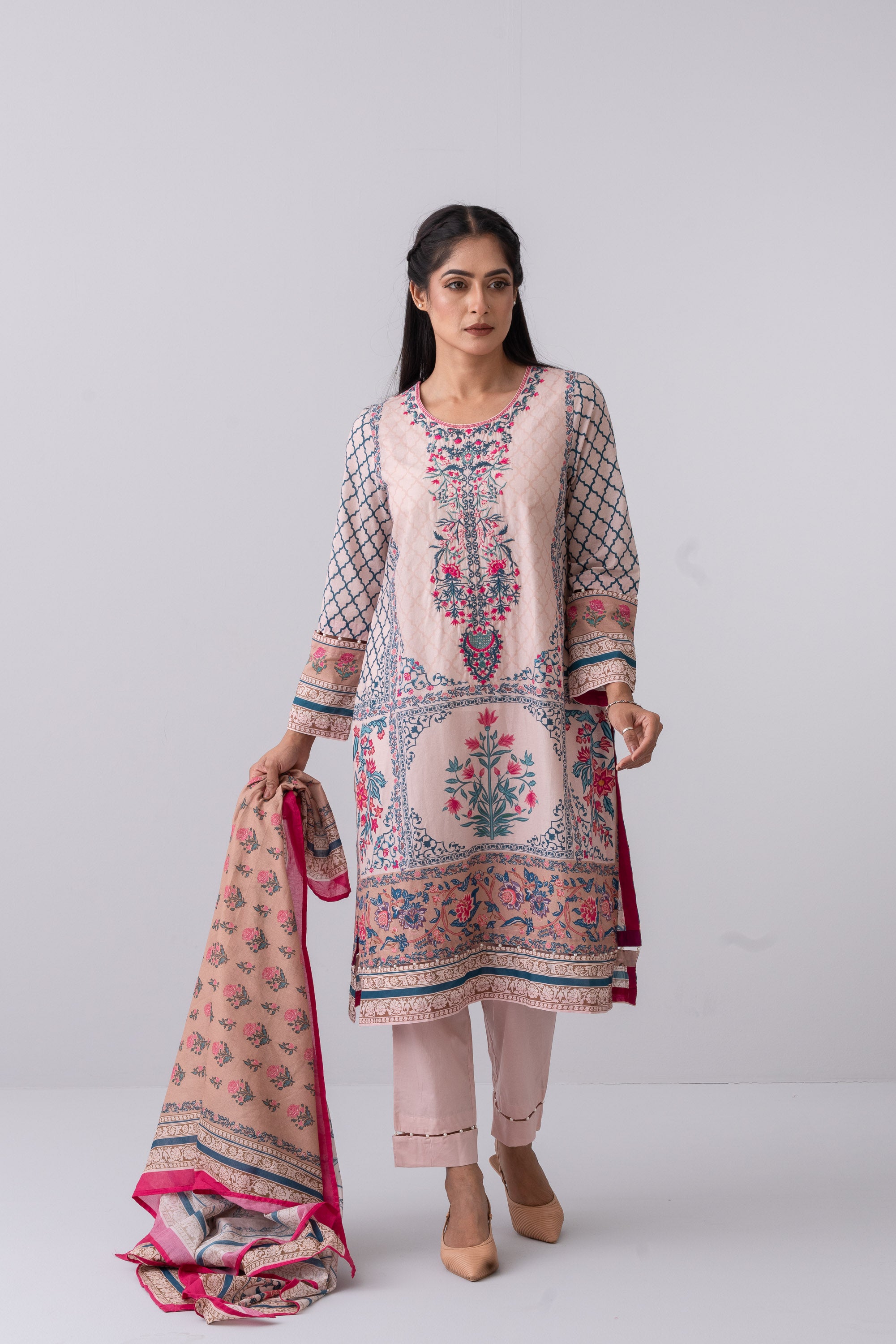 Elevate your elegance with our stunning ready-to-wear 3 Piece Lawn Salwar Kameez Suit with cotton dupatta and solid dyed trouser embellished with embroidery and pearls detailing that exudes elegance and sophistication, perfect for special occasions or adds luxury to your everyday wardrobe.