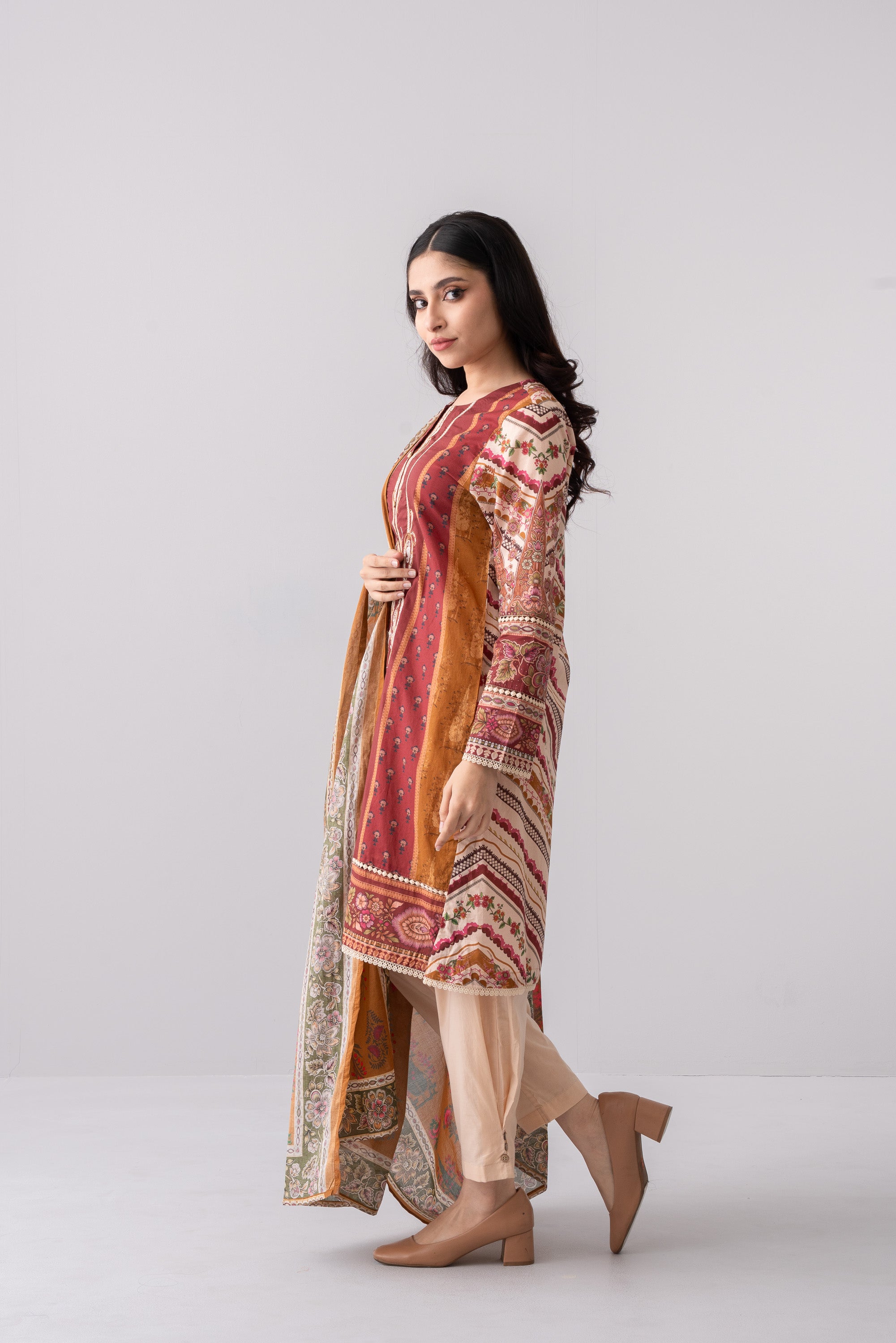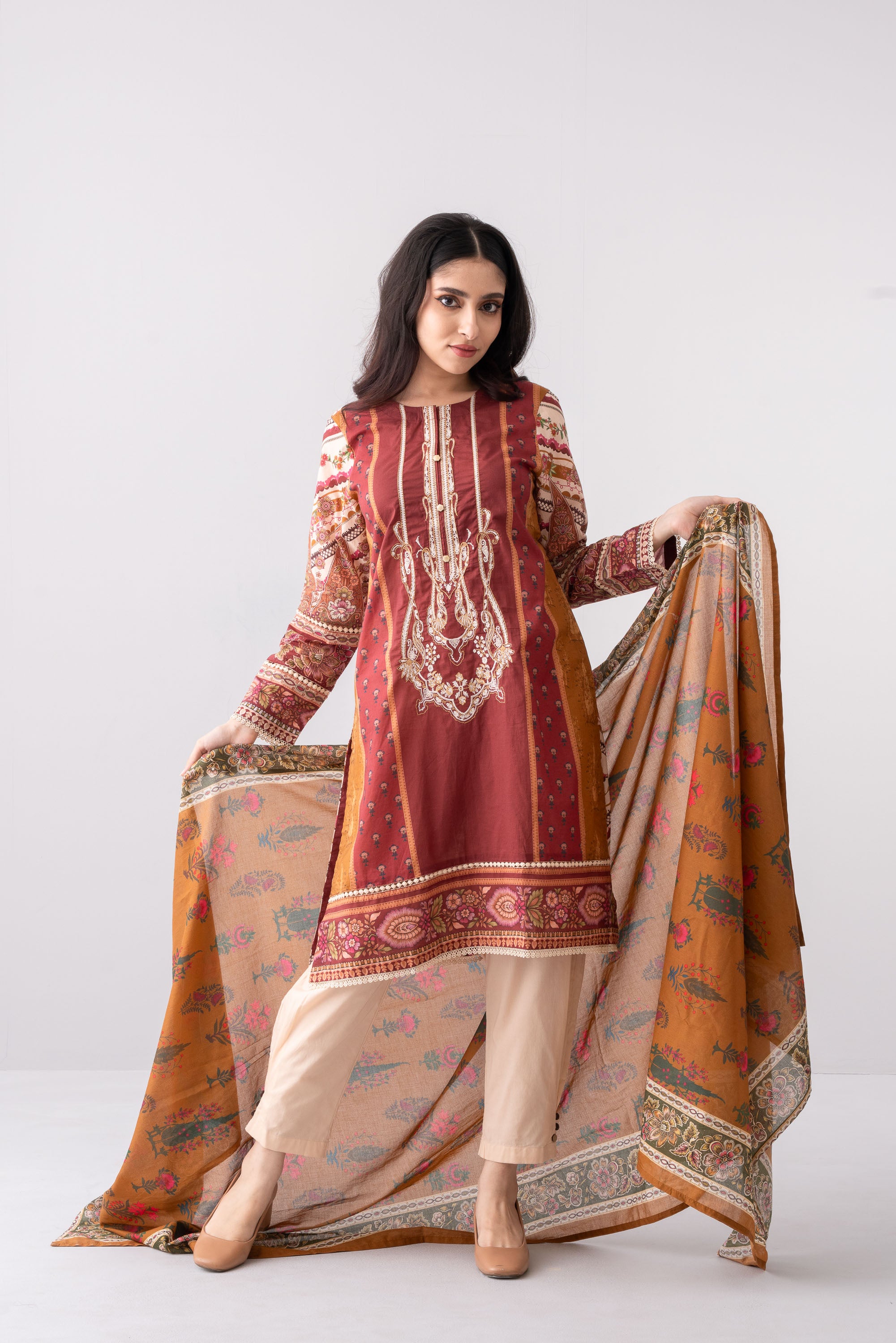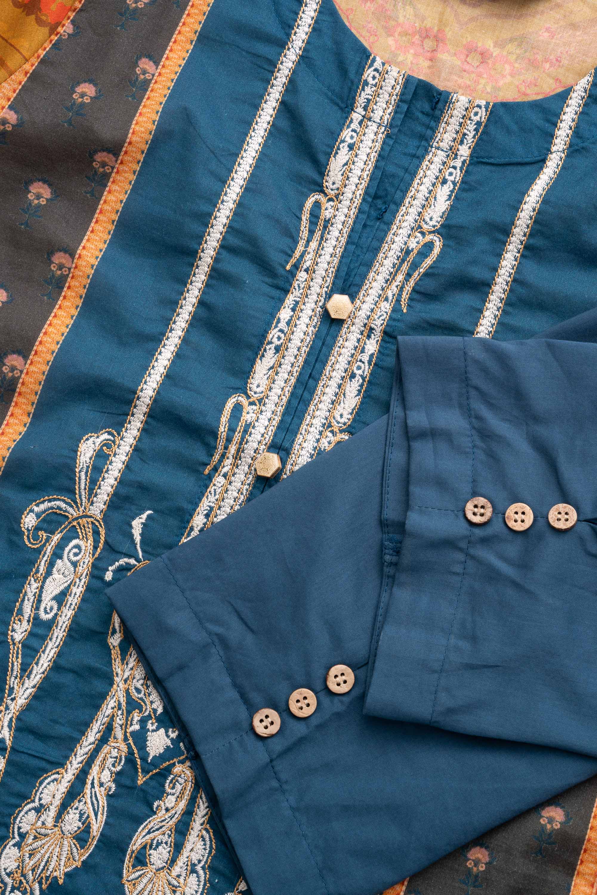 Elevate your elegance with our stunning ready-to-wear 3 Piece Lawn Salwar Kameez Suit with cotton dupatta and solid dyed trouser embellished with embroidery, decorative lace, decorative button detailing that exudes elegance and sophistication, perfect for special occasions or adds luxury to your everyday wardrobe.