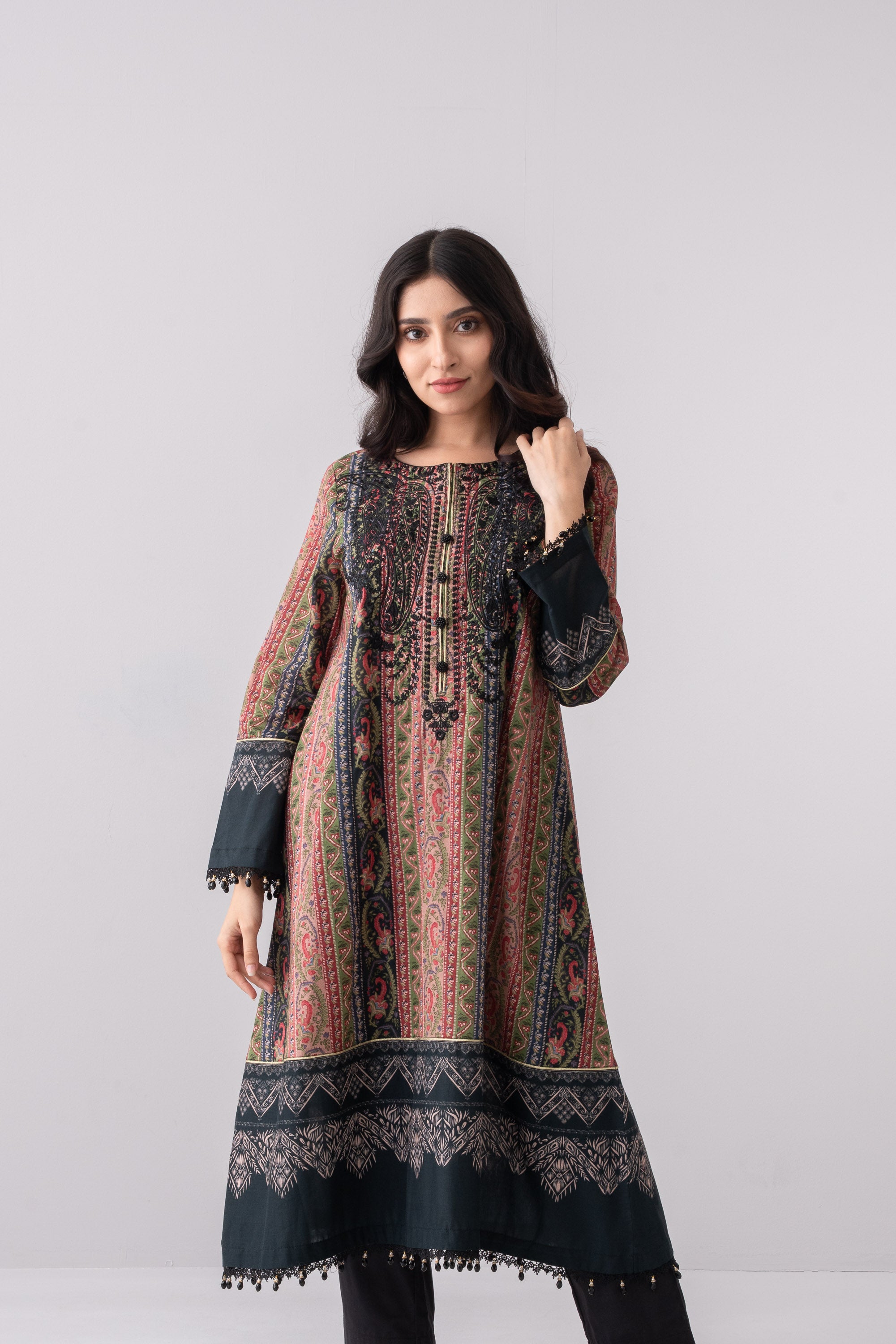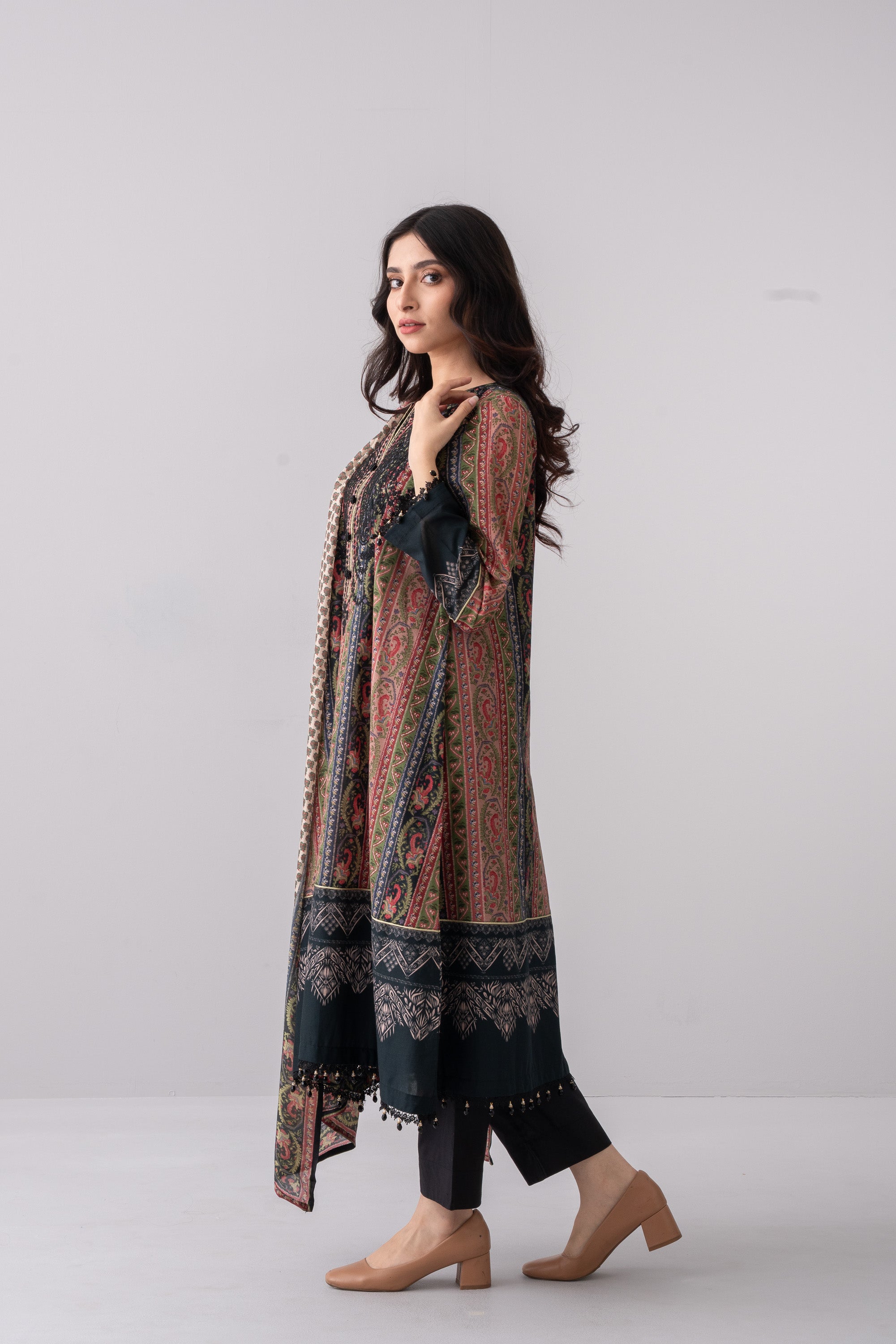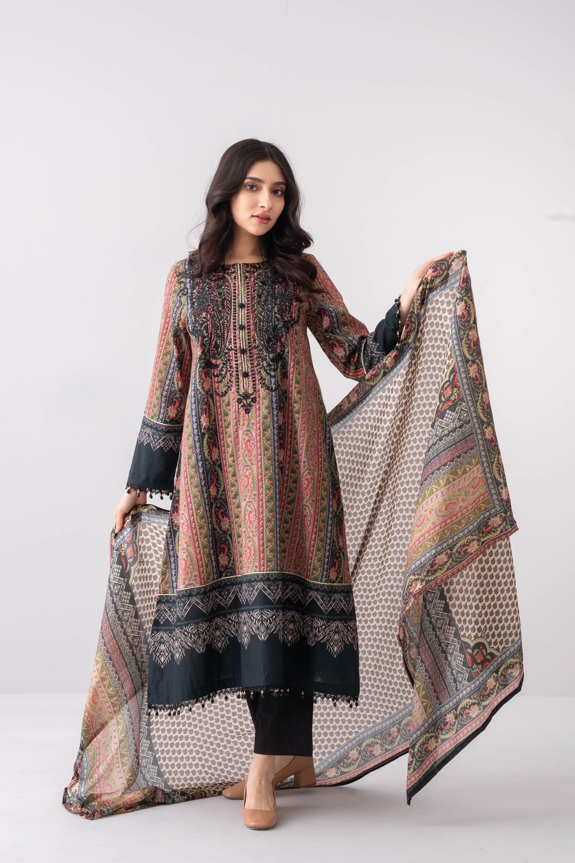 Elevate your elegance with our stunning ready-to-wear 3 Piece Lawn Salwar Kameez Suit with silk dupatta and solid dyed trouser embellished with embroidery, decorative button, lace, and beads detailing that exudes elegance and sophistication, perfect for special occasions or adds luxury to your everyday wardrobe.
