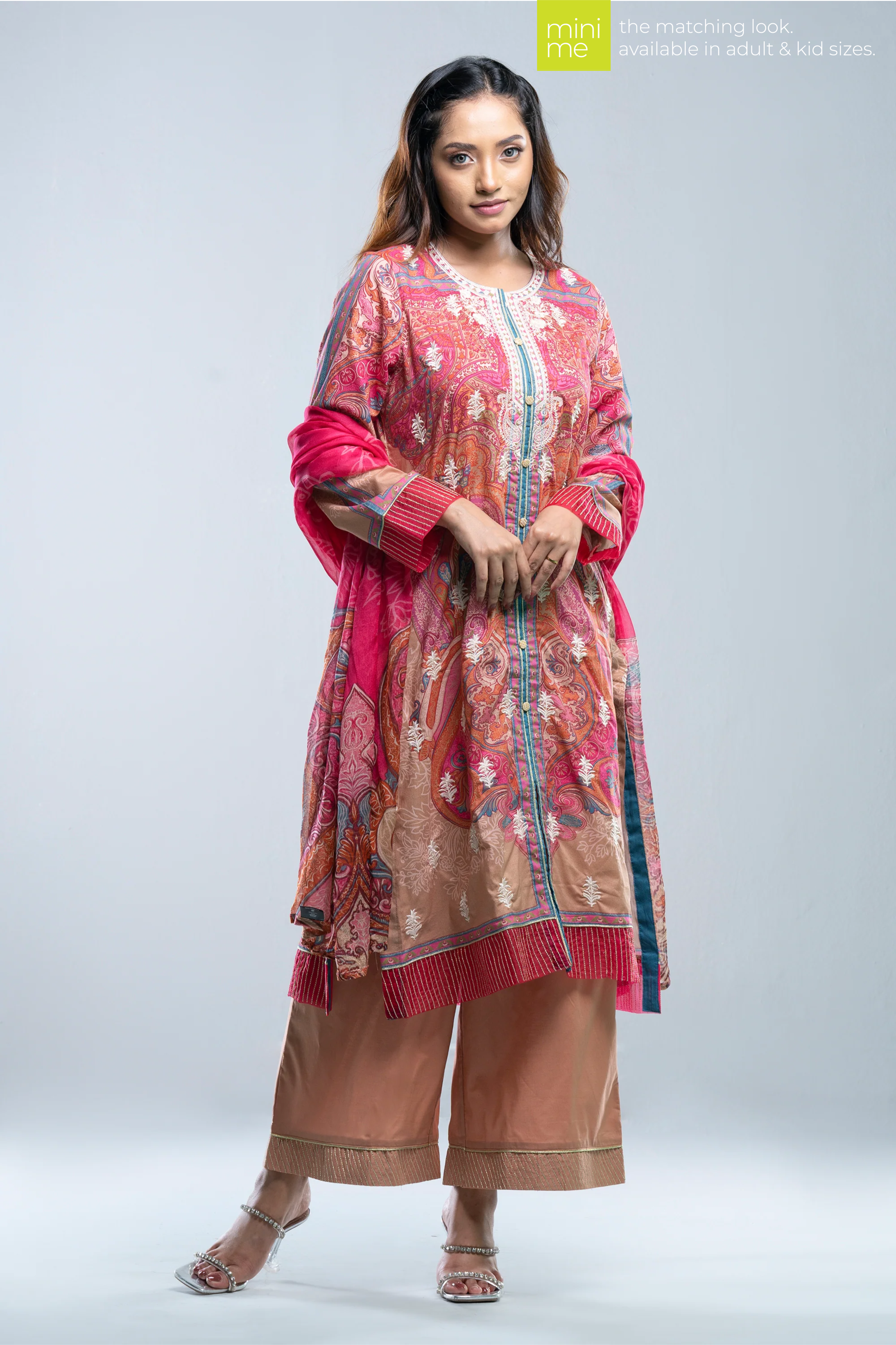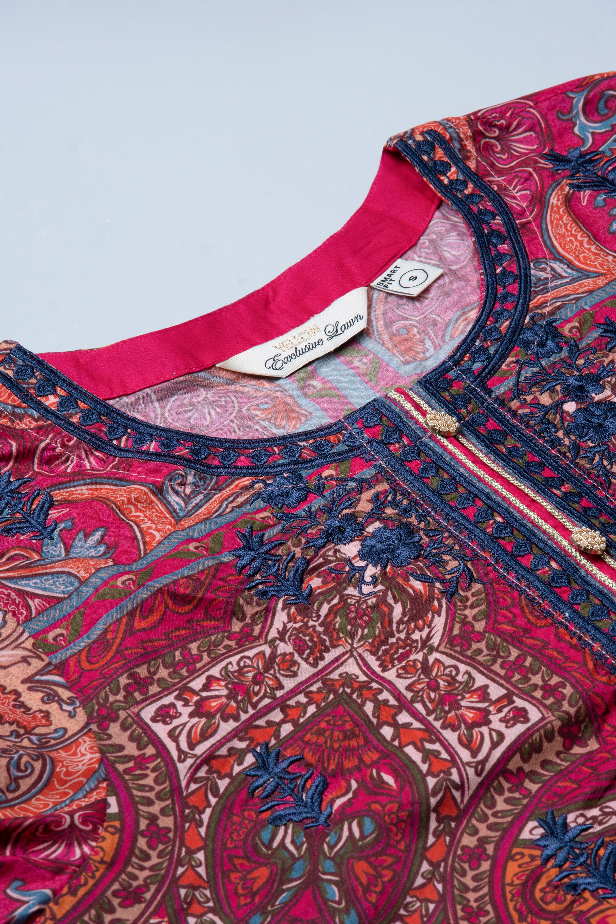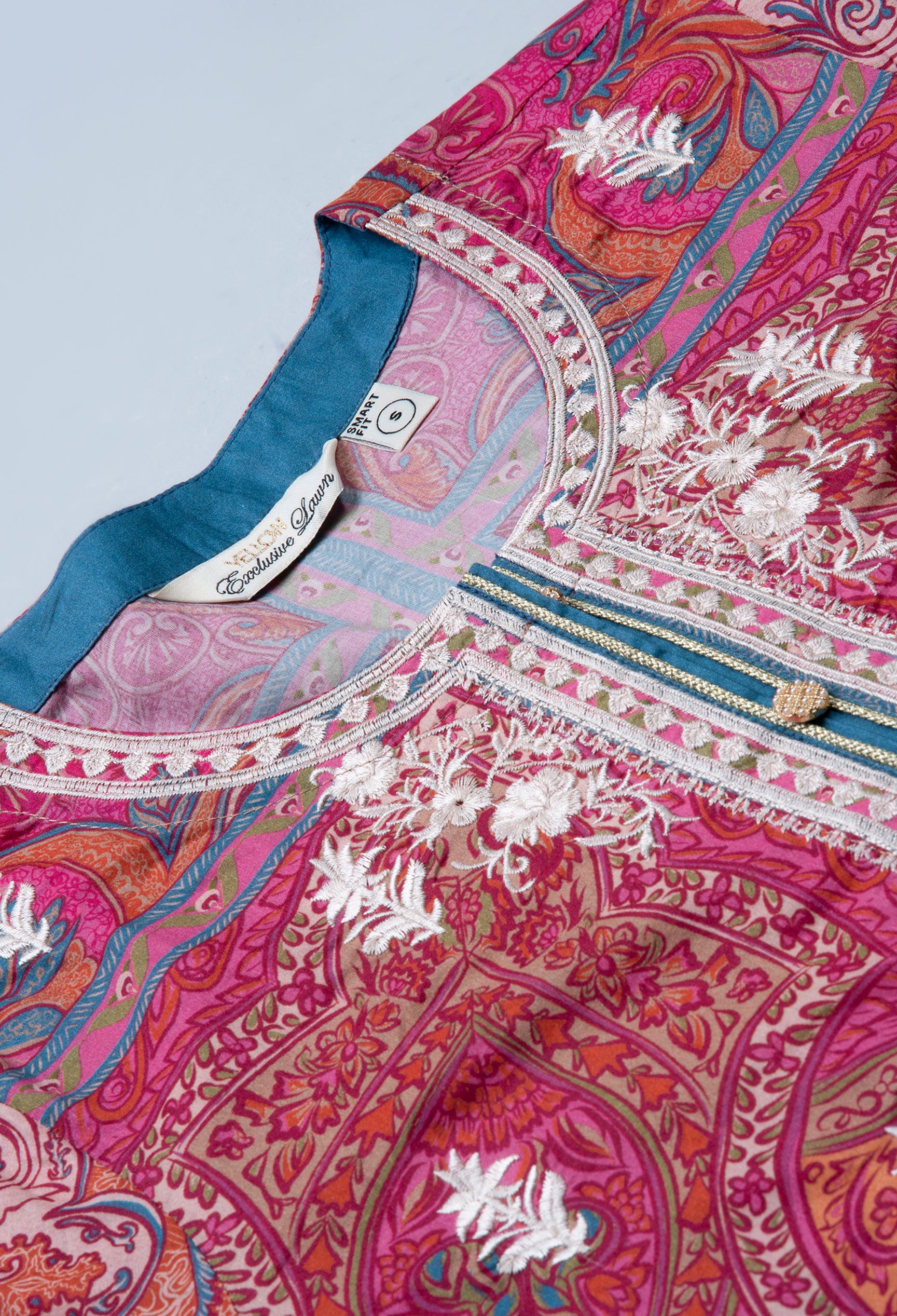 Elevate your elegance with our stunning ready-to-wear 3 Piece Lawn Salwar Kameez Suit with chffon dupatta and solid dyed trouser embellished with full front embroidery, decorative lace, decorative button and organza fabric detailing with lurex embroidery that exudes elegance and sophistication, perfect for special occasions or adds luxury to your everyday wardrobe.