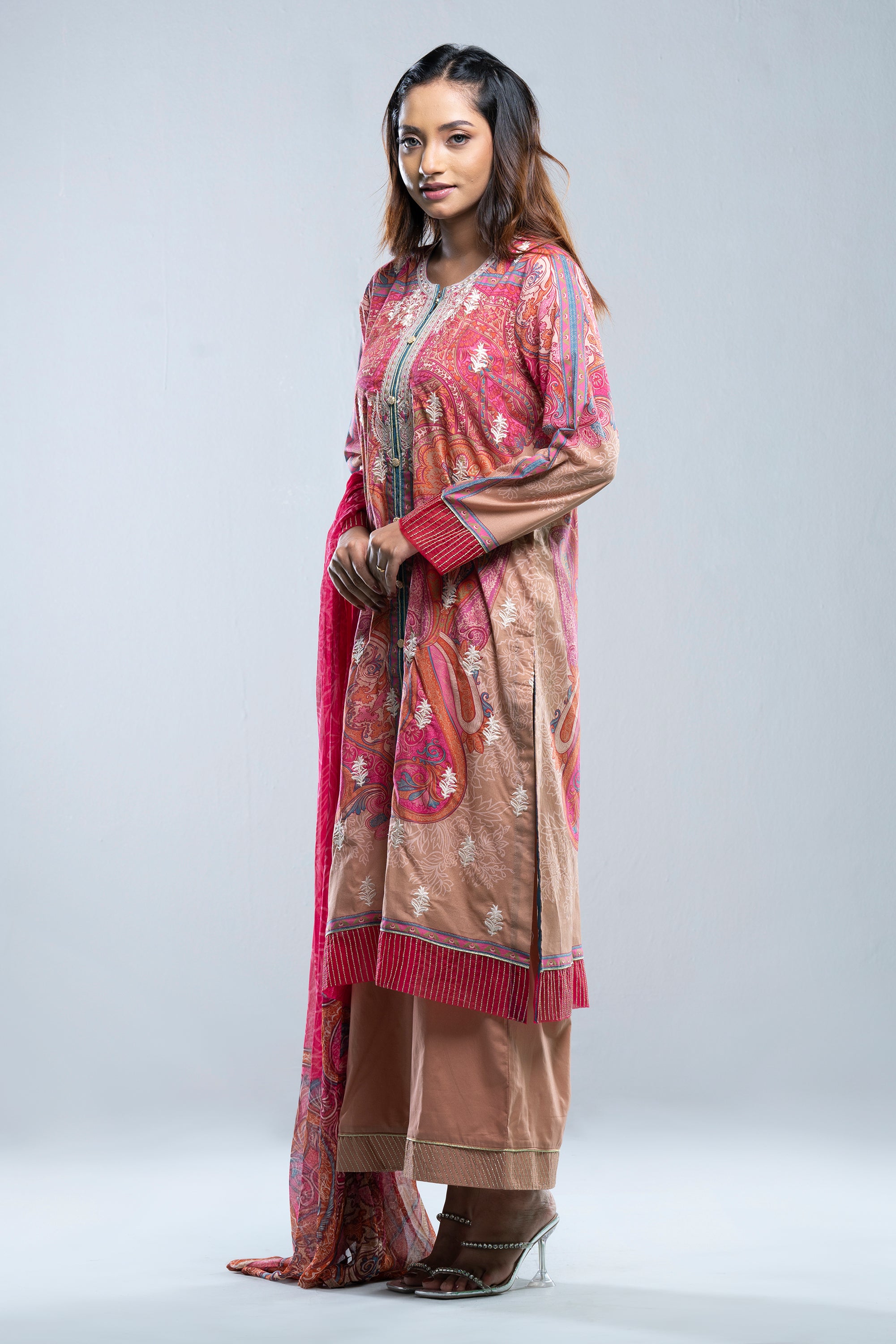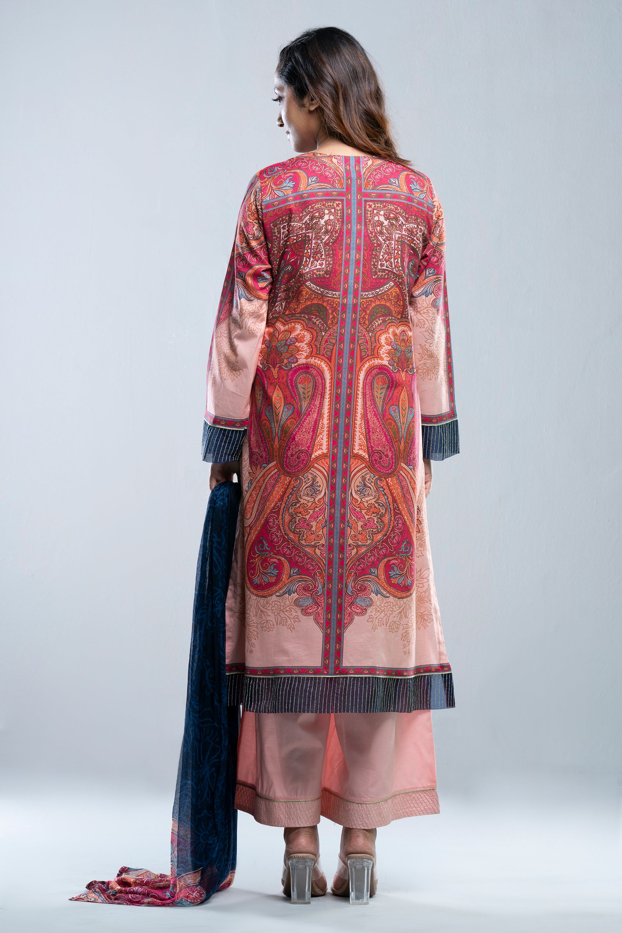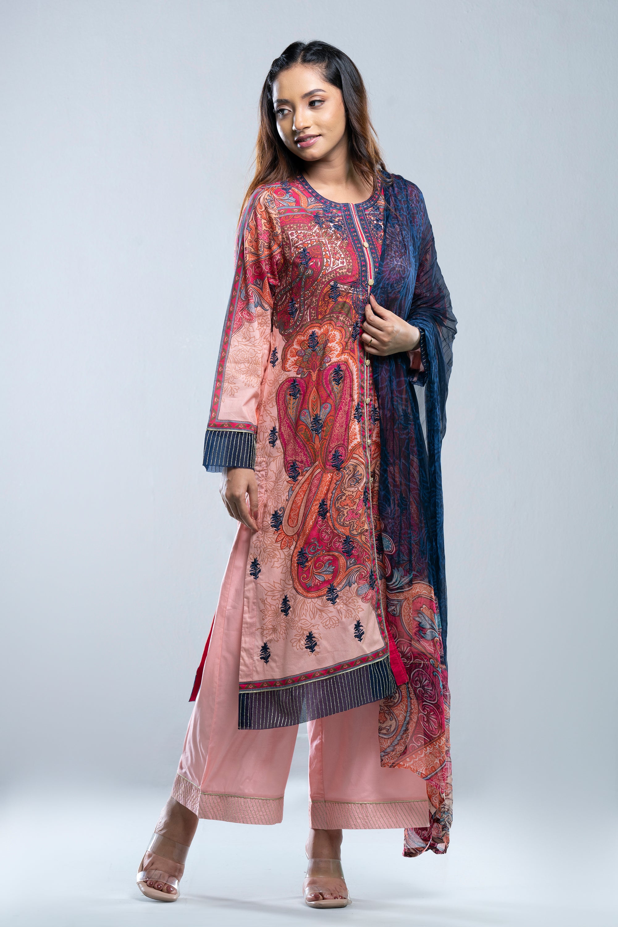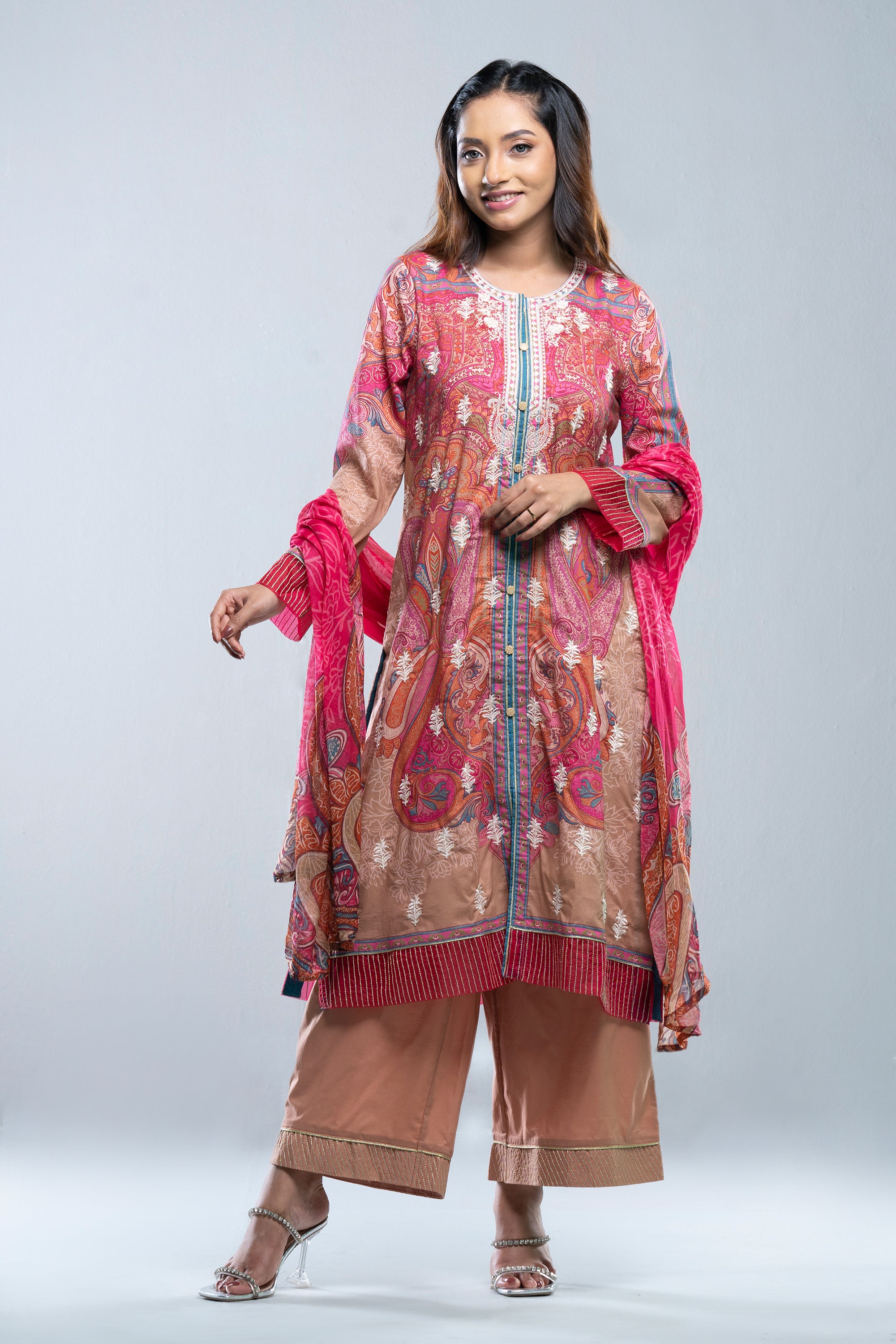 Elevate your elegance with our stunning ready-to-wear 3 Piece Lawn Salwar Kameez Suit with chffon dupatta and solid dyed trouser embellished with full front embroidery, decorative lace, decorative button and organza fabric detailing with lurex embroidery that exudes elegance and sophistication, perfect for special occasions or adds luxury to your everyday wardrobe.