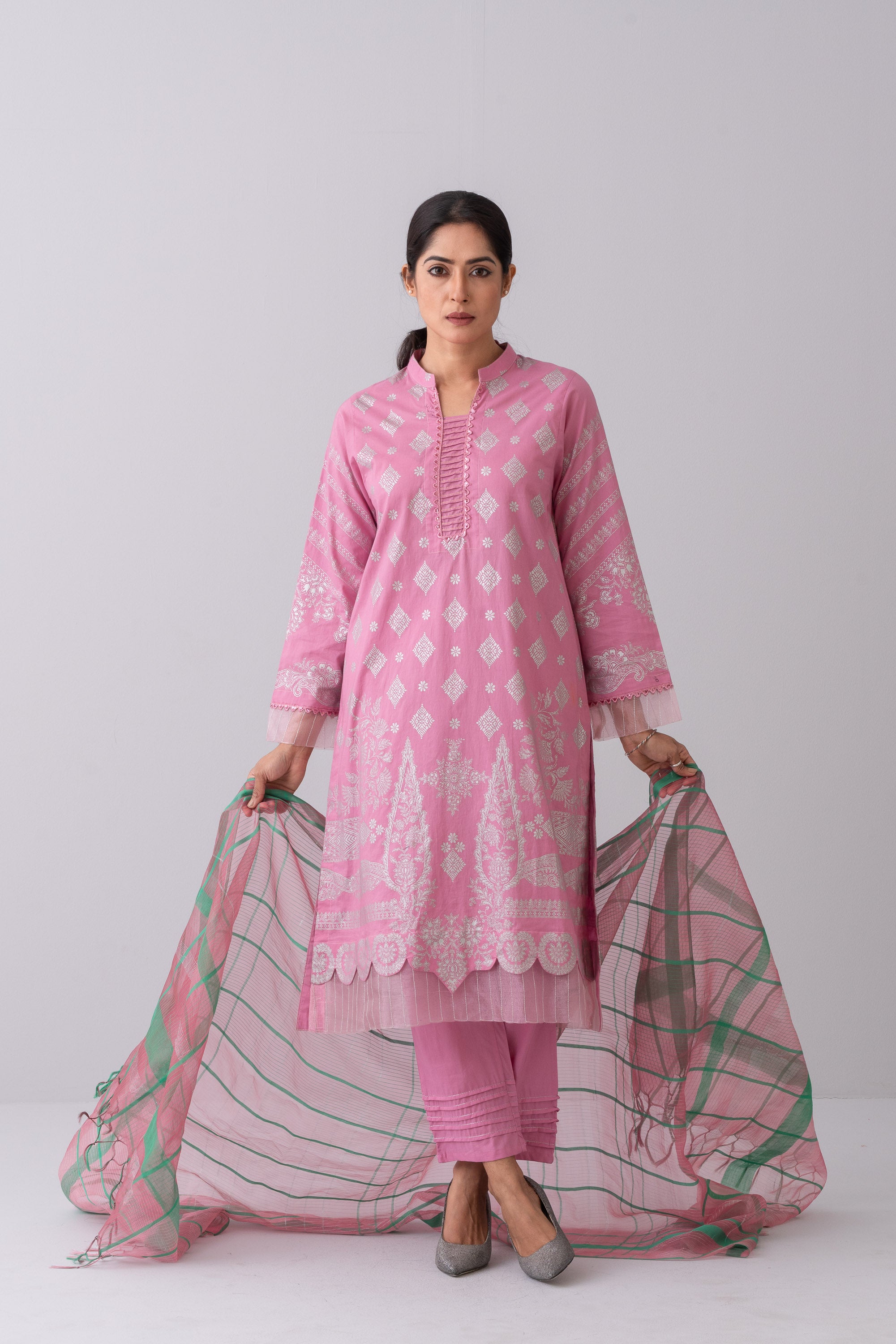 Elevate your elegance with our stunning ready-to-wear 3 Piece Lawn Salwar Kameez Suit, embellished with metallic print and intricate lurex embroidery on the front and sleeves. Accented with decorative lace and pintucks with golden lurex chain stitch detailing at neck, this ensemble is paired with a solid color relaxed pant and a luxurious handloom yarn dyed silk dupatta.Perfect for festive occasions or adding a sophisticated touch to your everyday wardrobe.
