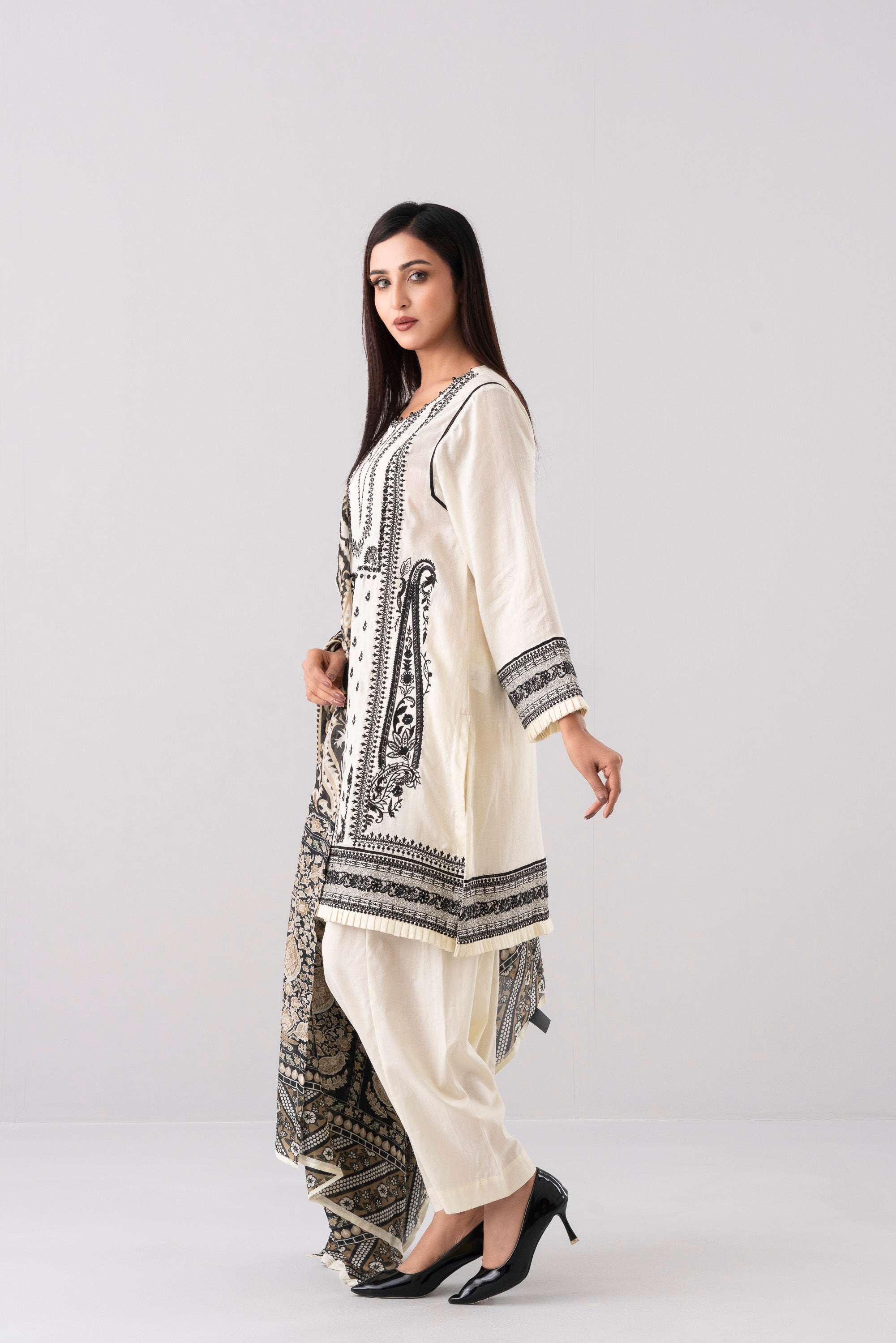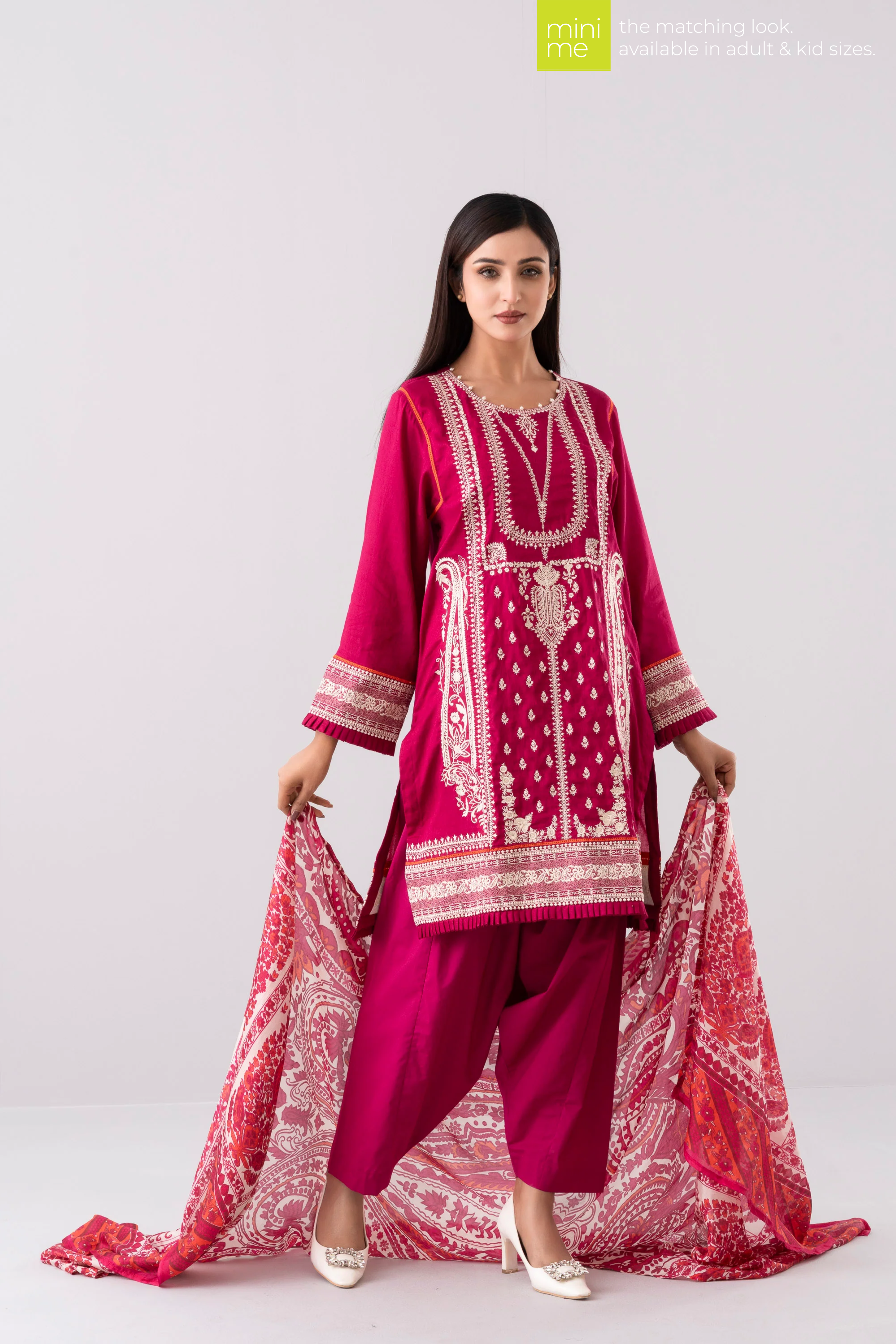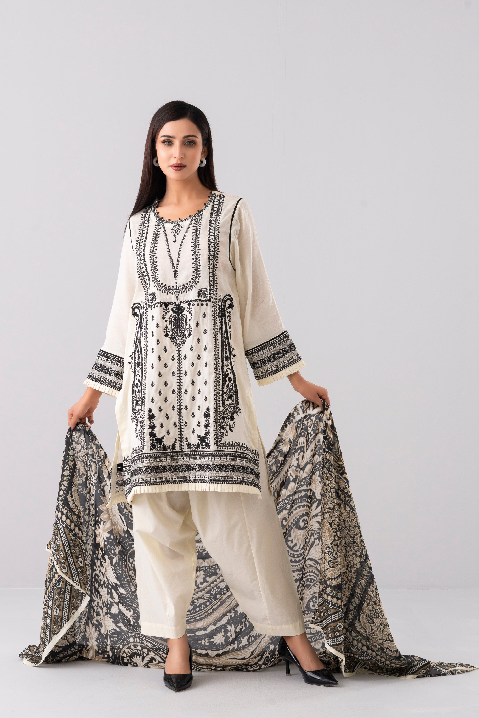 Elevate your elegance with our stunning ready-to-wear 3-Piece Lawn Jacquard Salwar Kameez Suit, beautifully adorned with full front embroidery and delicate decorative lace. Designed with full sleeves featuring self-fabric pleats and an embroidered border, and tailored in a relaxed fit with a square armhole, the kameez is finished with a gracefully embellished neckline with pearl accents. Paired with a solid dyed salwar and a luxurious silk dupatta, this ensemble is perfect for festive occasions or for adding timeless sophistication to your everyday wardrobe.