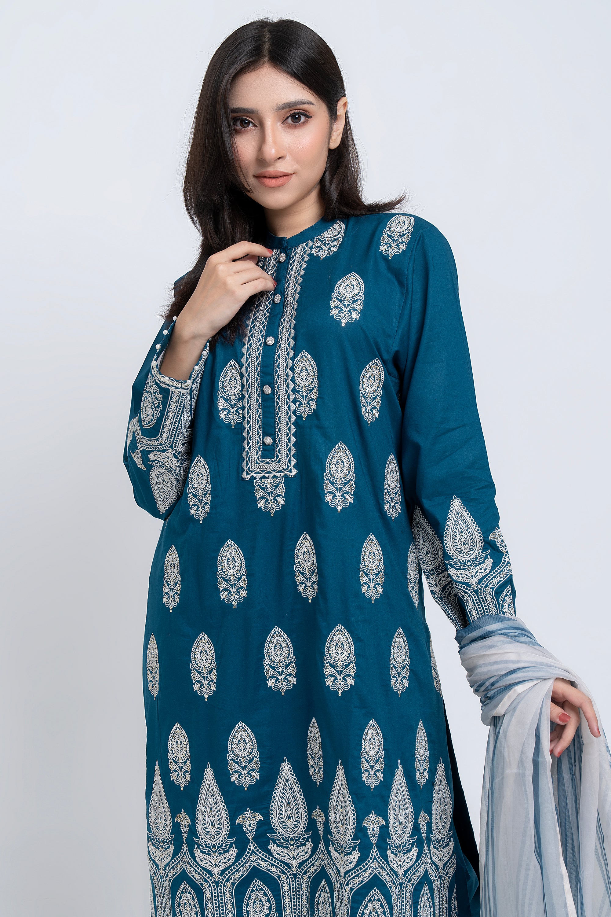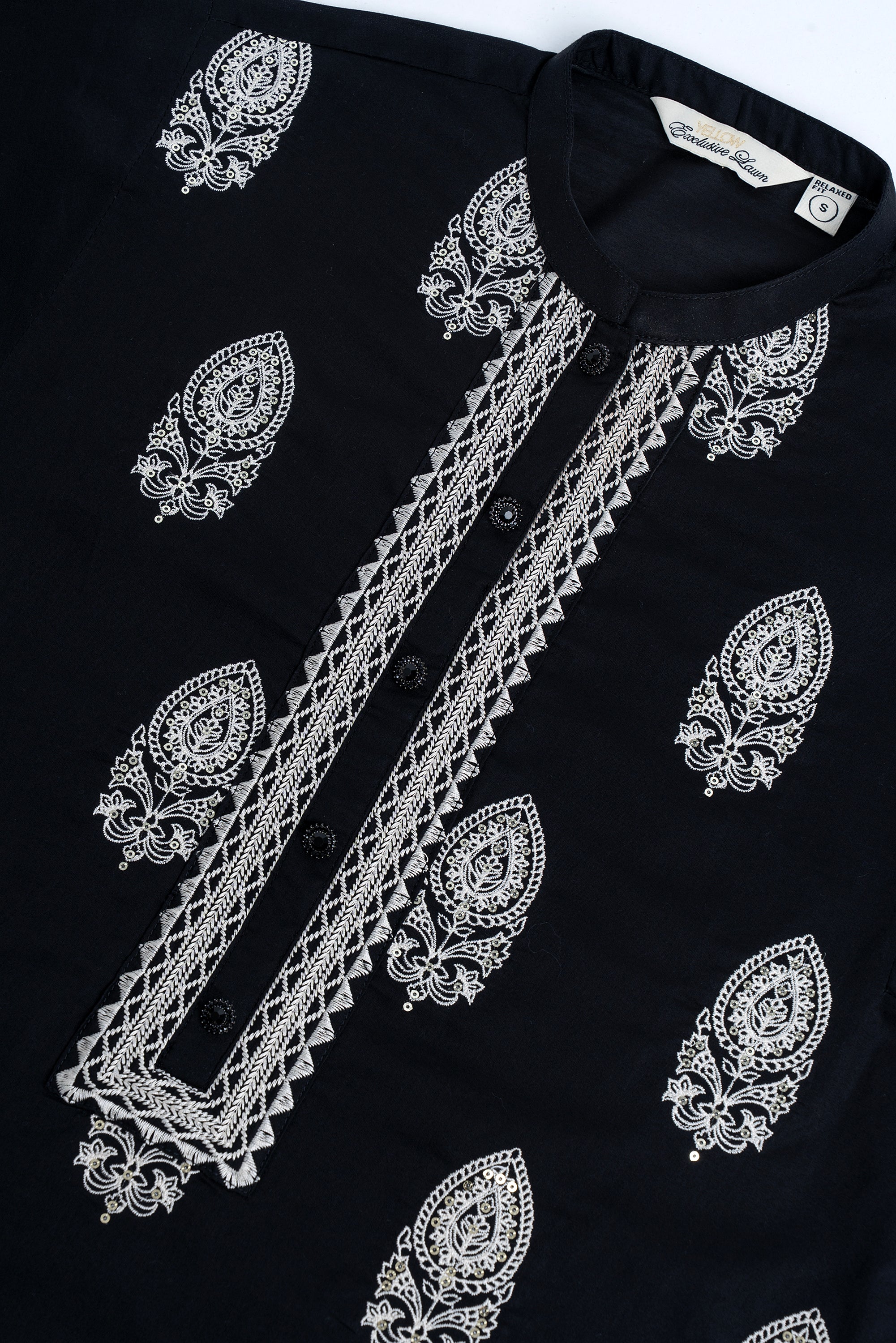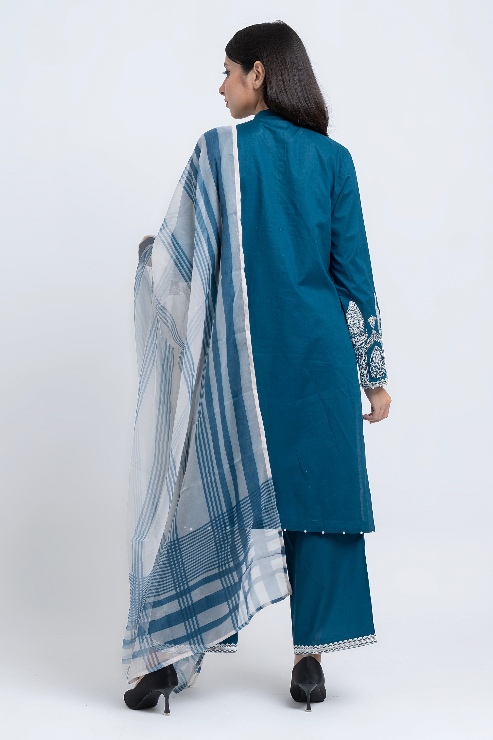 Elevate your elegance with our stunning ready-to-wear 3-Piece Lawn Salwar Kameez Suit, beautifully adorned with full front sequins embroidery. Designed with full sleeves featuring embroidered border and beads detailing, and tailored in a relaxed fit with a square armhole, the kameez is finished with a gracefully embellished neckline with decorative buttons.Paired with a solid dyed relaxed pant embellished with embroidered border and a luxurious printed organza dupatta, this ensemble is perfect for festive occasions or for adding timeless sophistication to your everyday wardrobe.